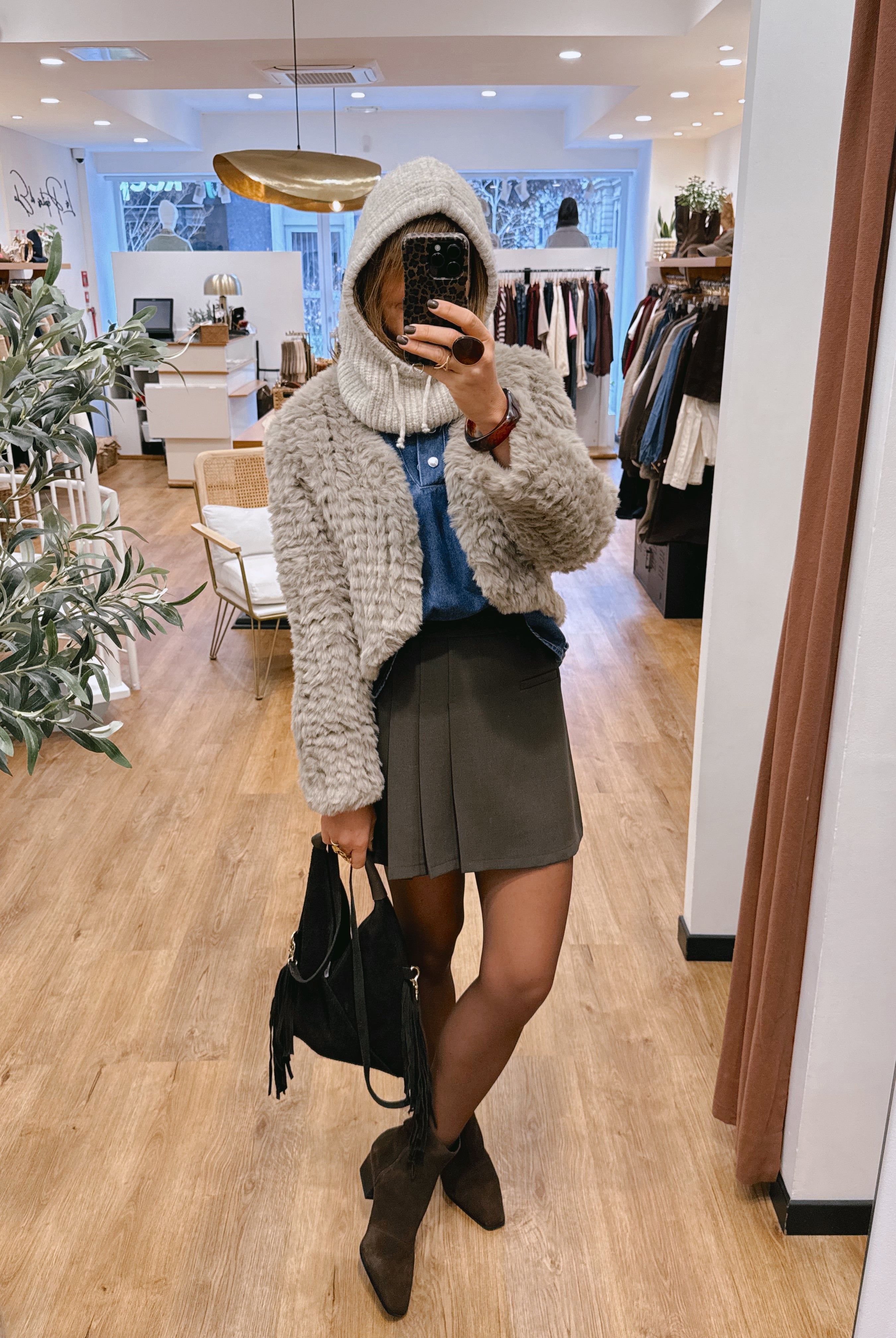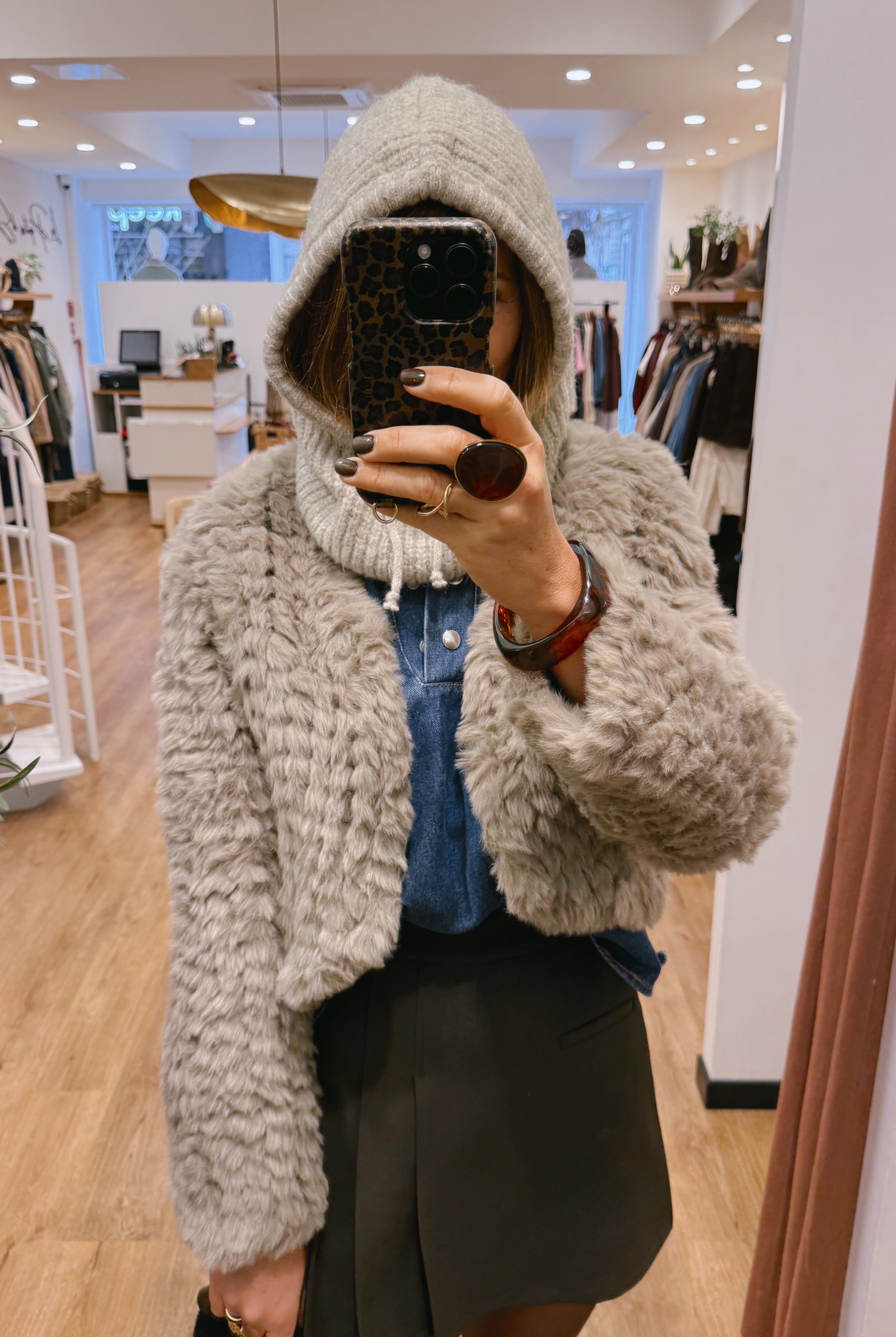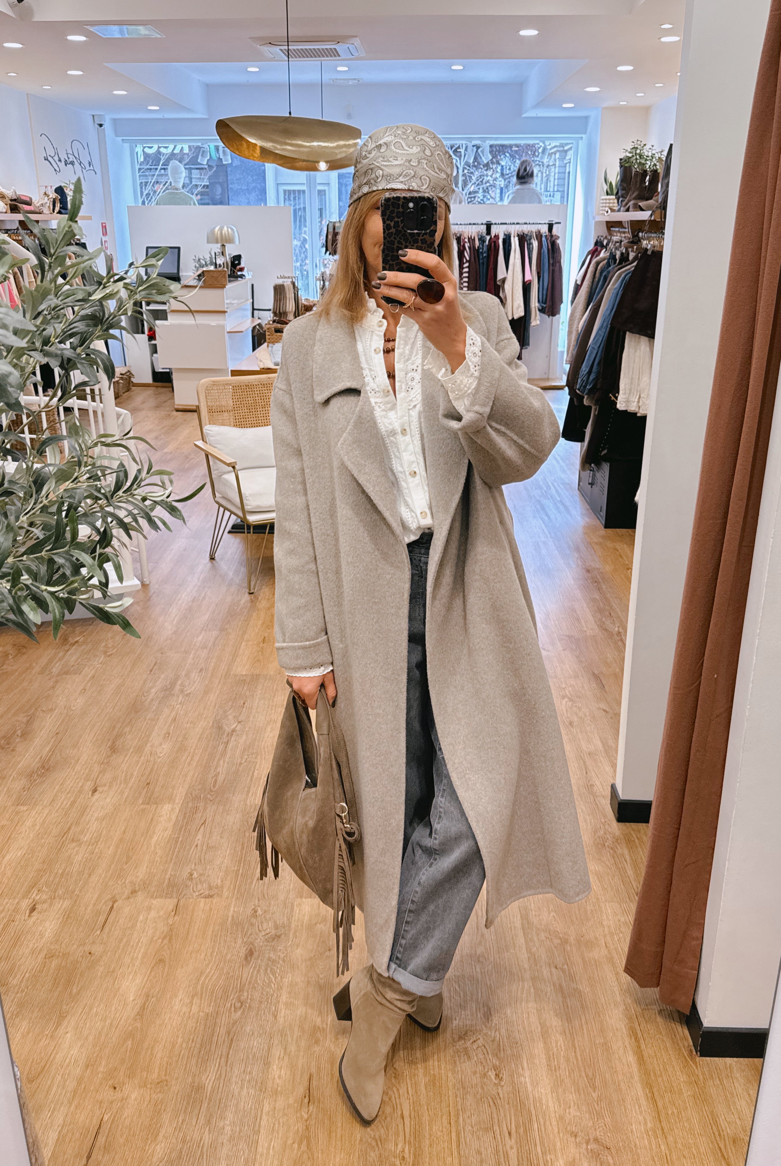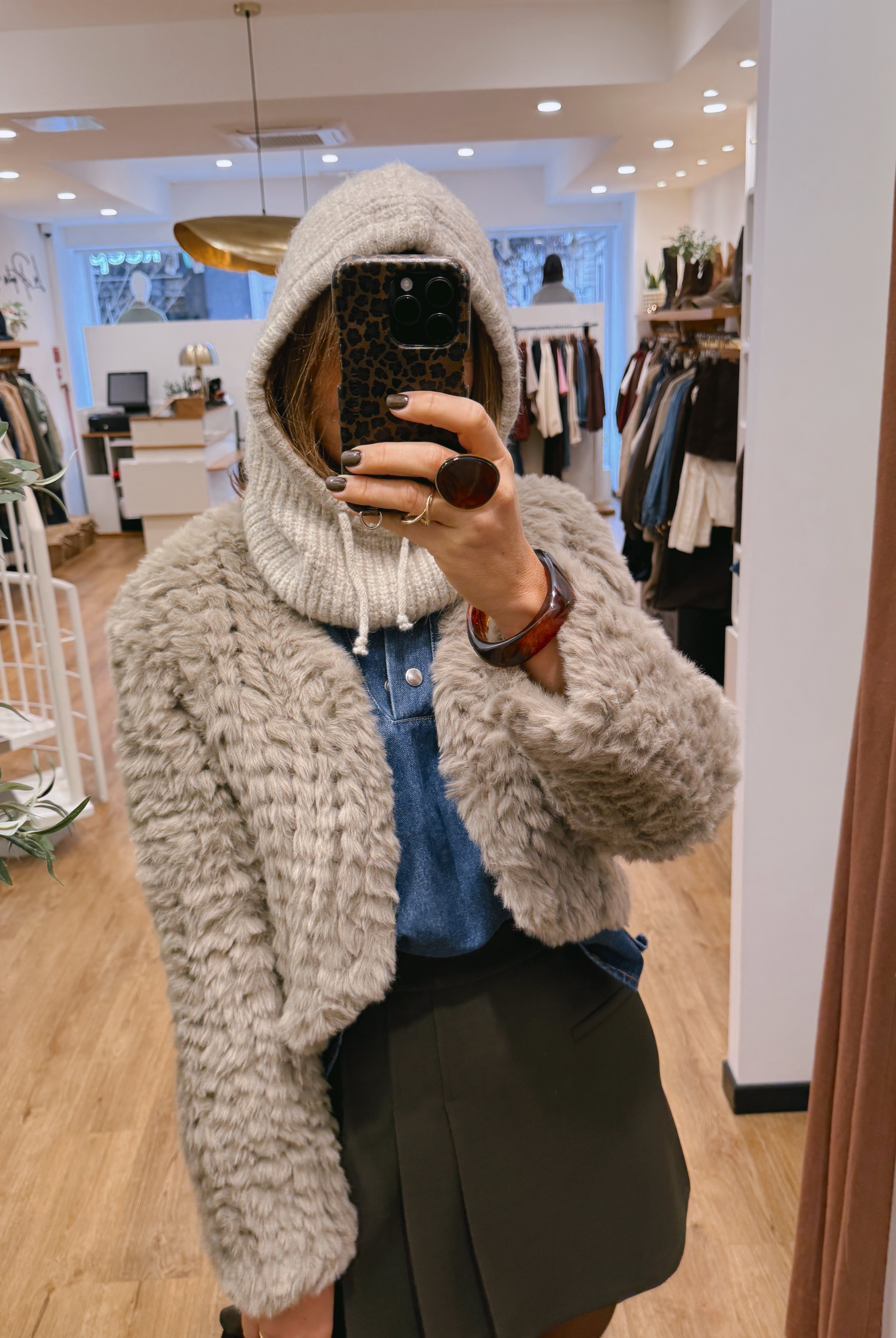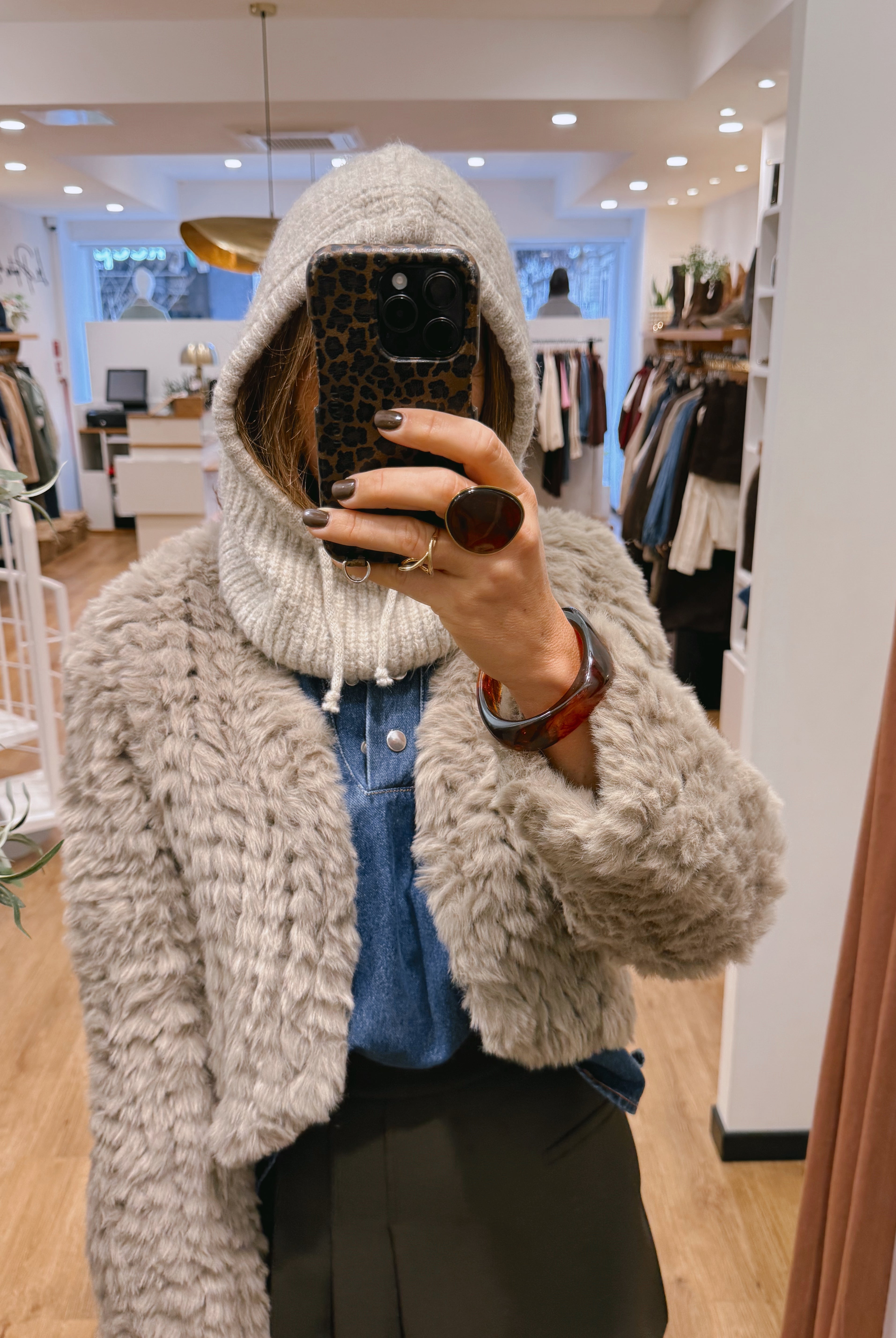 Chaque look joue sur les superpositions et les textures : maille moelleuse, fausse fourrure, suédine et coton épais. Les accessoires : foulards imprimés, sacs en daim à franges et bottines viennent parfaire cette atmosphère douce et réconfortante.