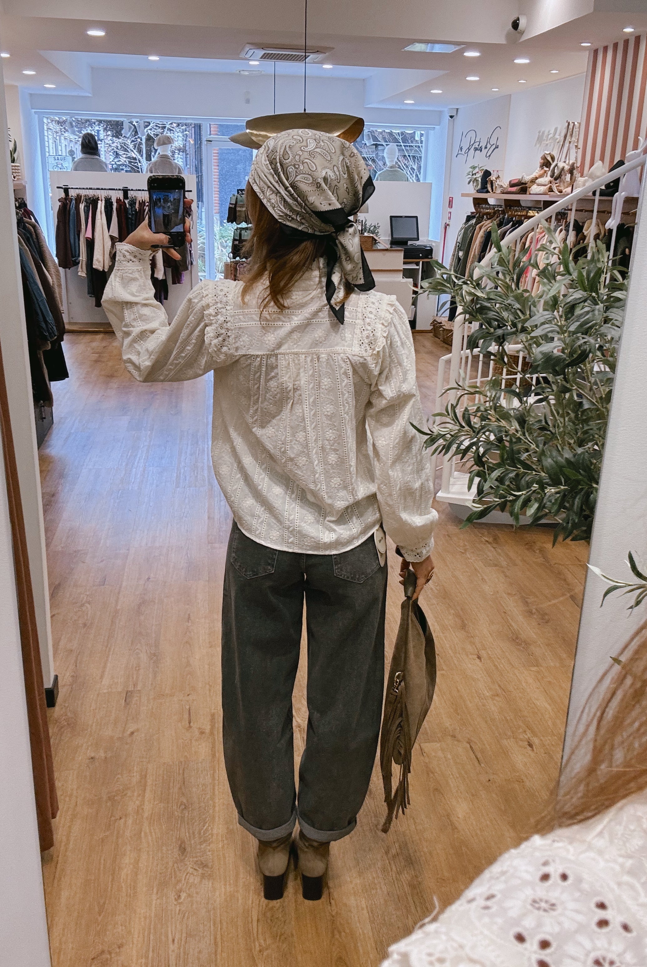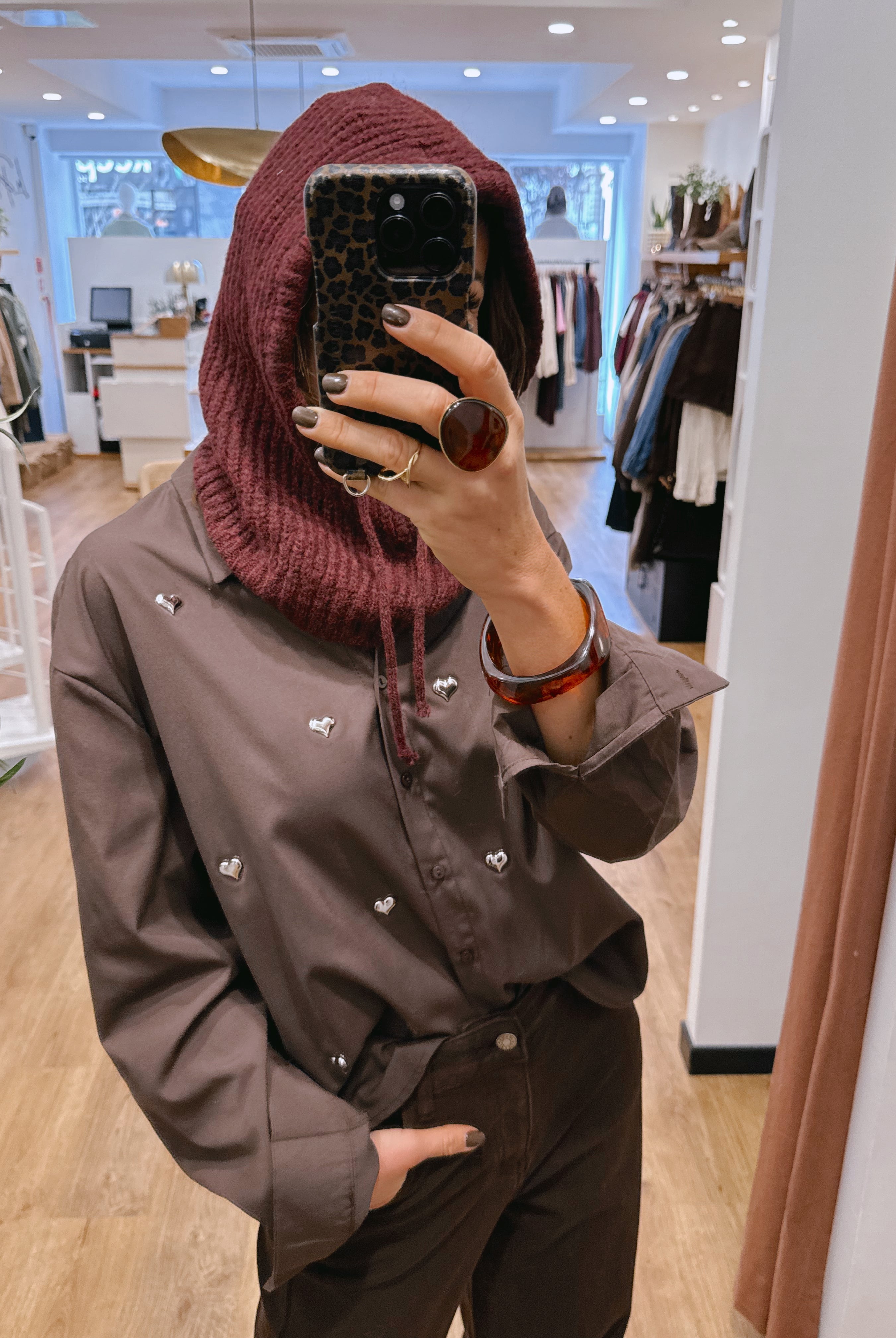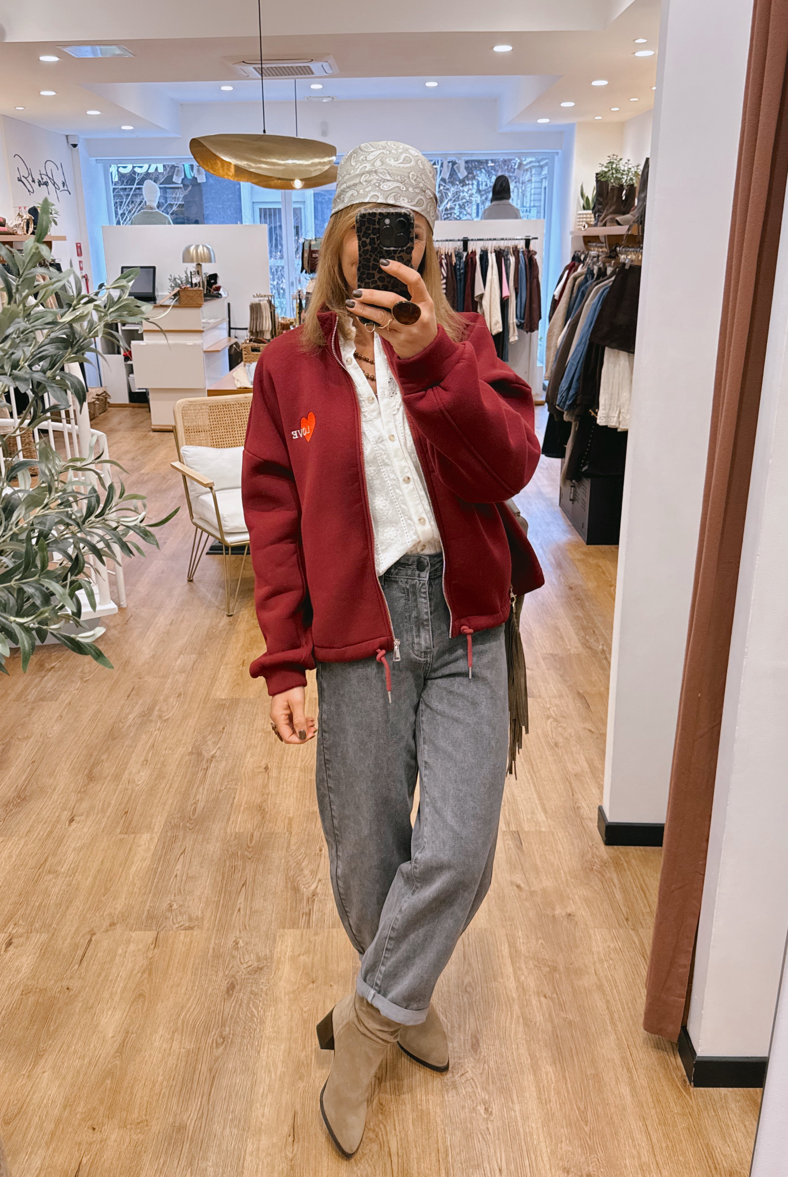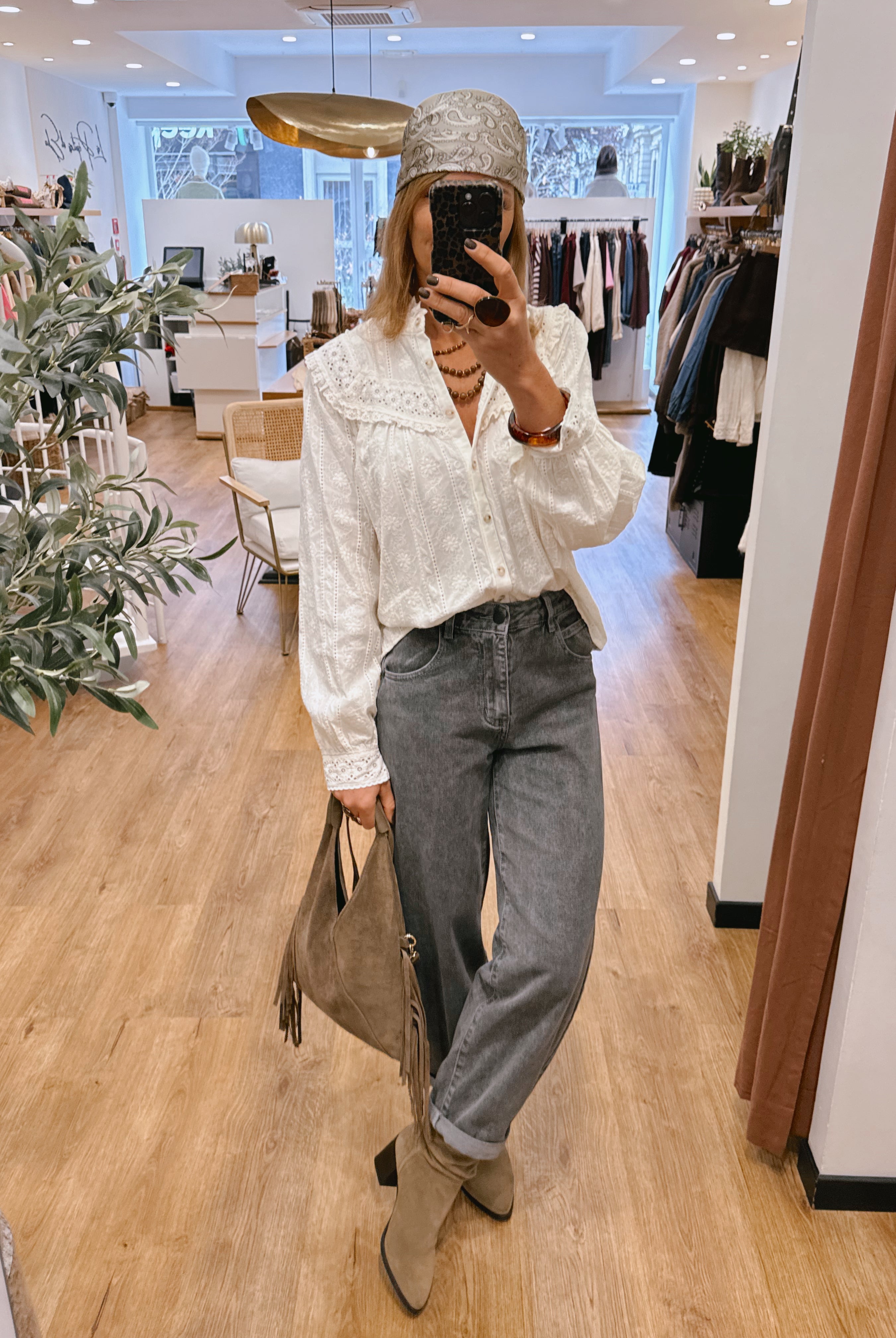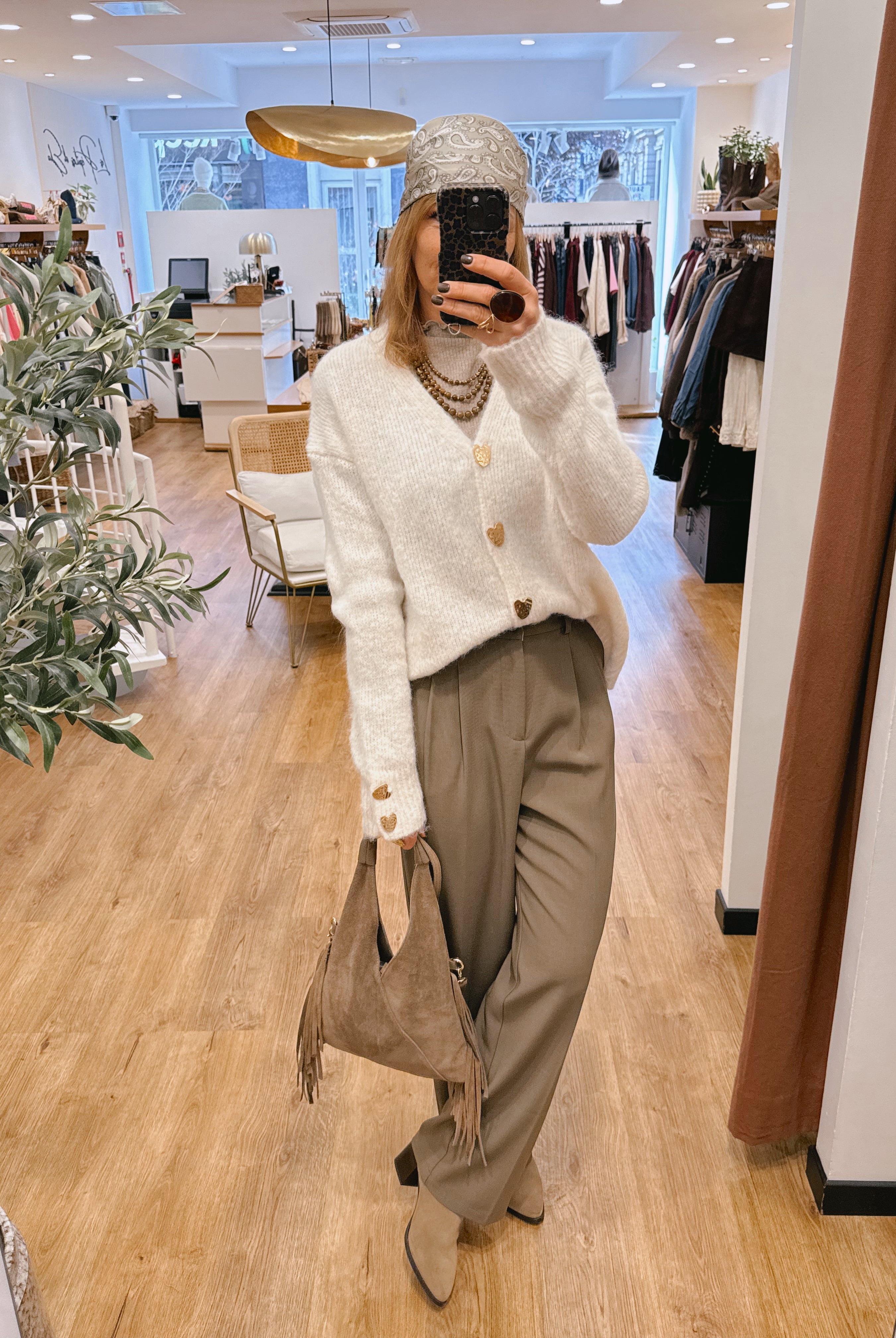 Chaque look joue sur les superpositions et les textures : maille moelleuse, fausse fourrure, suédine et coton épais. Les accessoires : foulards imprimés, sacs en daim à franges et bottines viennent parfaire cette atmosphère douce et réconfortante.