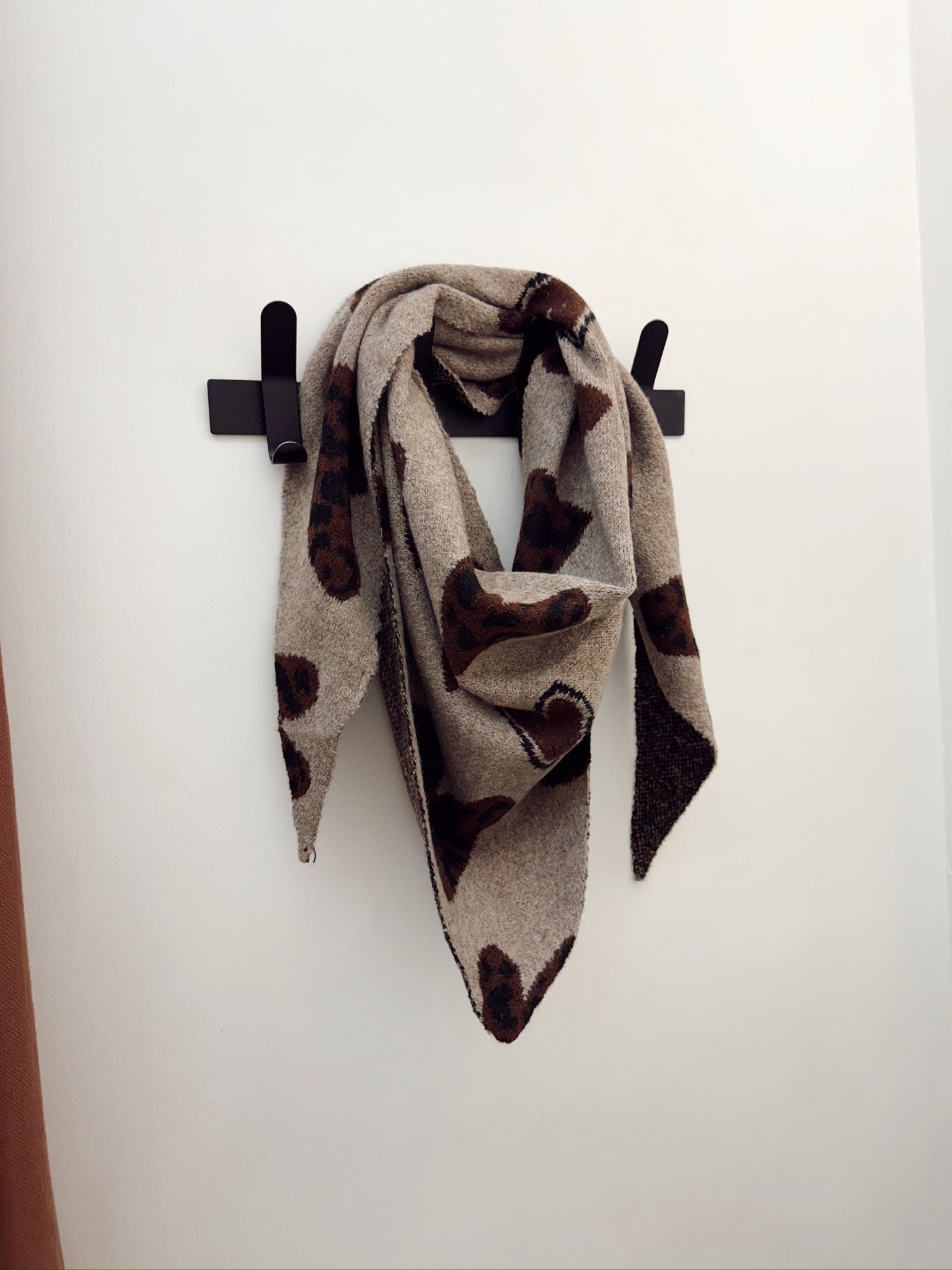 Apportez une touche de style et de chaleur à vos tenues avec cette écharpe triangulaire à motif animal. Conçue dans une maille douce et confortable, elle est idéale pour affronter les journées fraîches tout en restant élégante