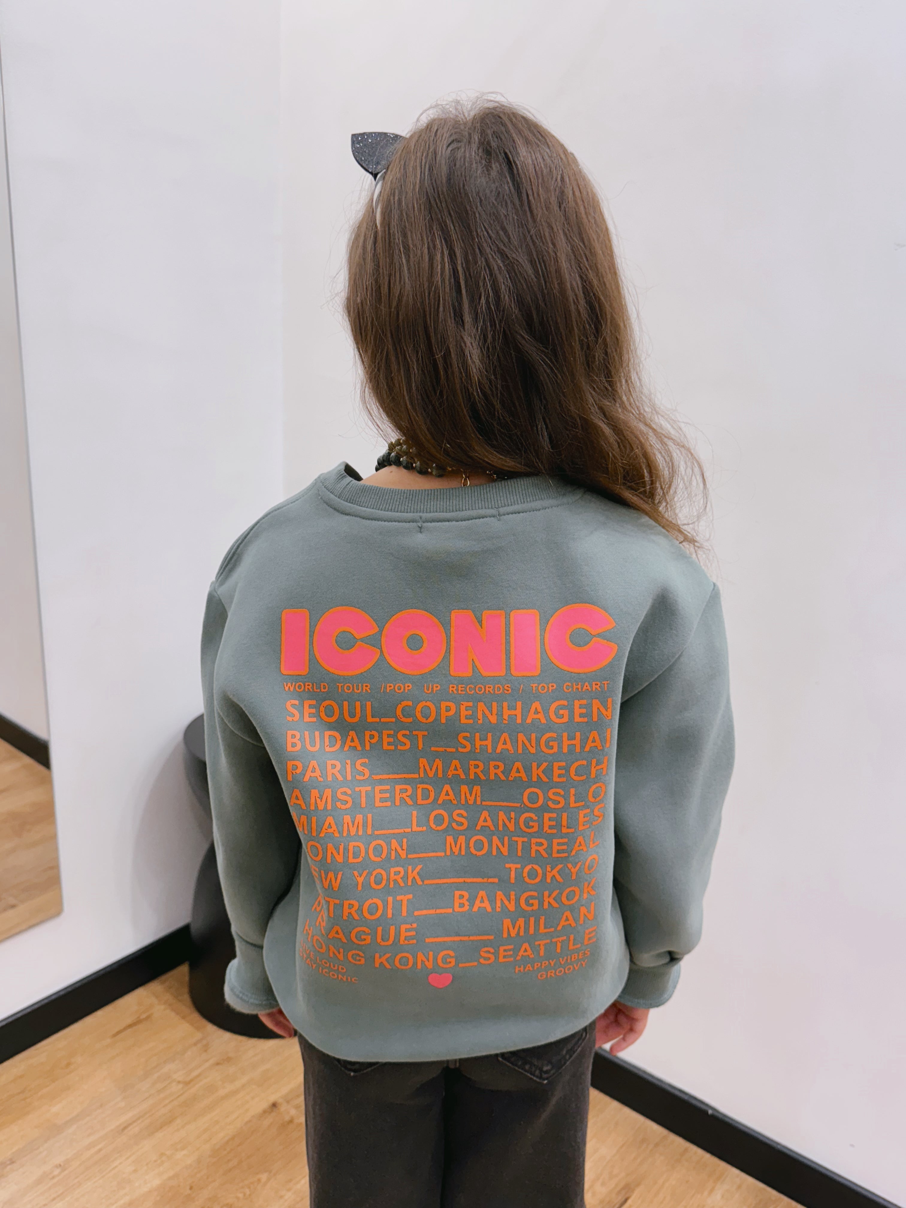 Message "Iconic" en sérigraphie rose sur le devant et plusieurs villes dans le dos