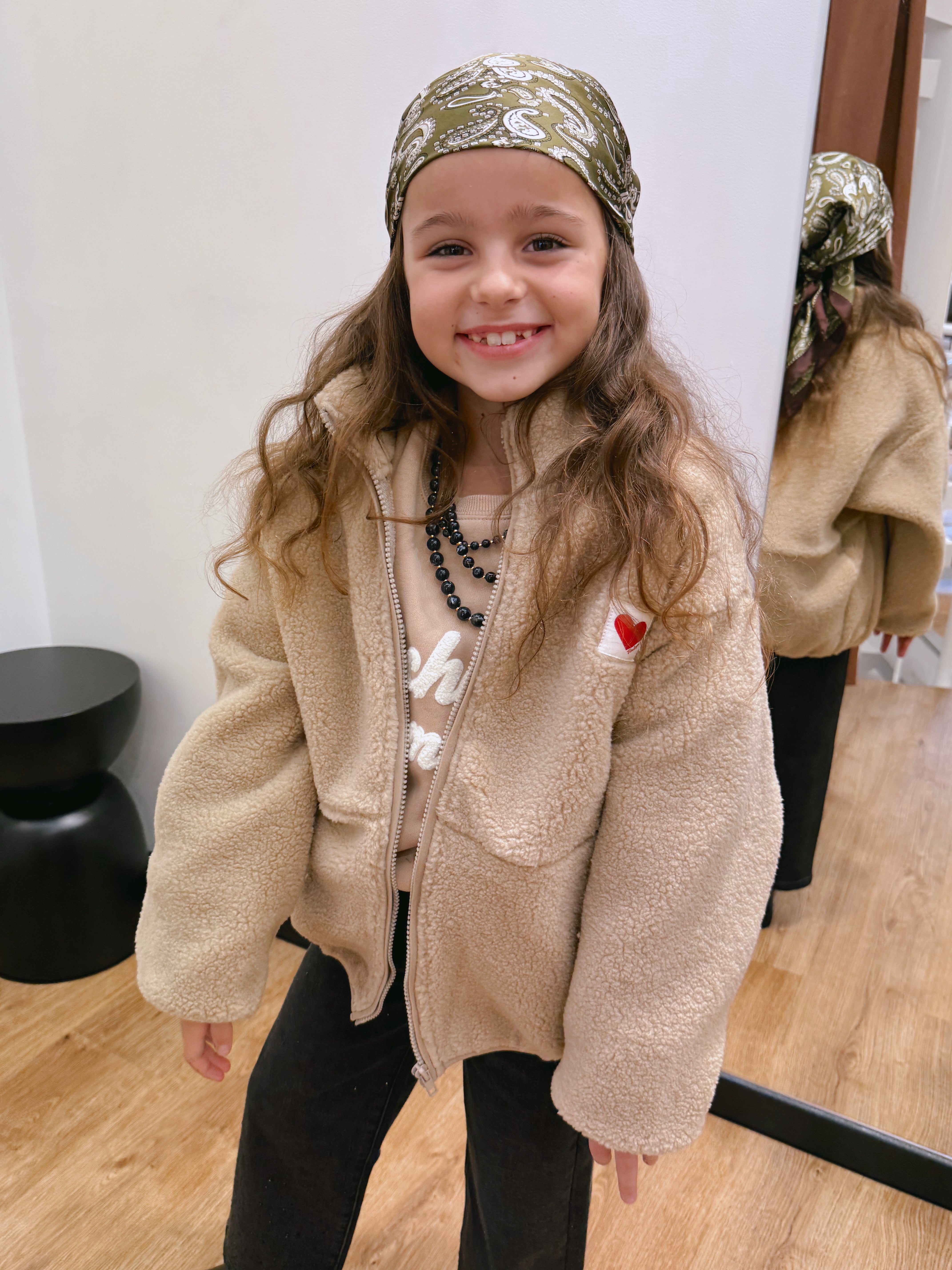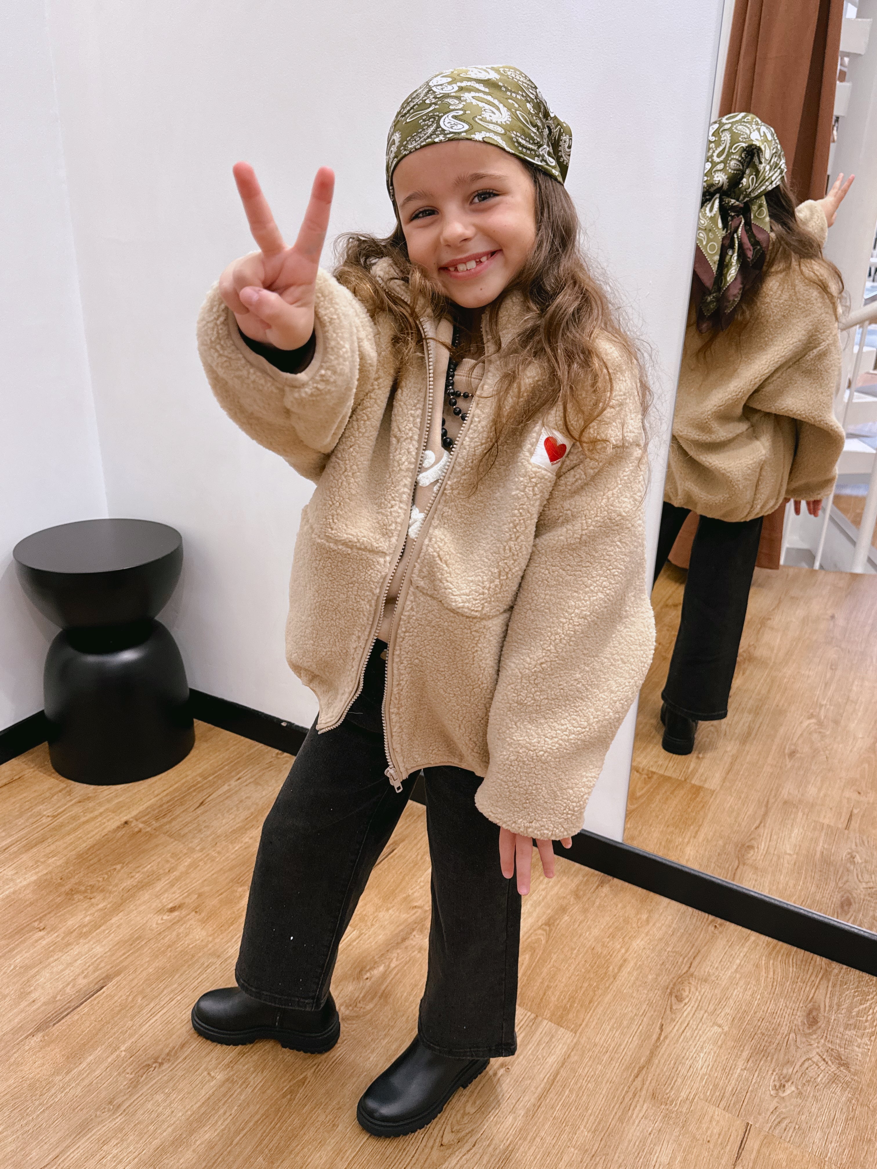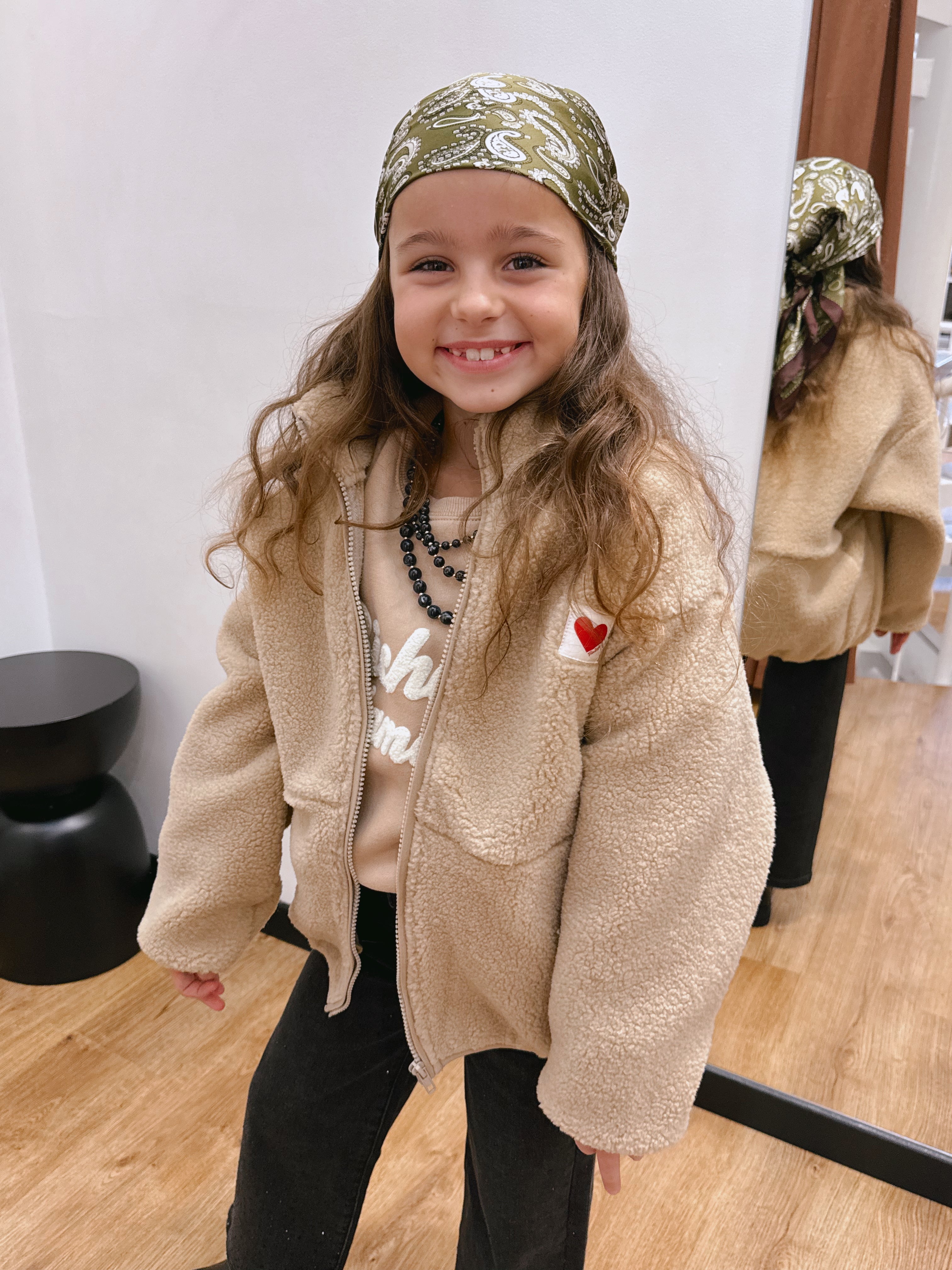 Elle possède deux grandes poches côtés très pratiques, un zip intégral, et une étiquette cœur brodée sur la poitrine qui lui donne une touche à la fois tendre et moderne.