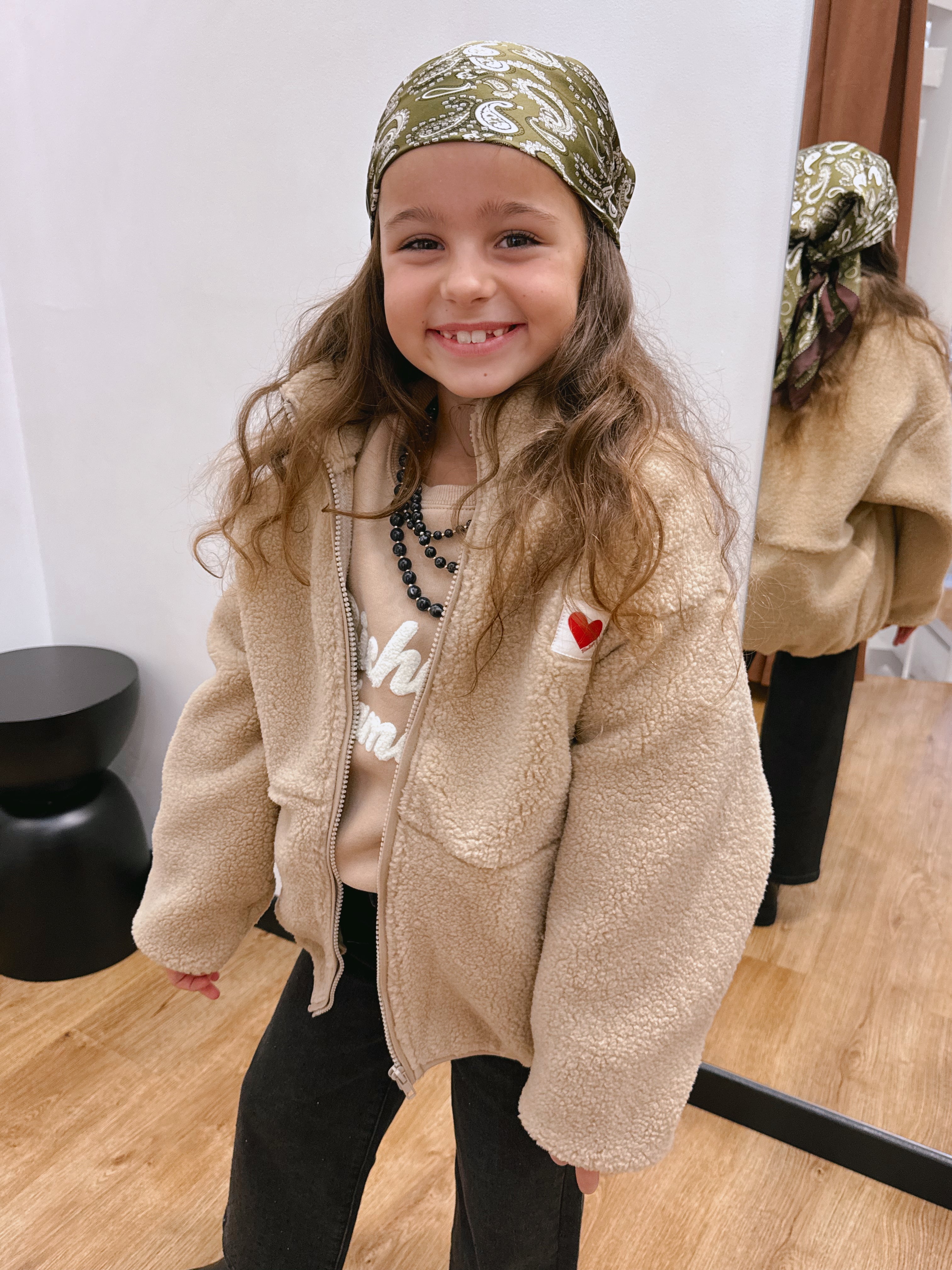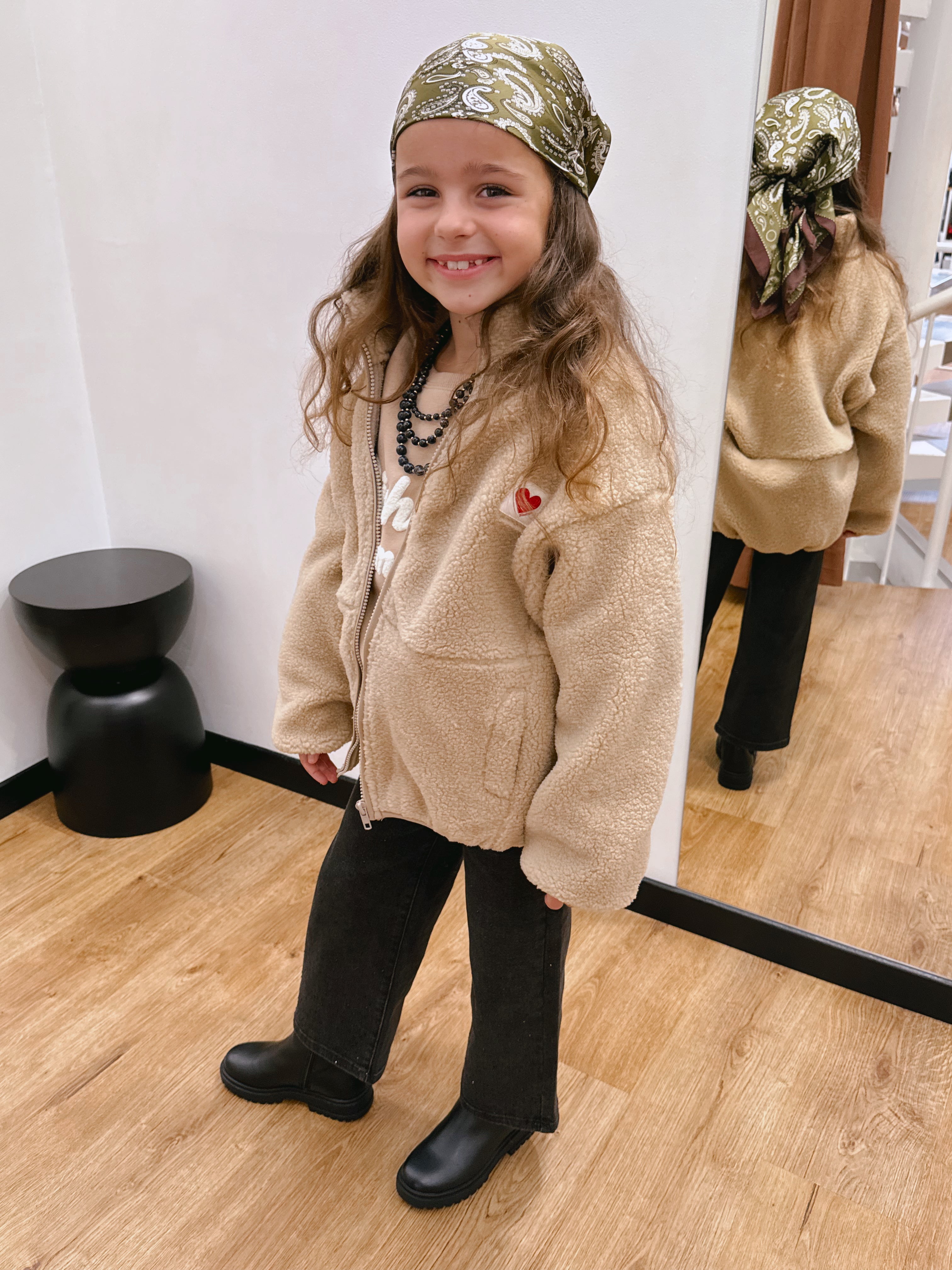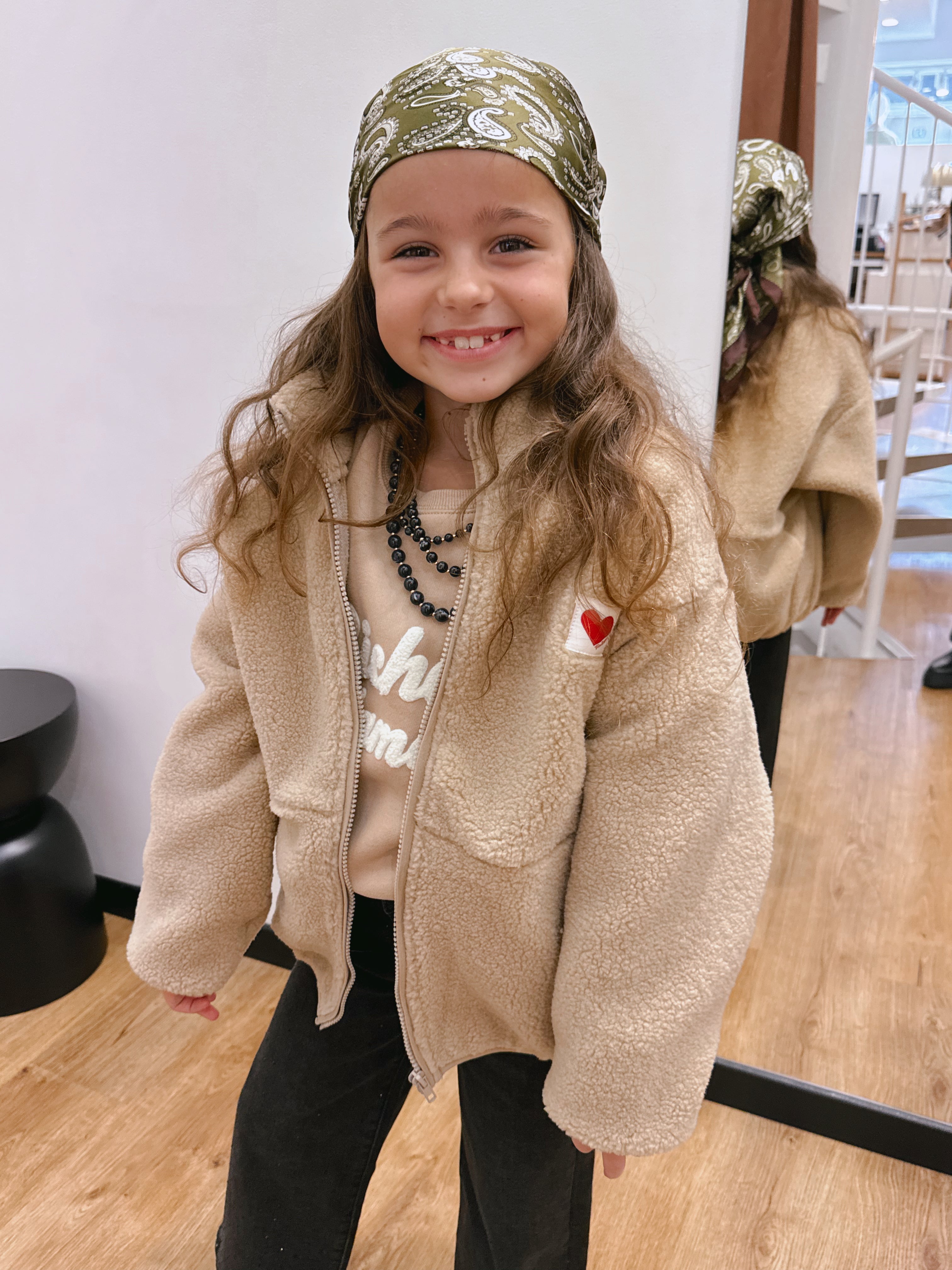 Elle possède deux grandes poches côtés très pratiques, un zip intégral, et une étiquette cœur brodée sur la poitrine qui lui donne une touche à la fois tendre et moderne.