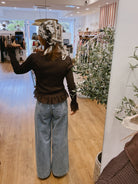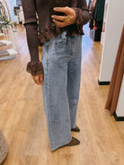 La coupe palazzo désigne un type de pantalon à la taille généralement haute, avec des jambes très larges et fluides qui s’évasent dès les hanches.
