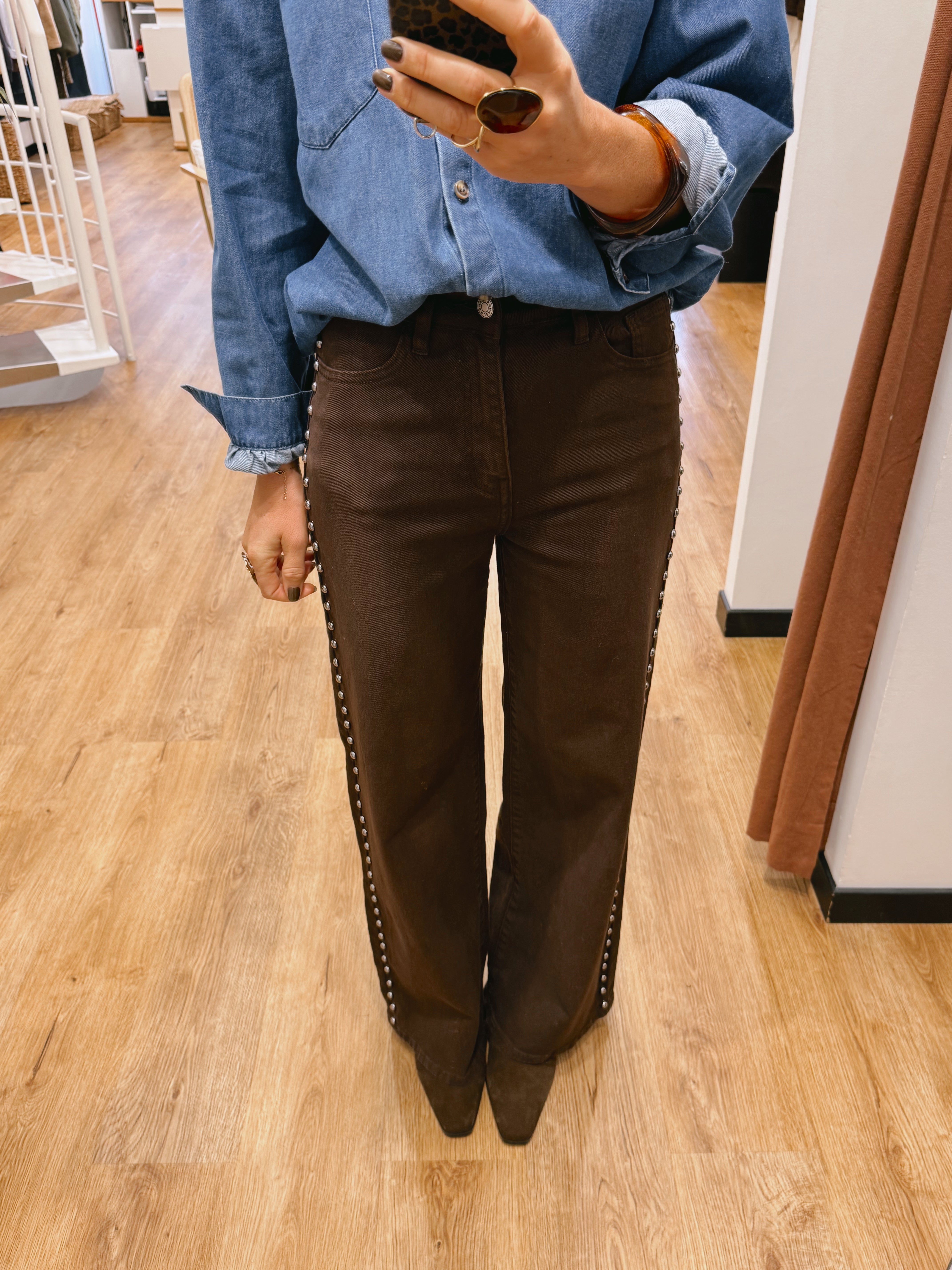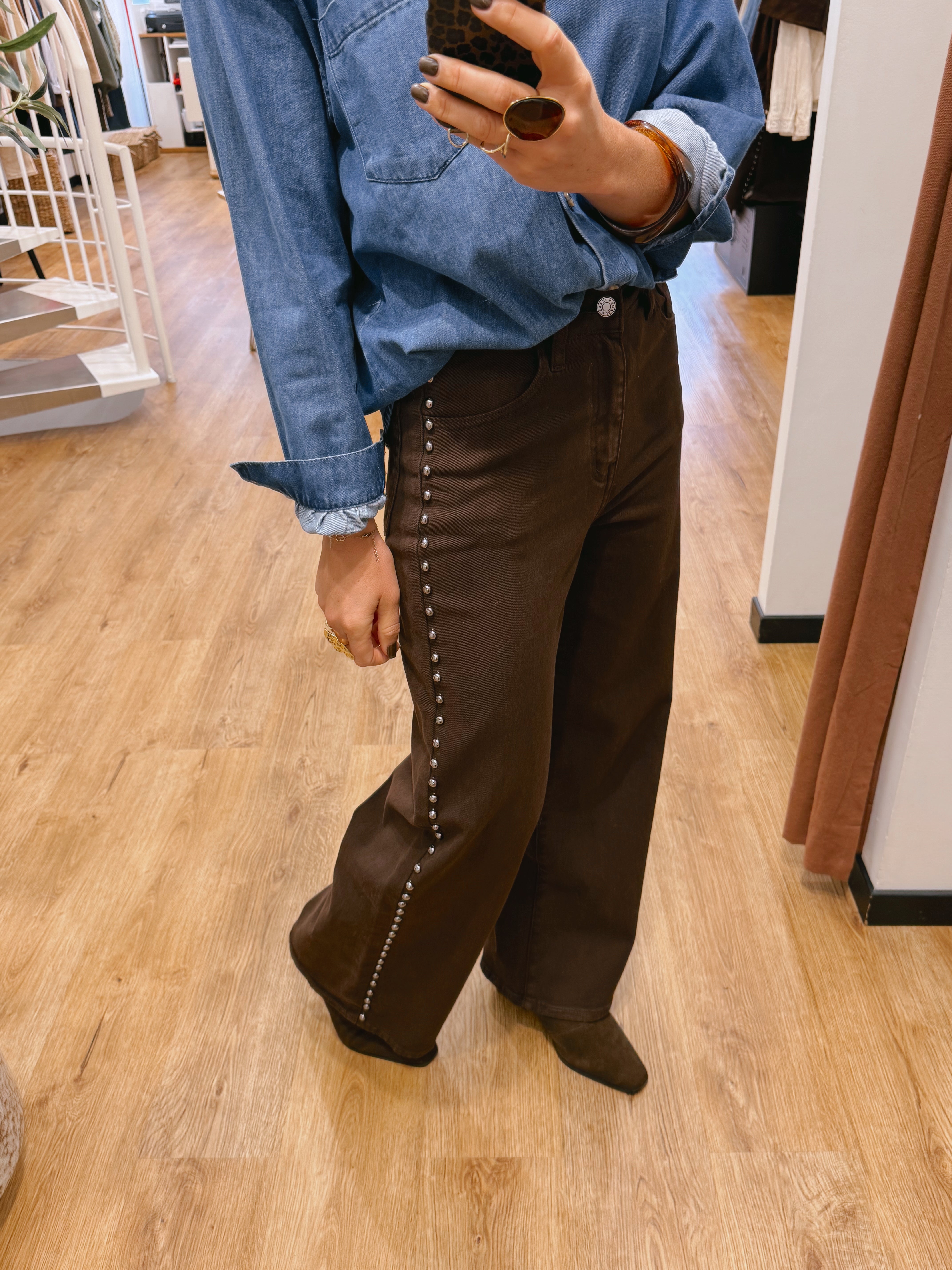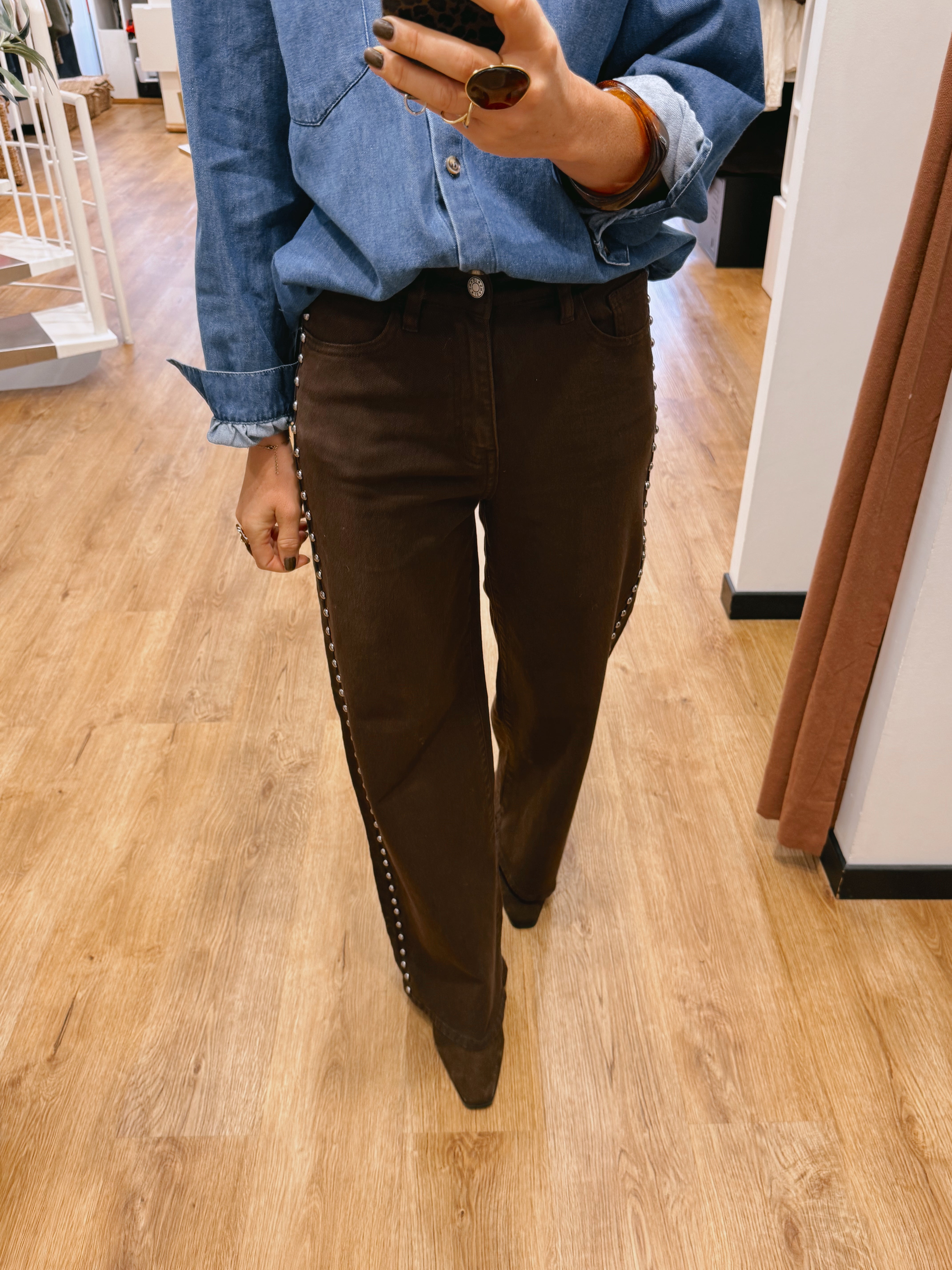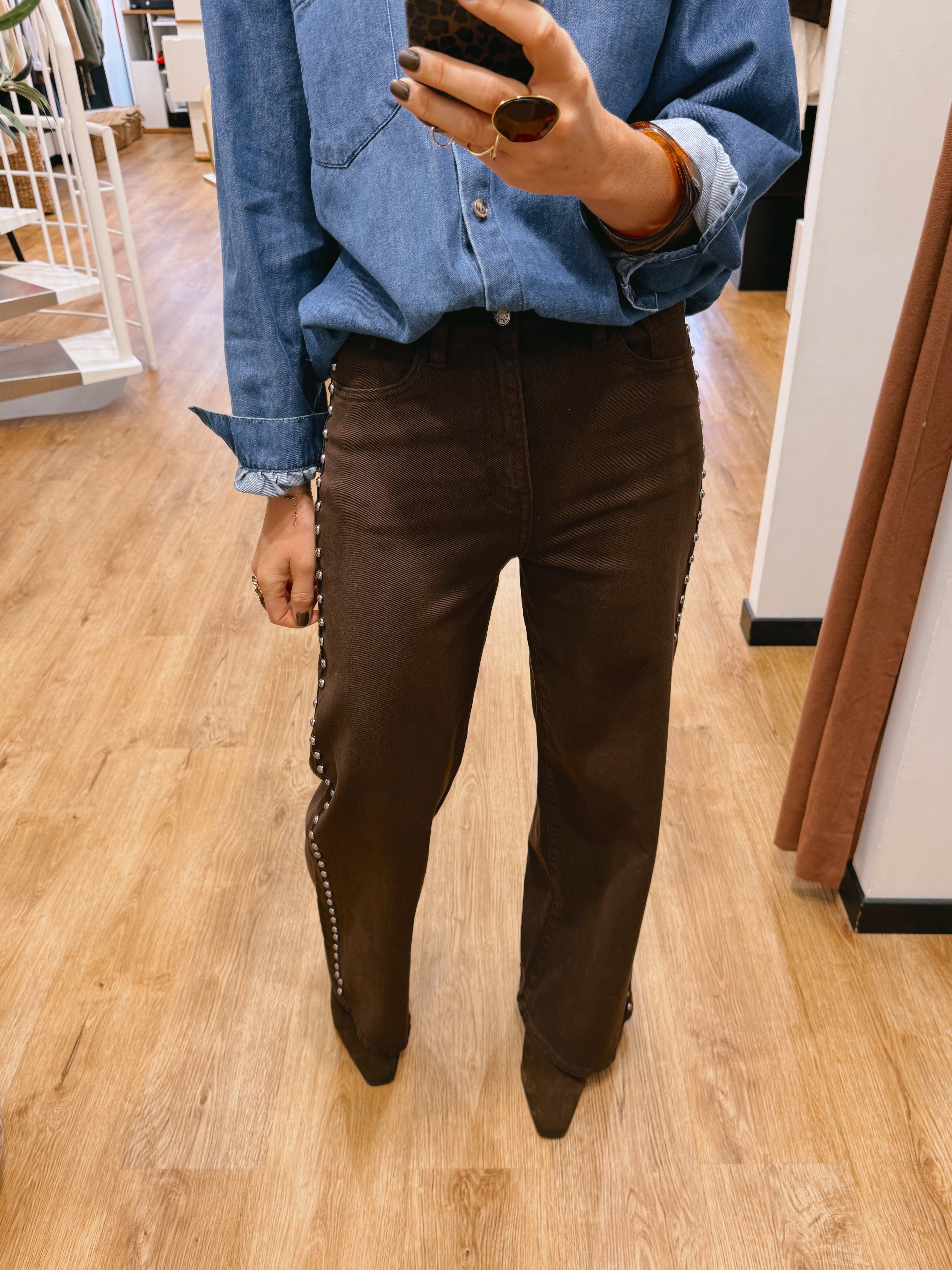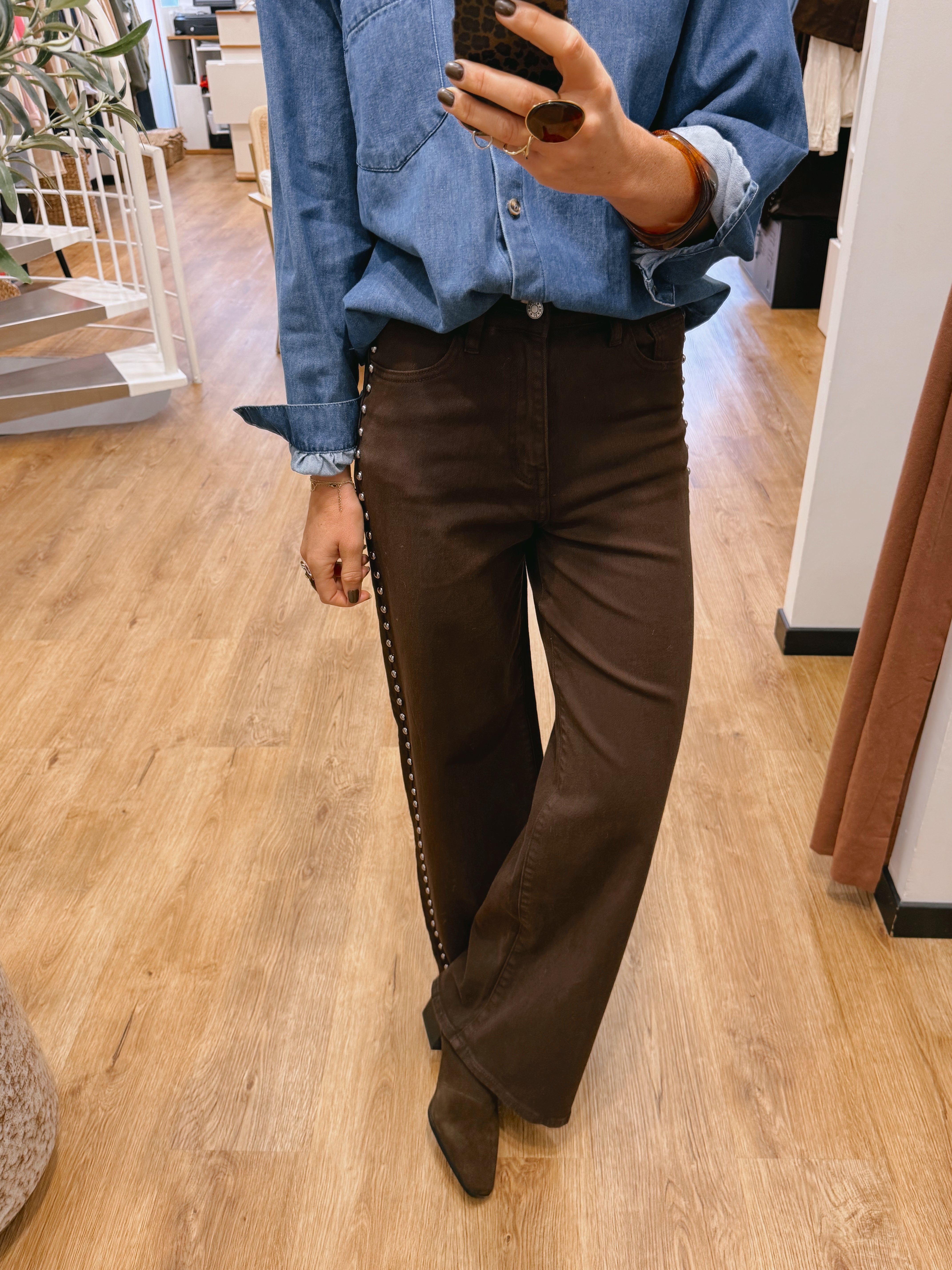 Détails : rangée de boutons argentés sur les côtés des jambes