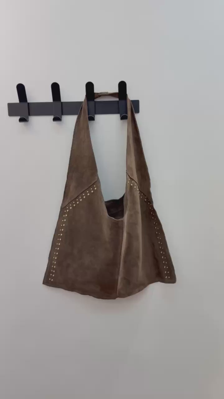 Avec son allure décontractée et élégante, ce sac hobo en cuir suédé taupe est le parfait allié du quotidien. Son cuir doux et souple lui confère un tombé naturel et confortable, tandis que sa ligne épurée est sublimée par de délicats clous métalliques sur les côtés, ajoutant une touche rock et raffinée.