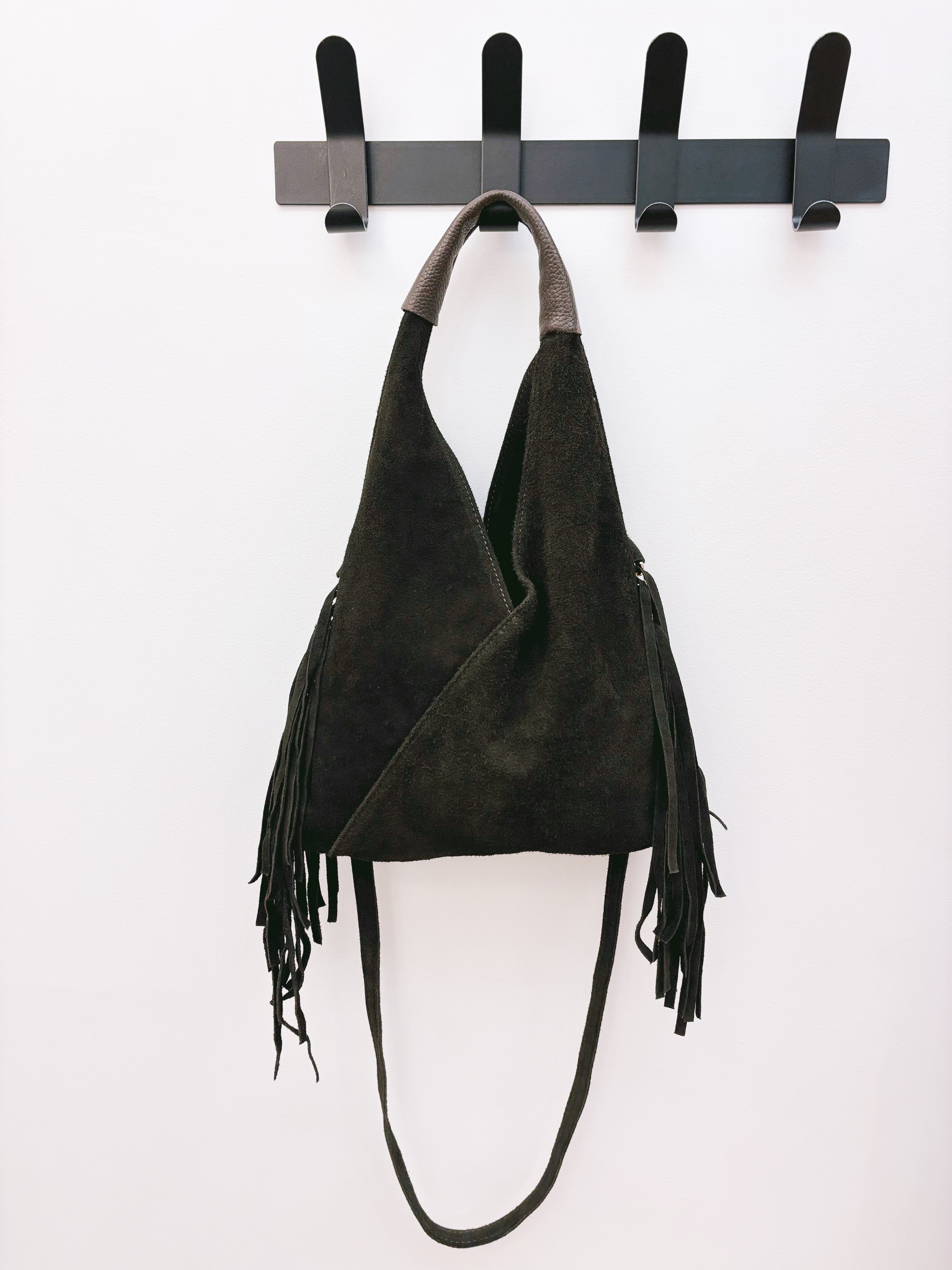 Ce modèle est réalisé en cuir suédé 100 % véritable, d’une douceur veloutée au toucher. Sa teinte taupe naturelle et ses franges latérales lui offrent une allure bohème et décontractée. Le sac présente une forme souple en triangle avec une fermeture à lien et une bandoulière fine assortie, parfaite pour un porté épaule ou croisé. Ce modèle séduit par son style artisanal et son confort, parfait pour accompagner des tenues casual et chic.