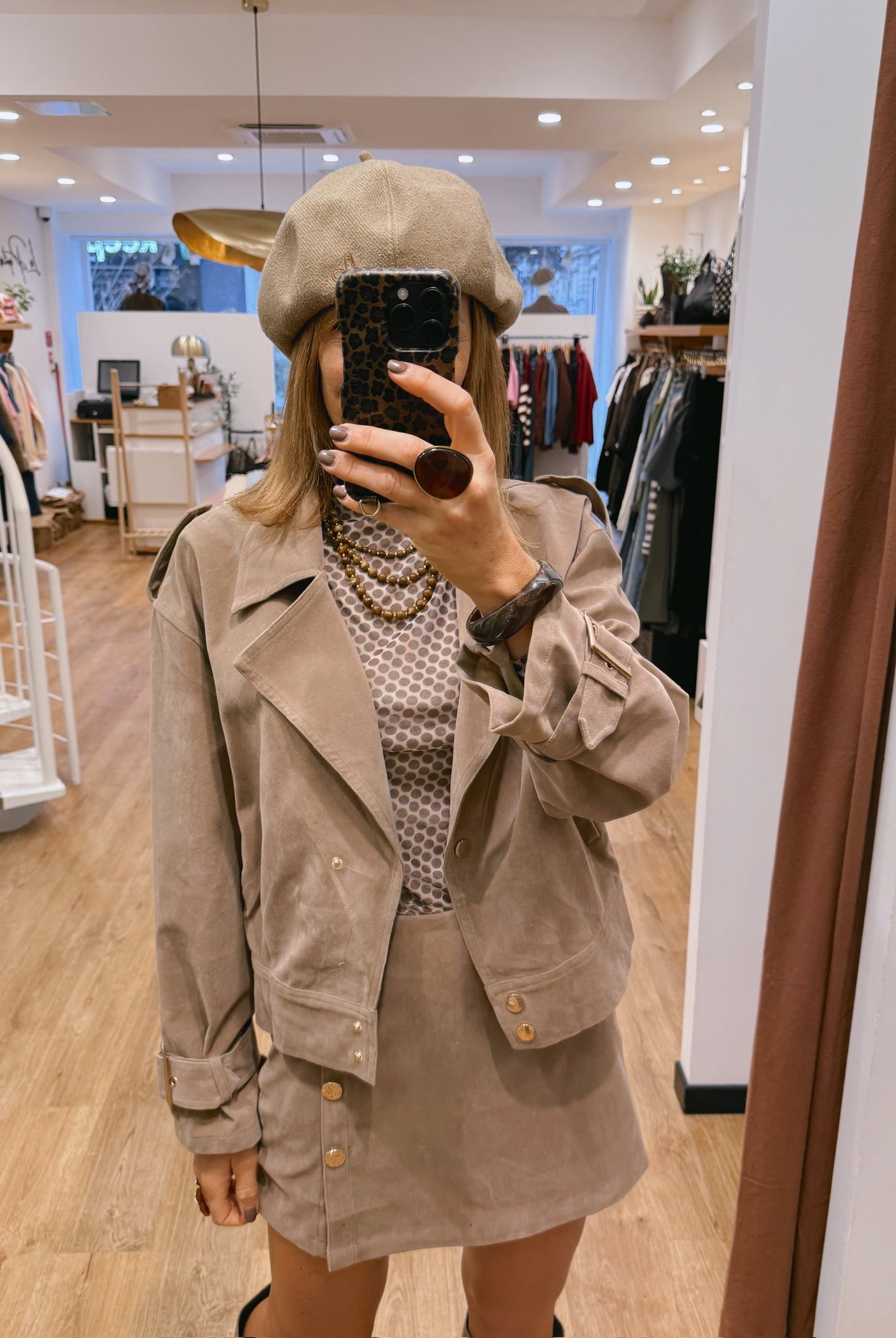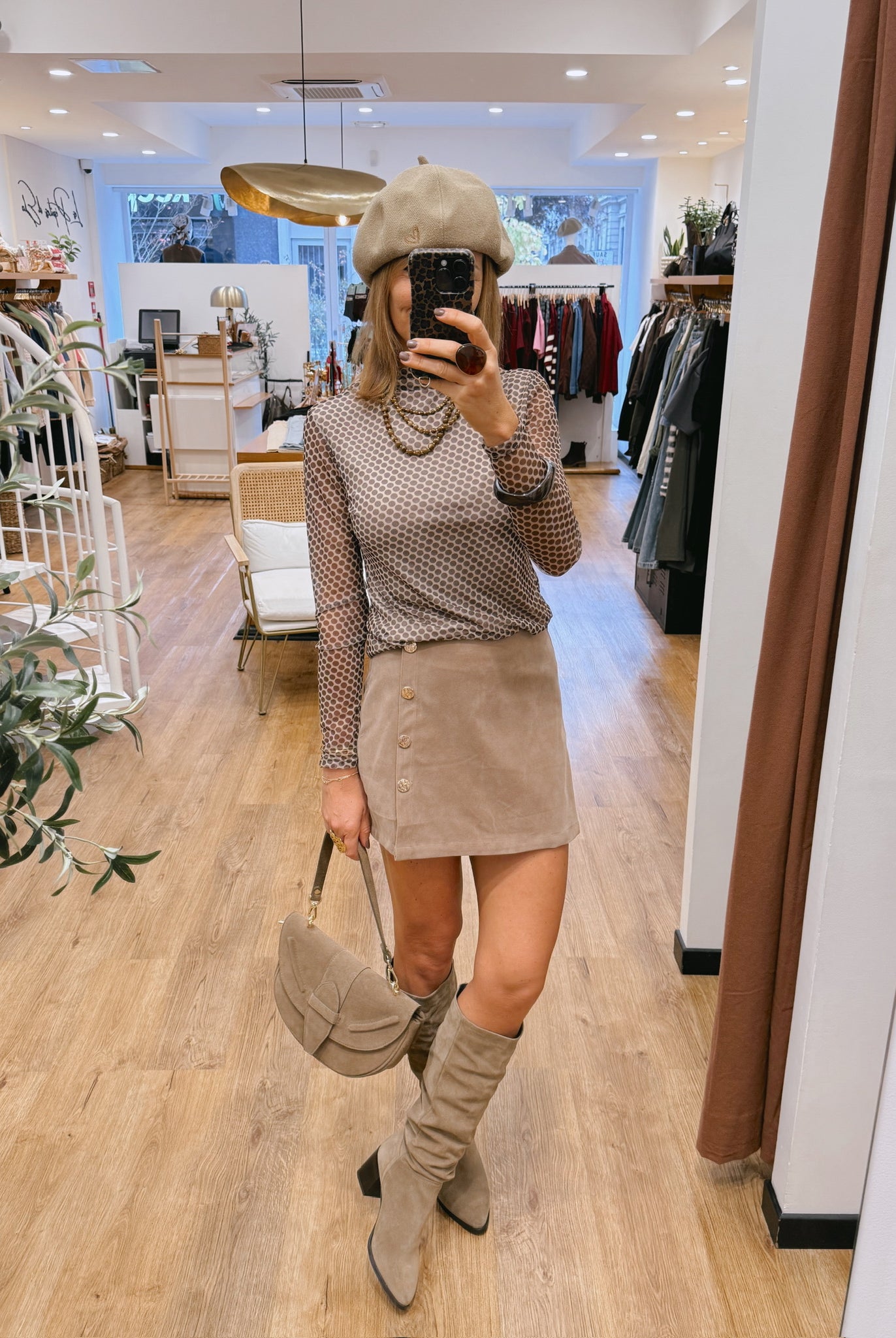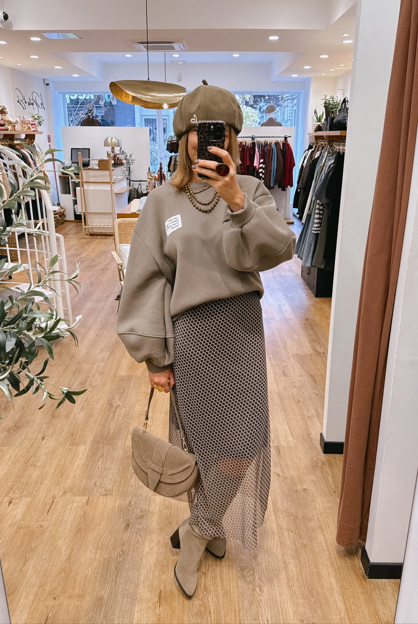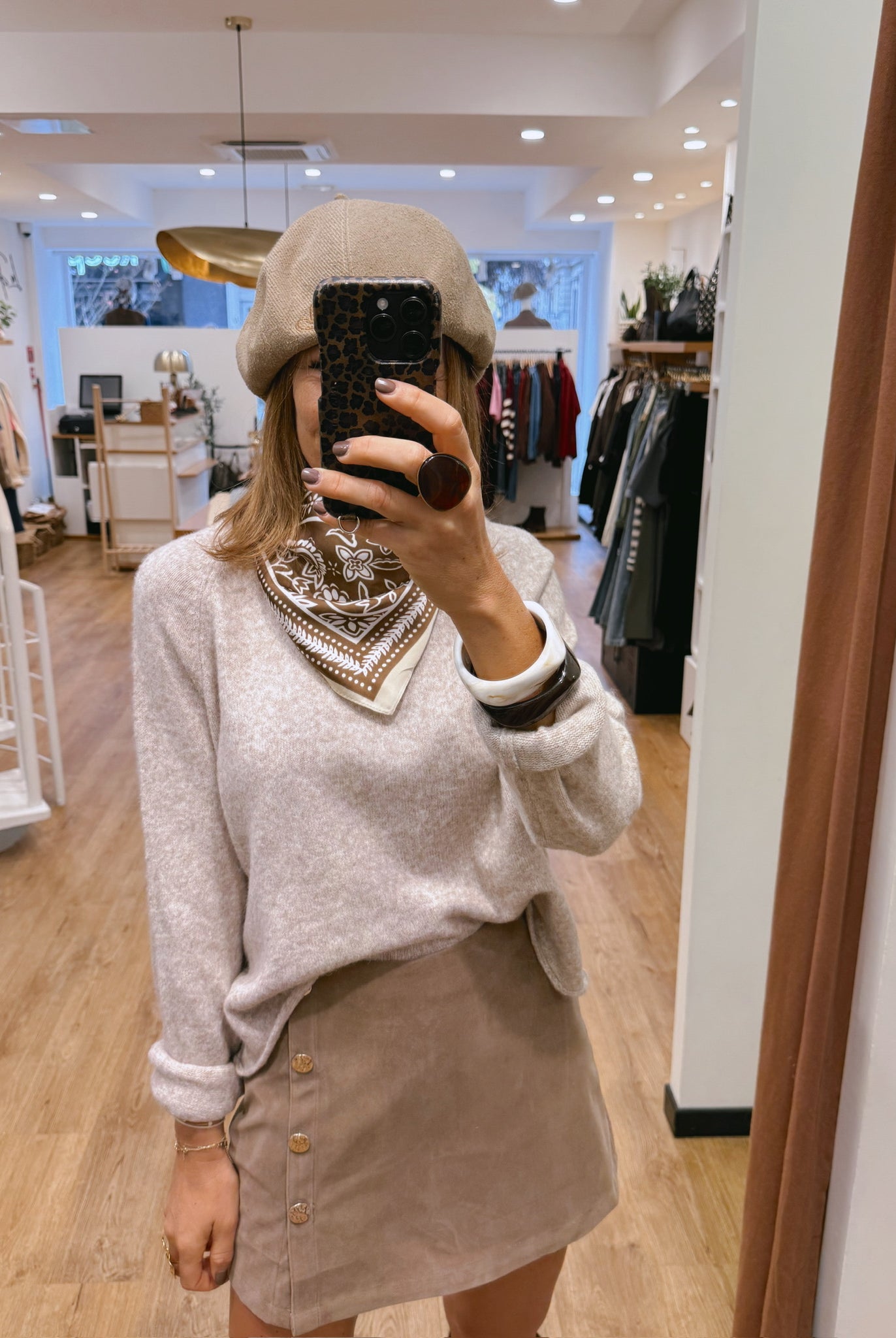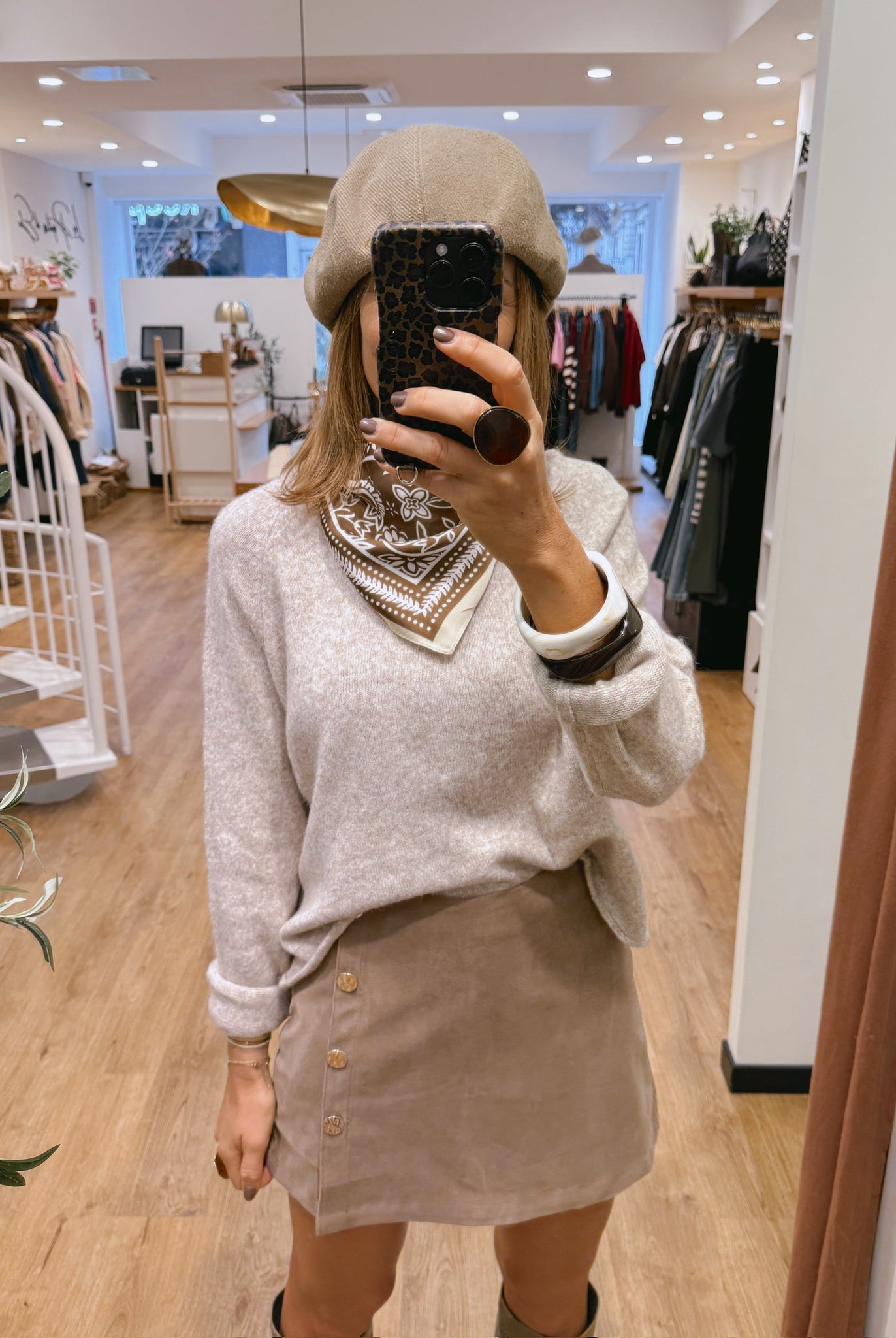 Les looks jouent sur les contrastes : un pull oversize associé à une jupe aérienne, un tailleur en suédine relevé d’un béret, ou encore une blouse fluide qui danse au vent sur un denim parfaitement coupé.