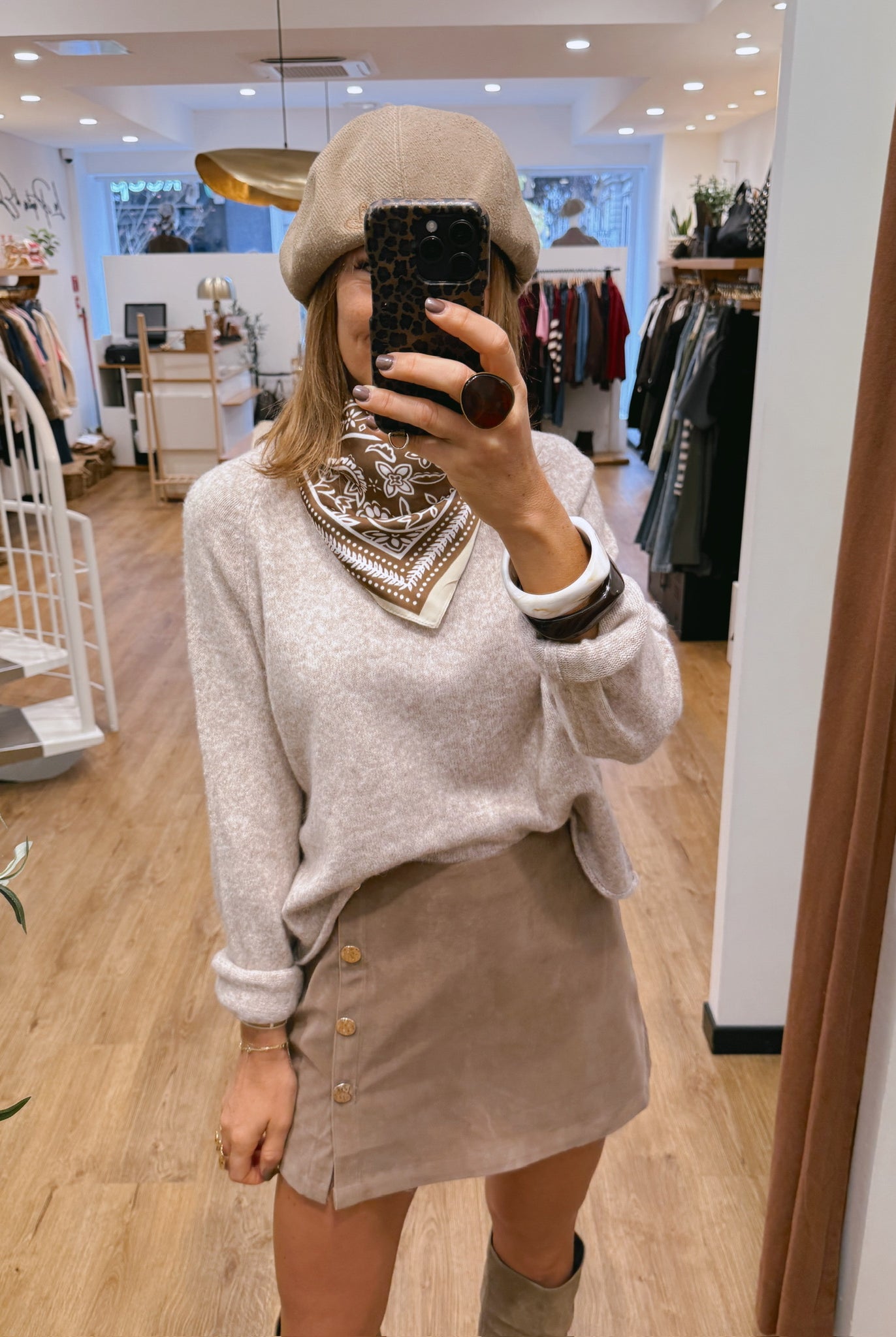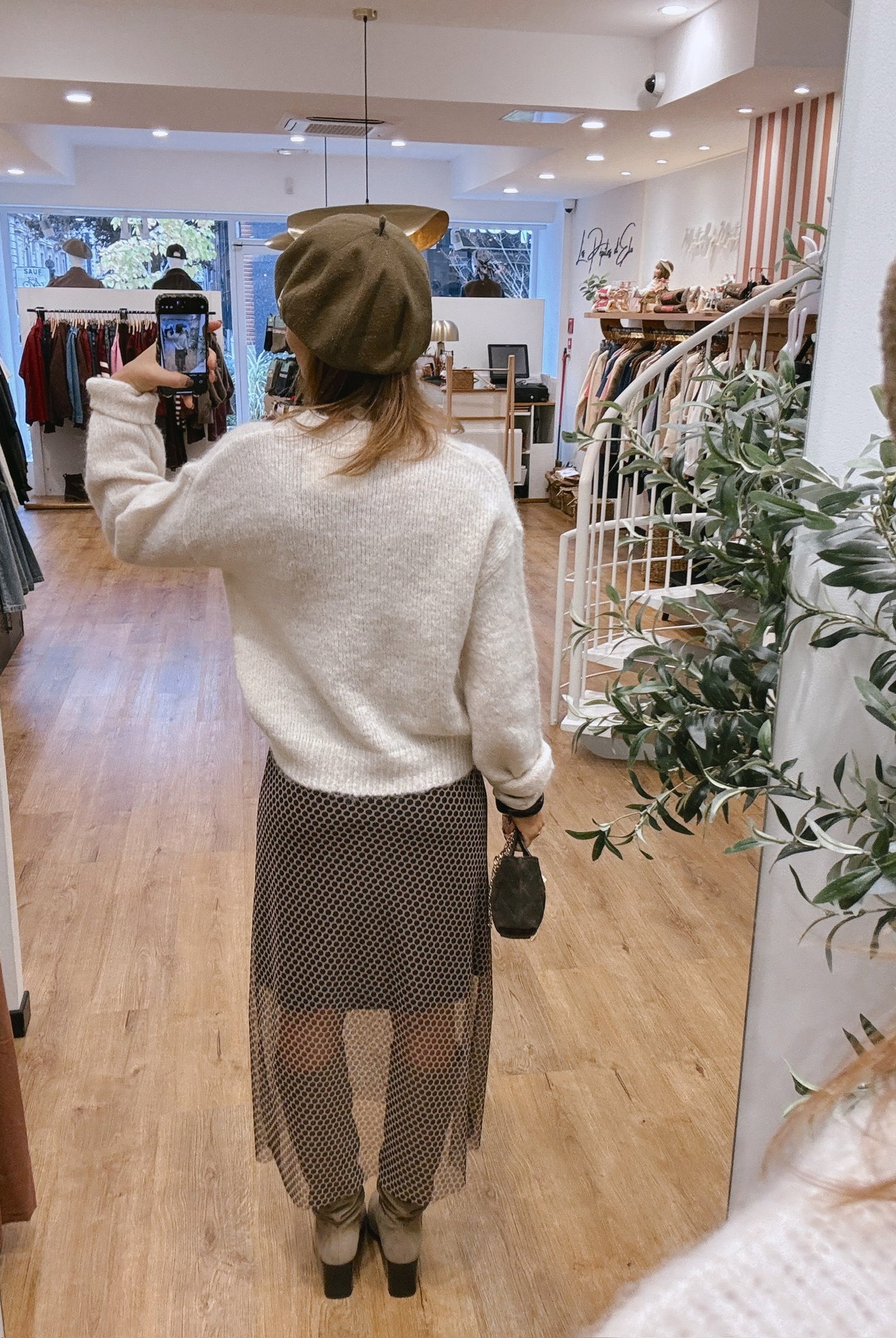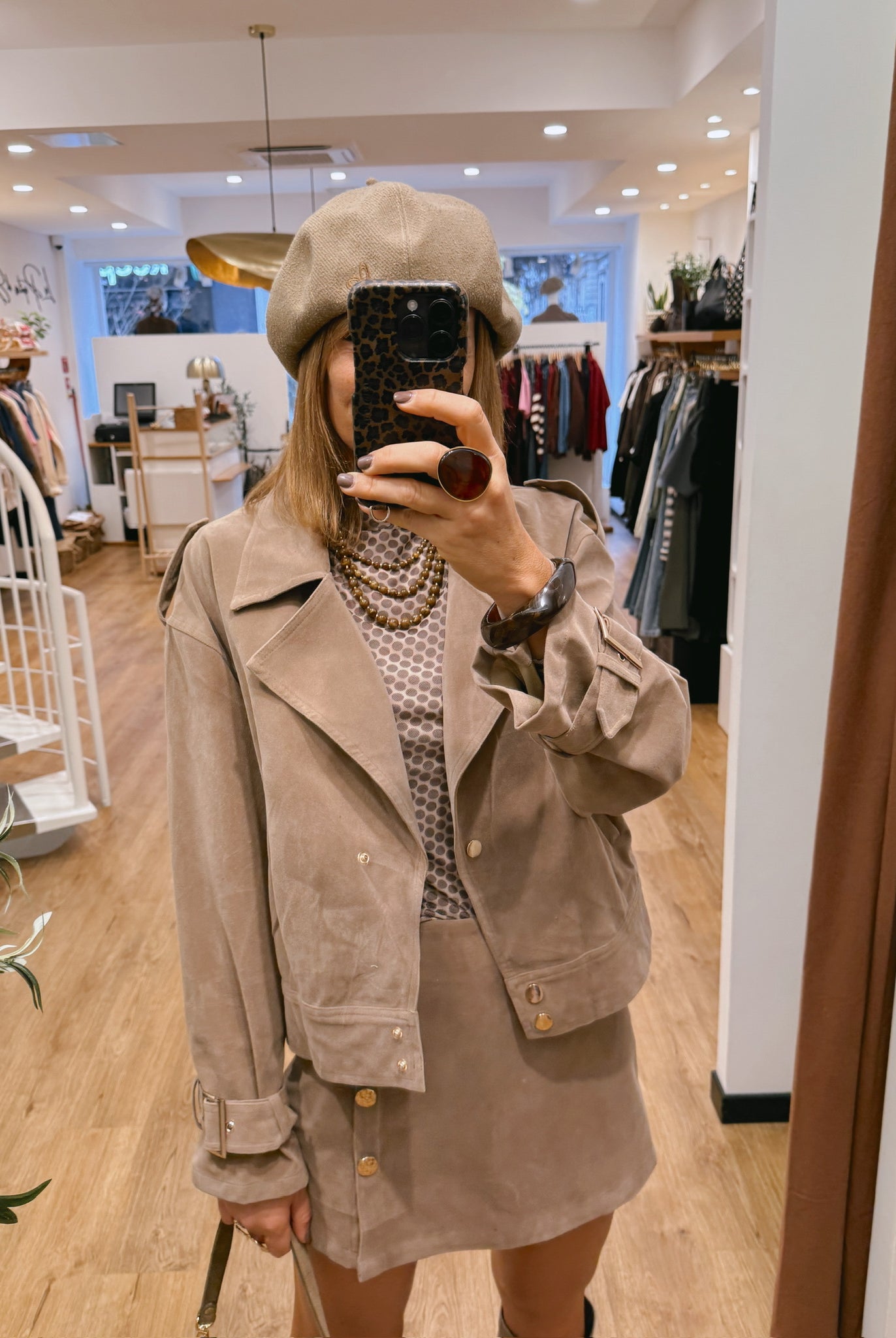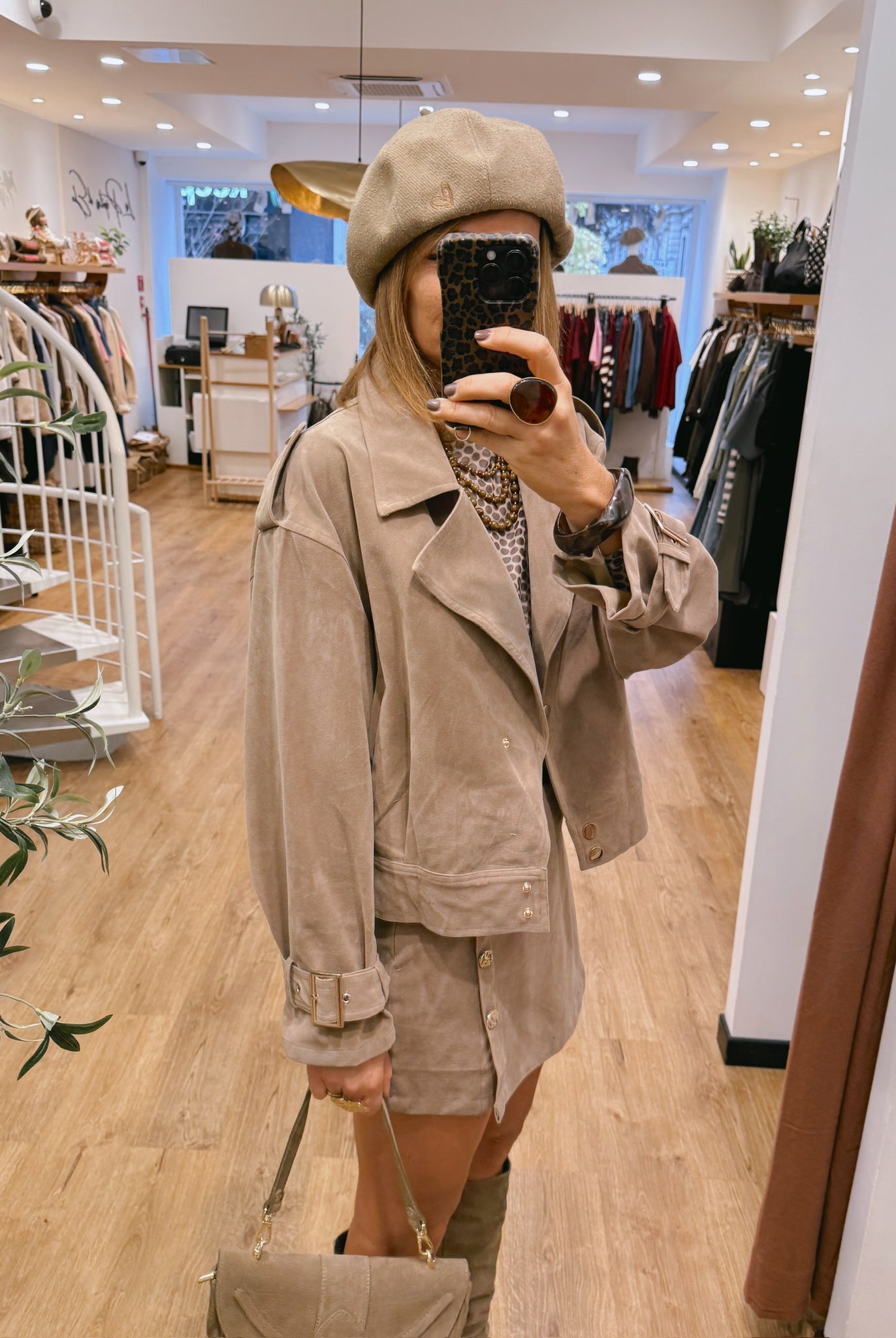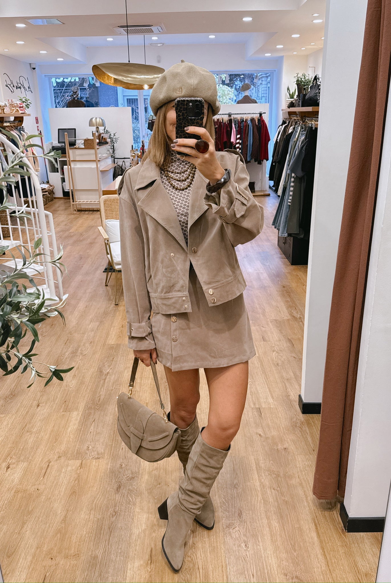 Les looks jouent sur les contrastes : un pull oversize associé à une jupe aérienne, un tailleur en suédine relevé d’un béret, ou encore une blouse fluide qui danse au vent sur un denim parfaitement coupé.