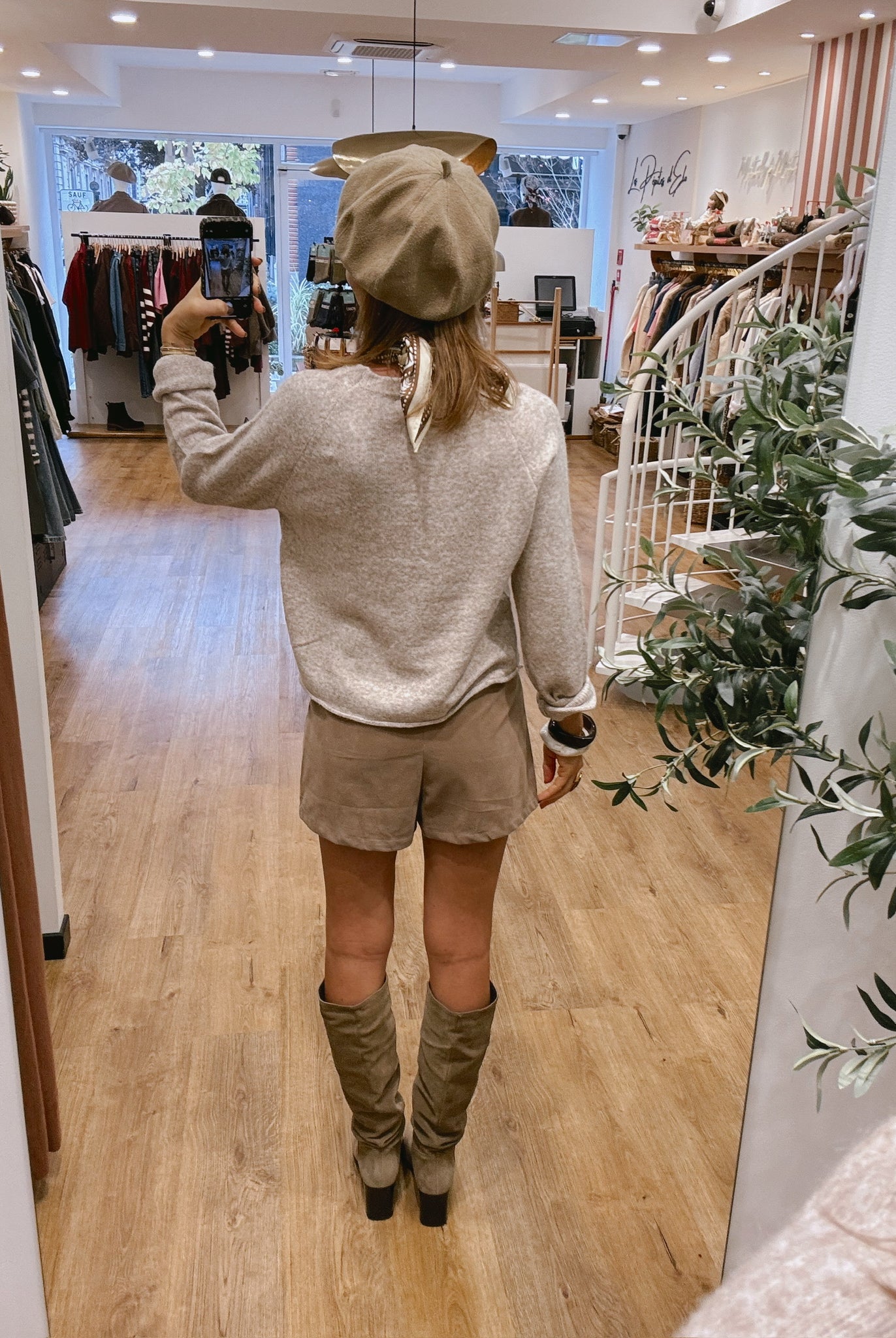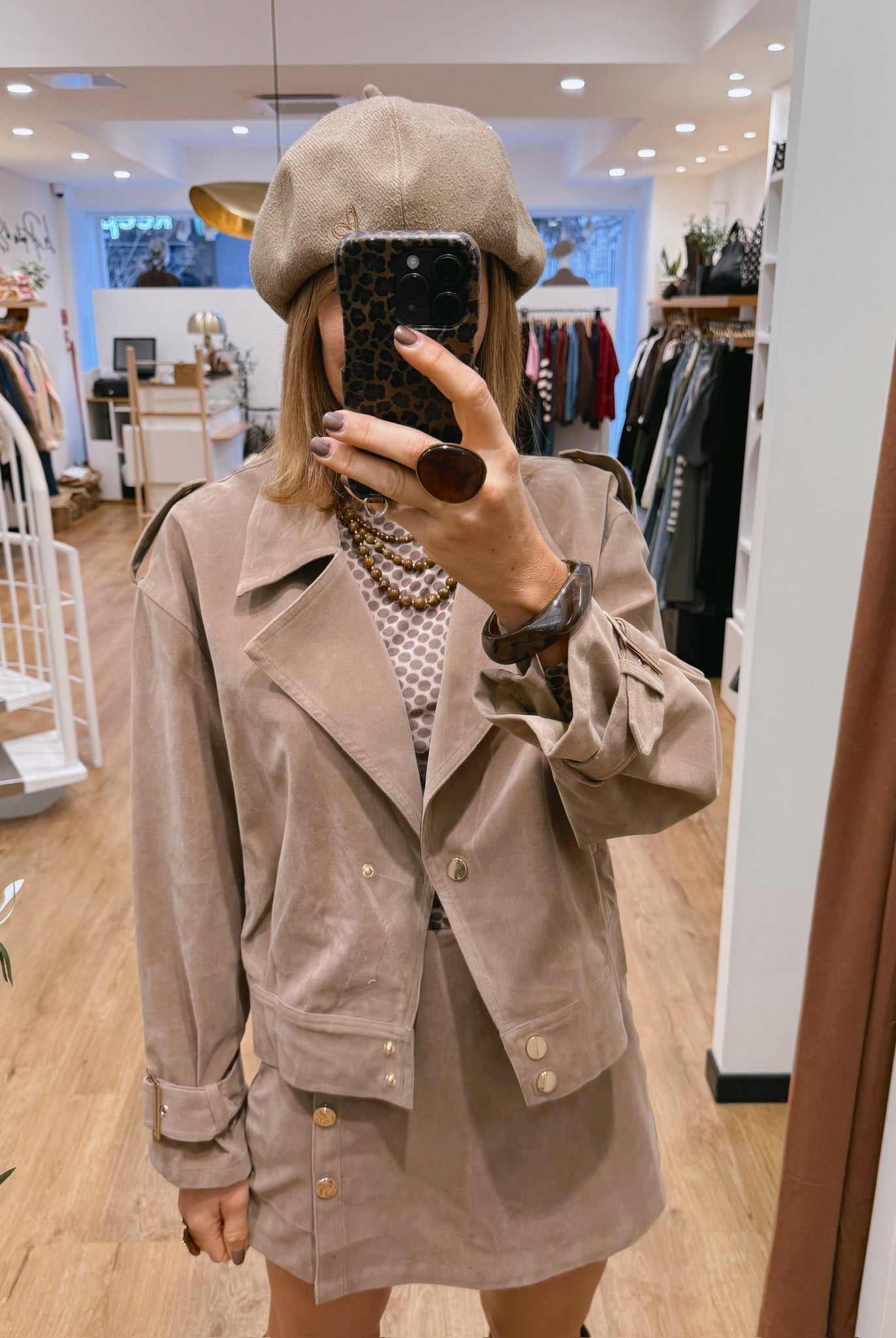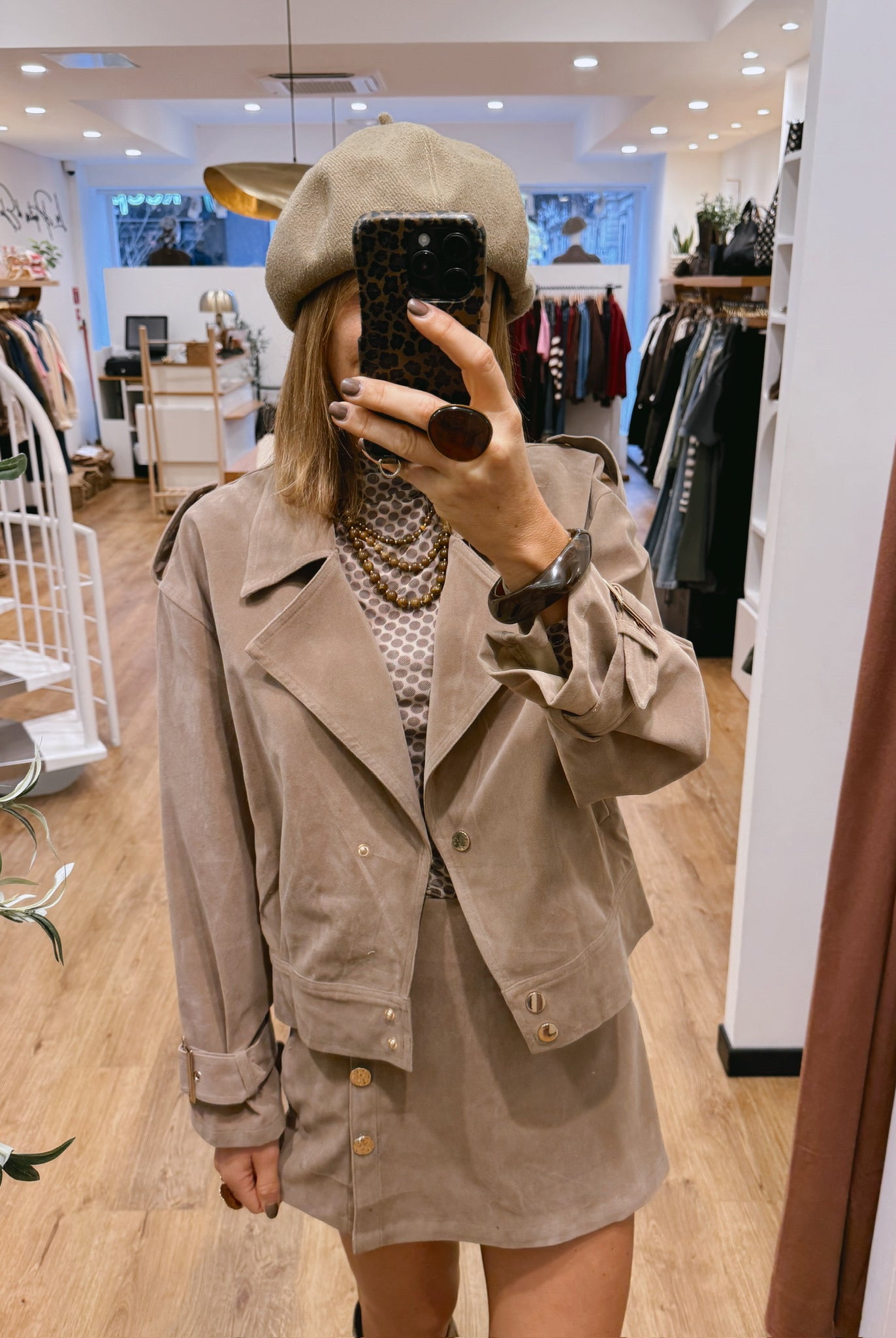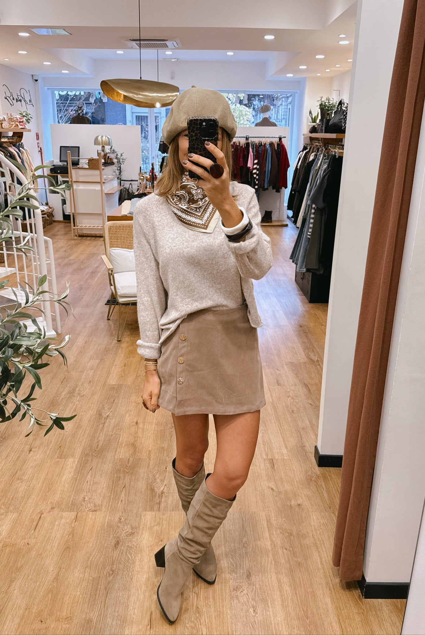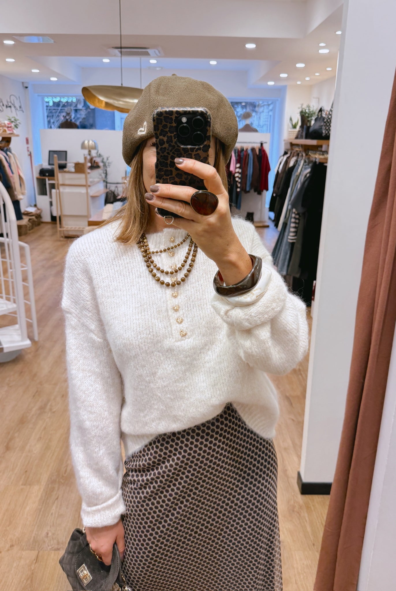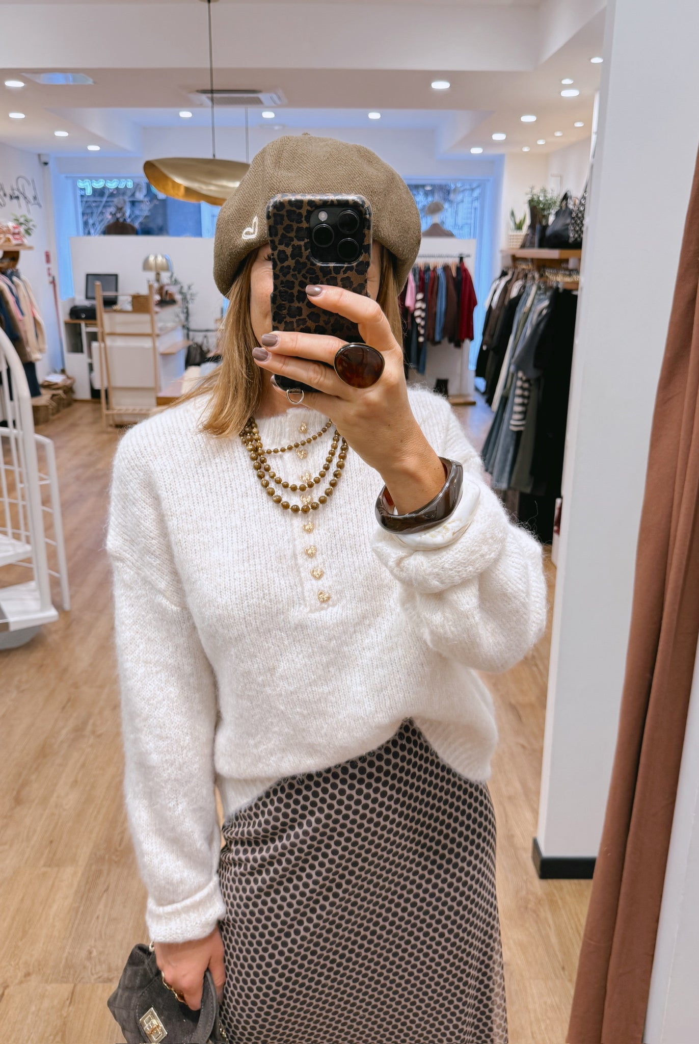 Les looks jouent sur les contrastes : un pull oversize associé à une jupe aérienne, un tailleur en suédine relevé d’un béret, ou encore une blouse fluide qui danse au vent sur un denim parfaitement coupé.
