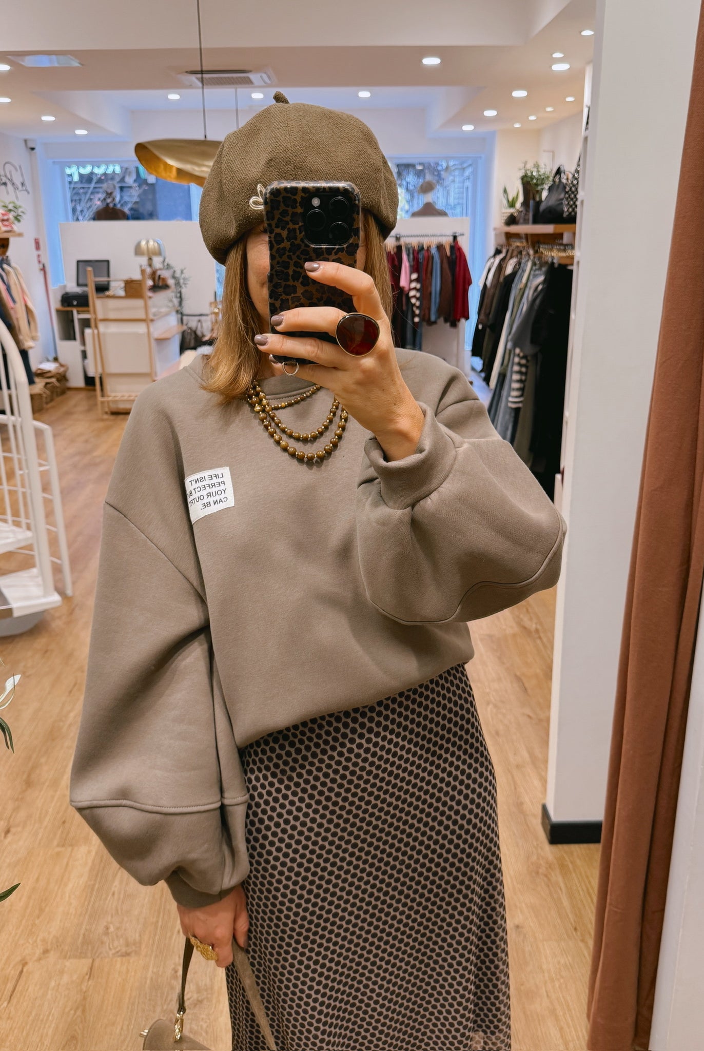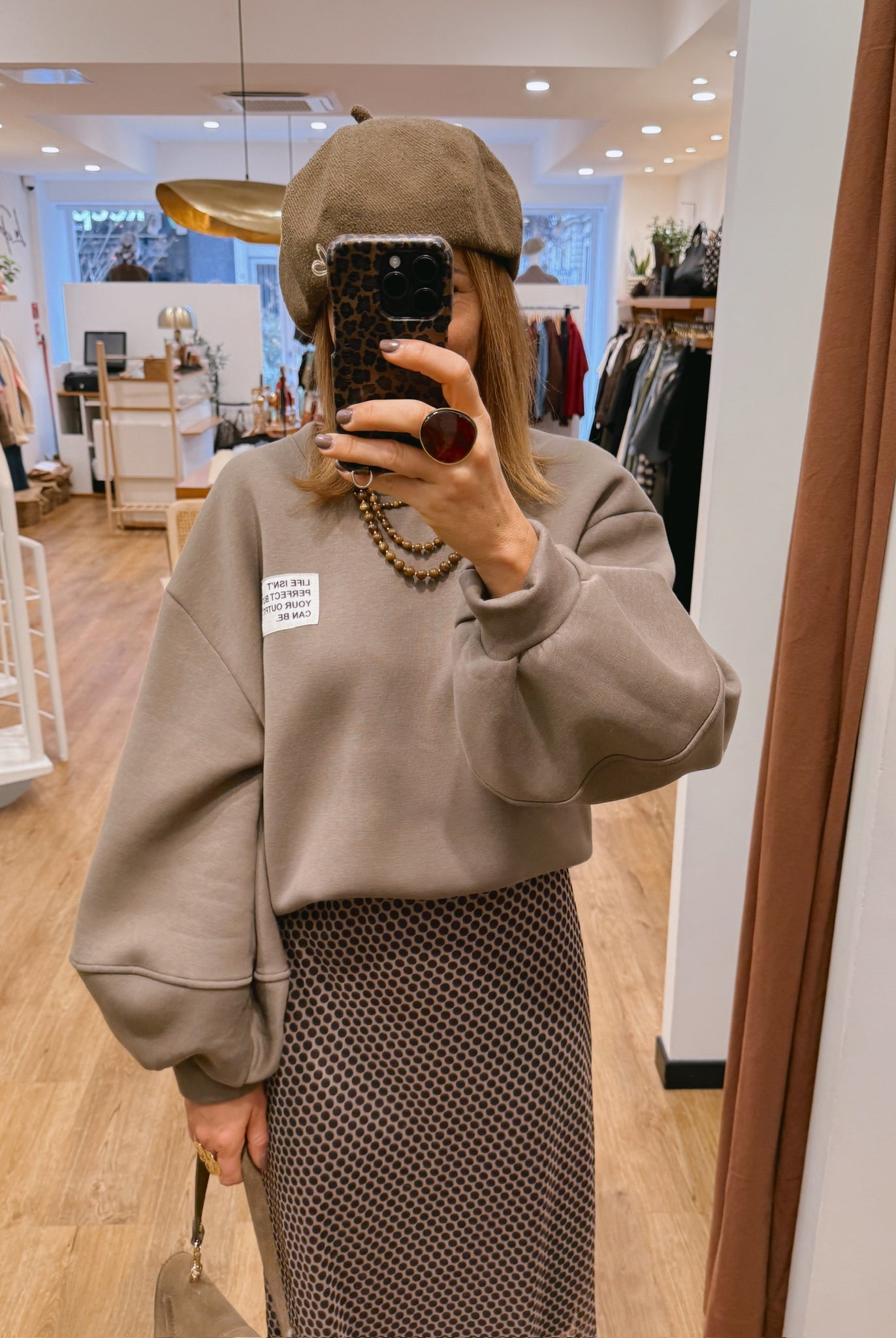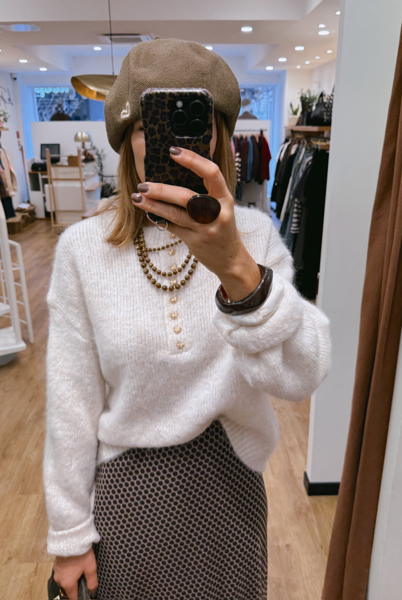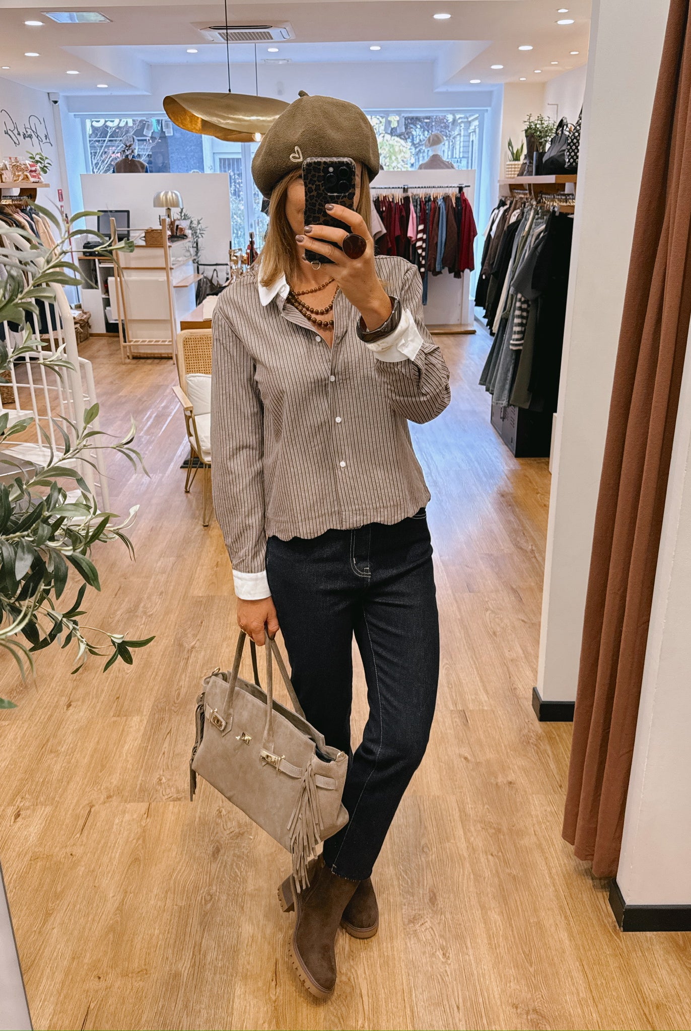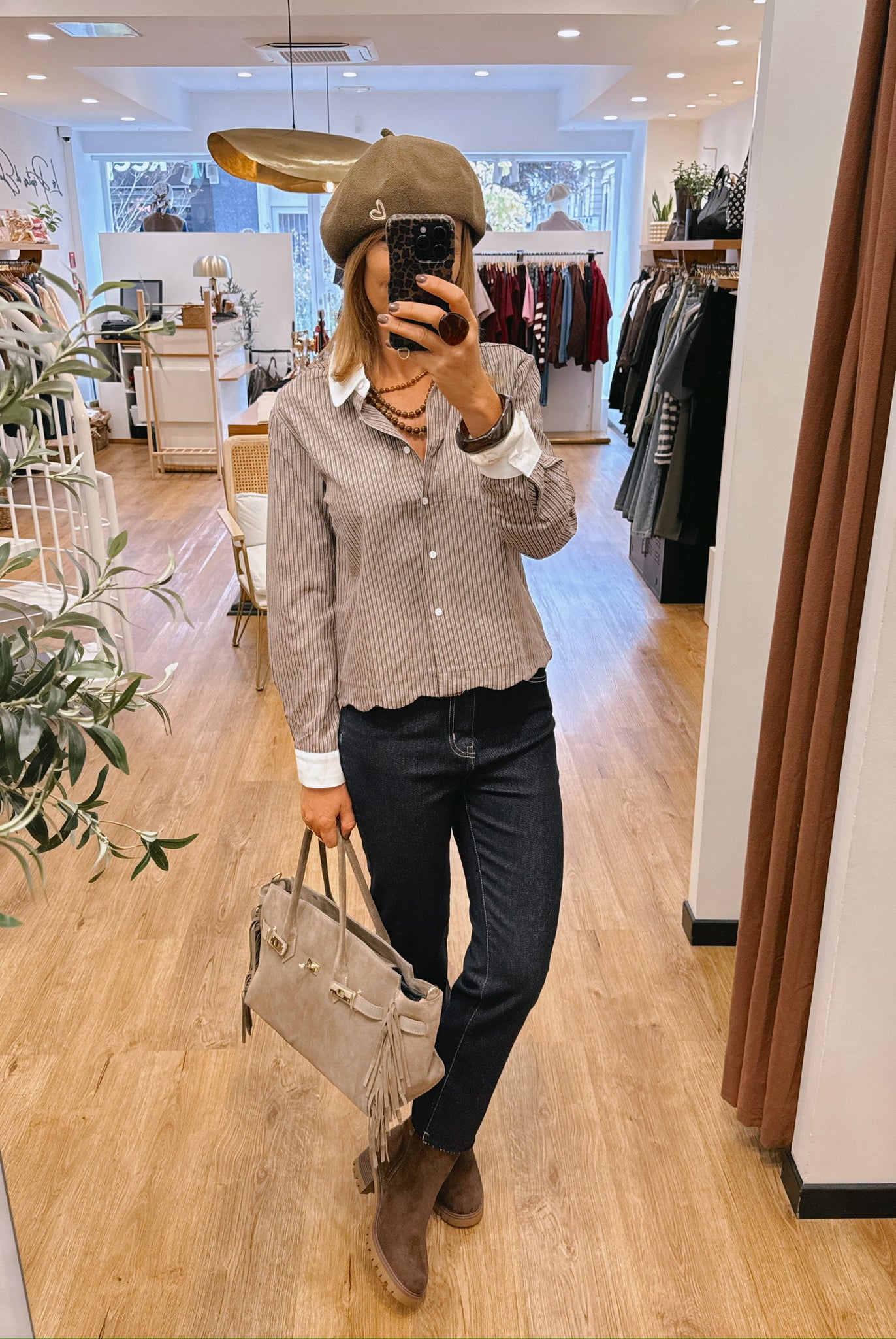 Les looks jouent sur les contrastes : un pull oversize associé à une jupe aérienne, un tailleur en suédine relevé d’un béret, ou encore une blouse fluide qui danse au vent sur un denim parfaitement coupé.