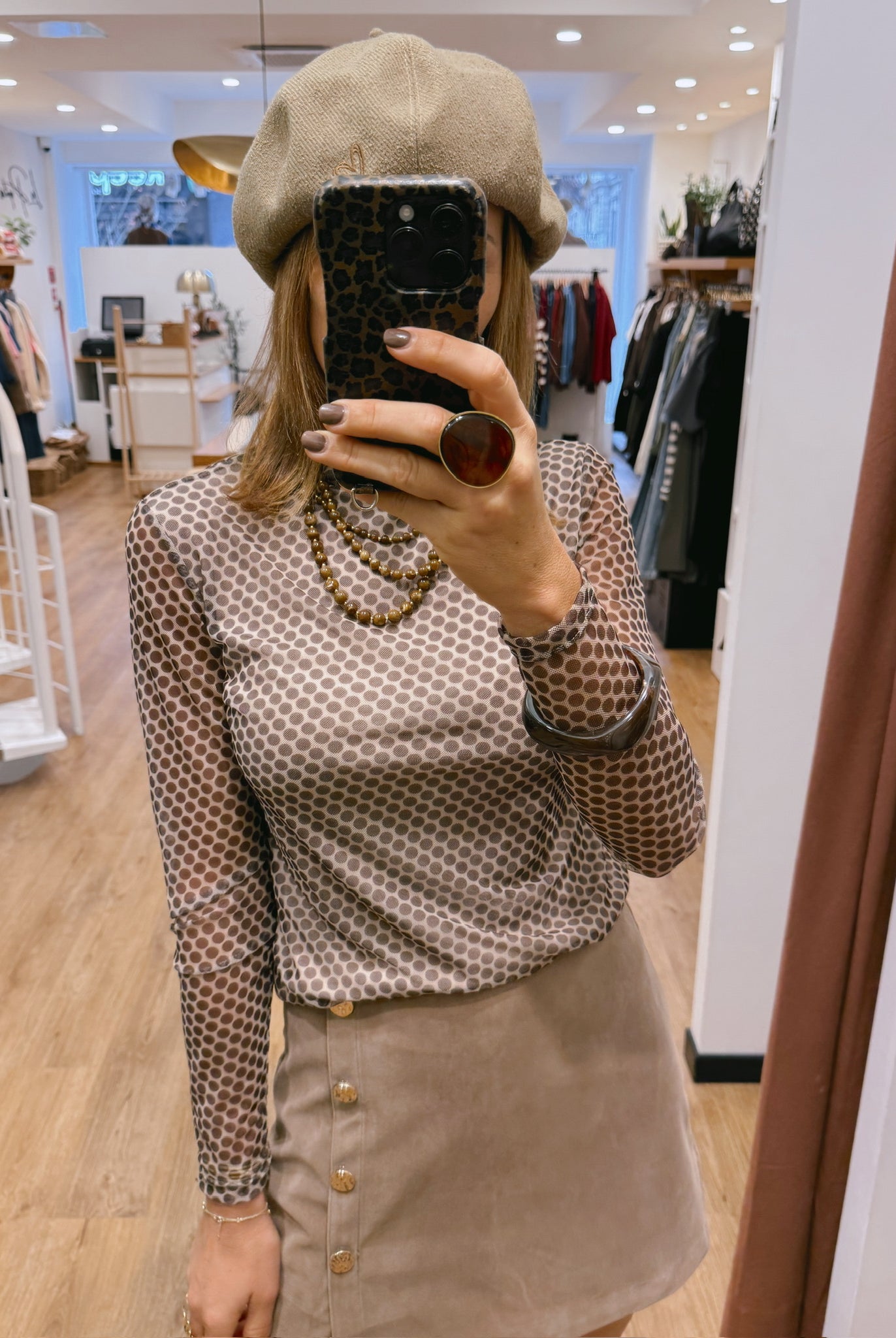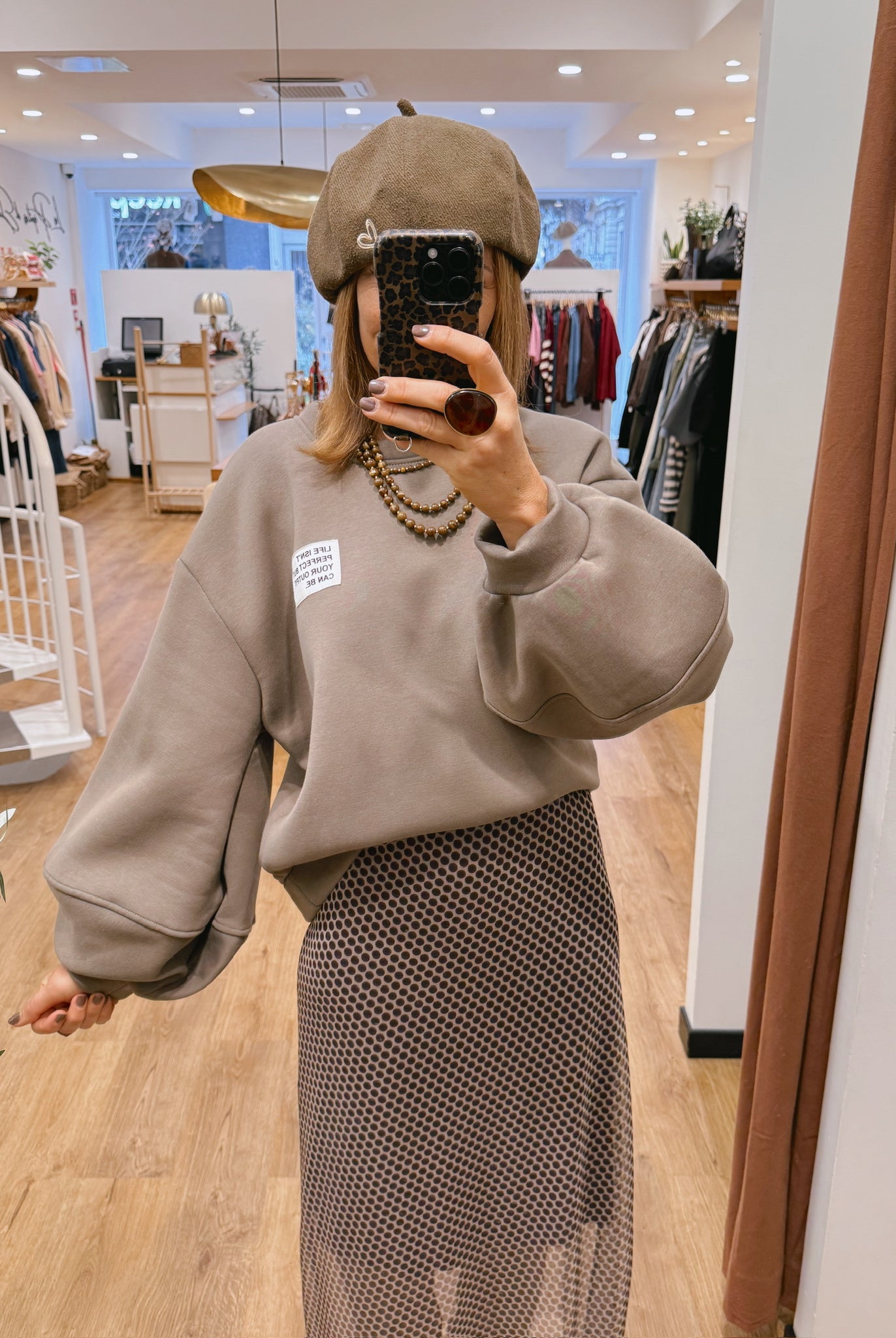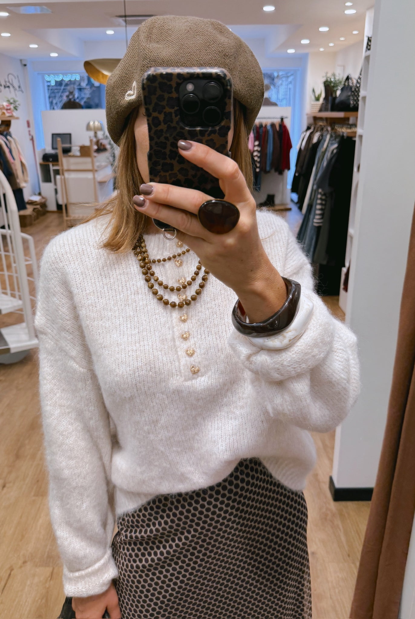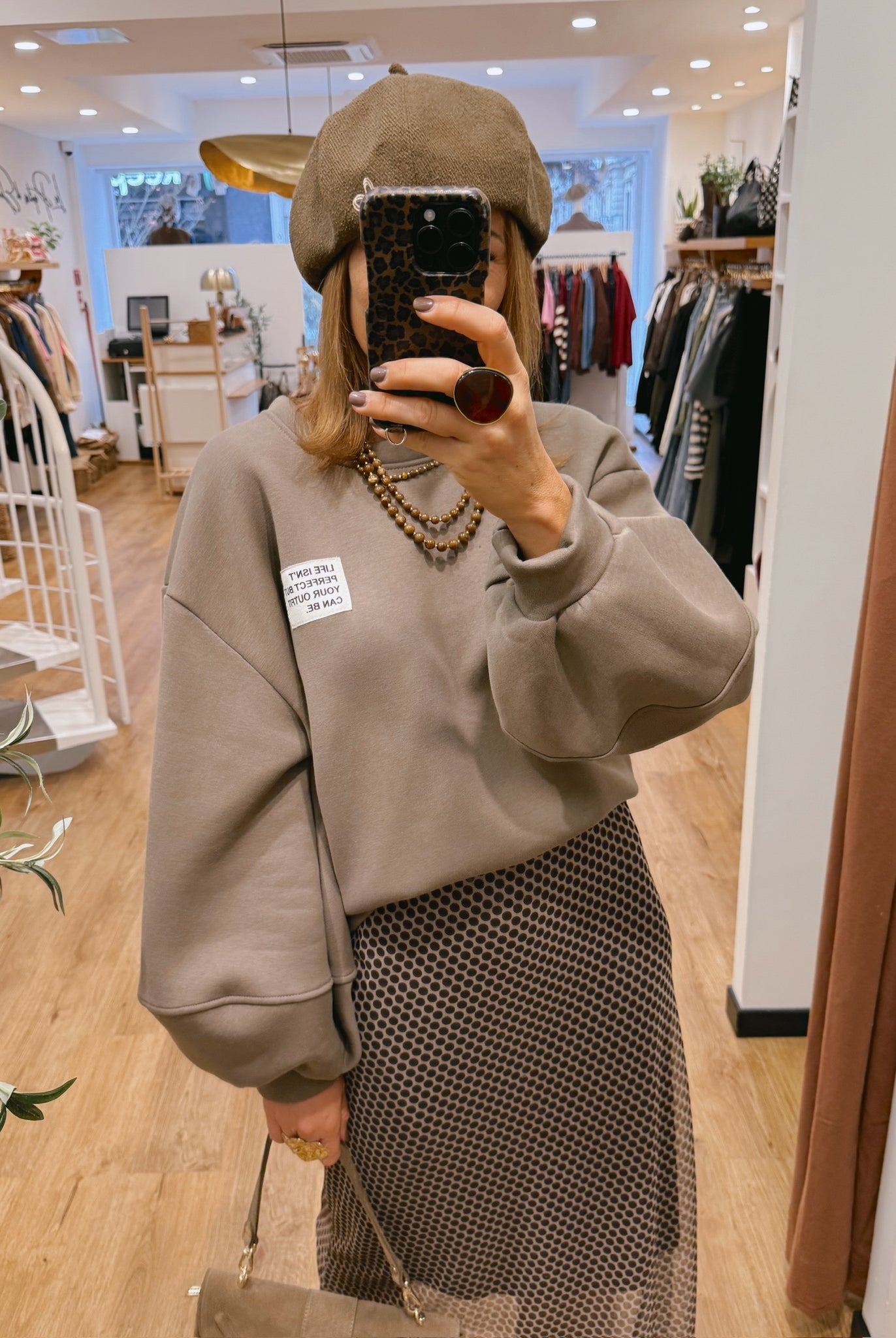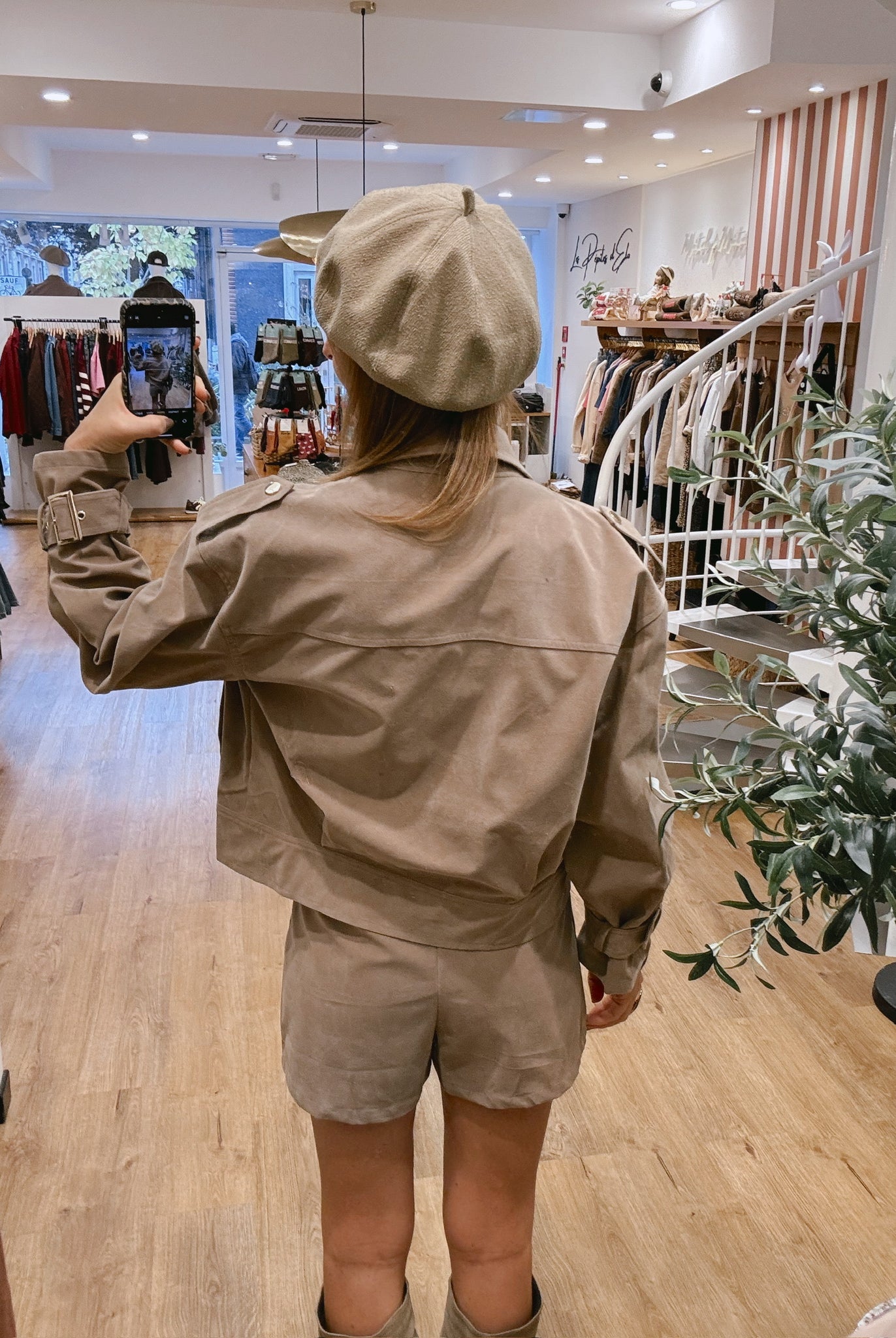 Les looks jouent sur les contrastes : un pull oversize associé à une jupe aérienne, un tailleur en suédine relevé d’un béret, ou encore une blouse fluide qui danse au vent sur un denim parfaitement coupé.
