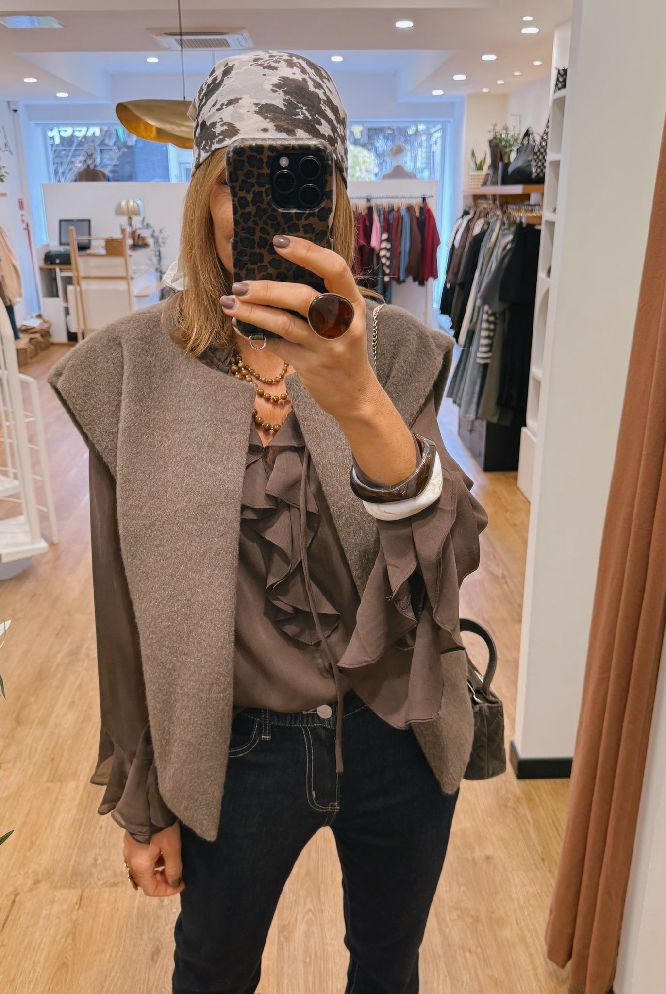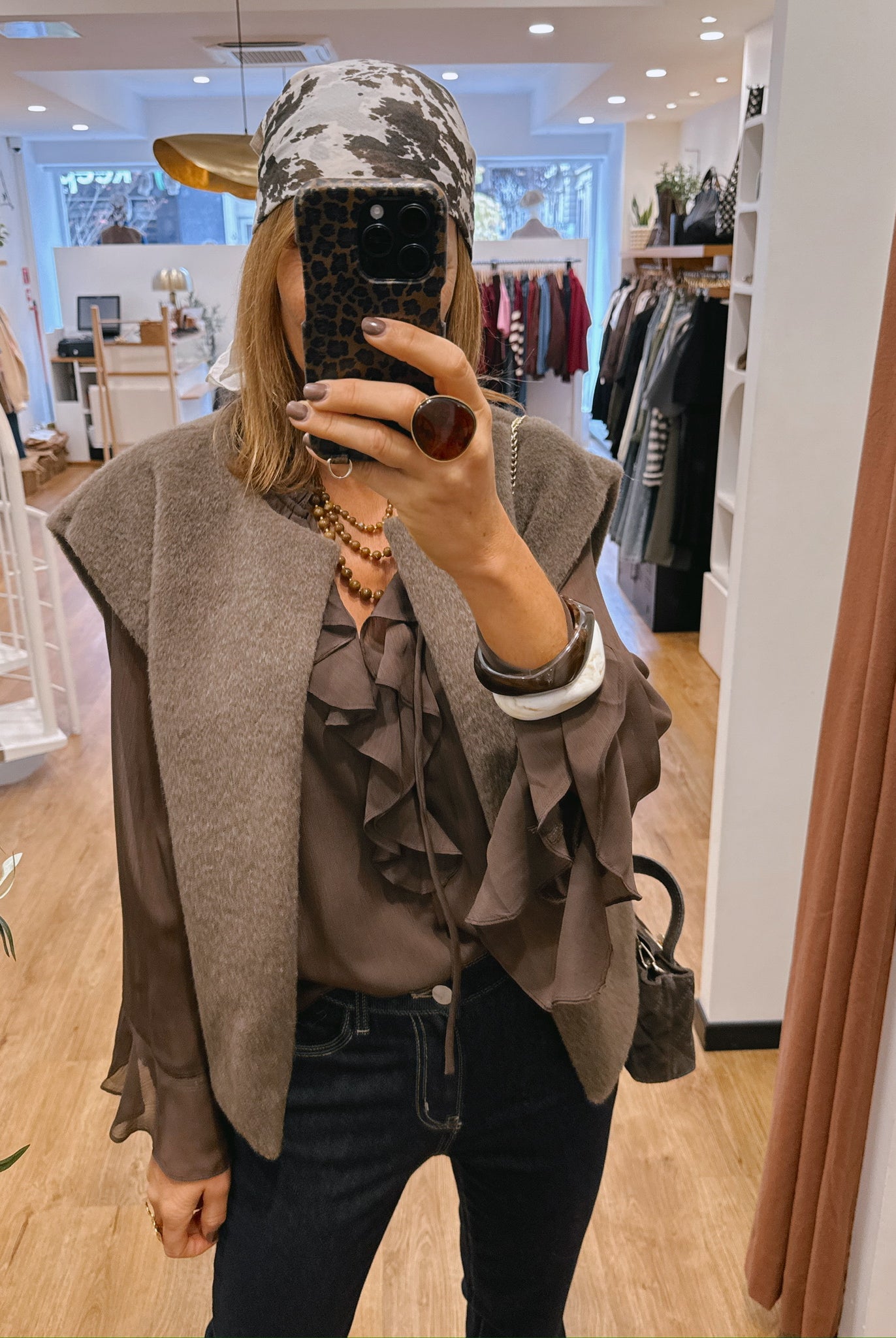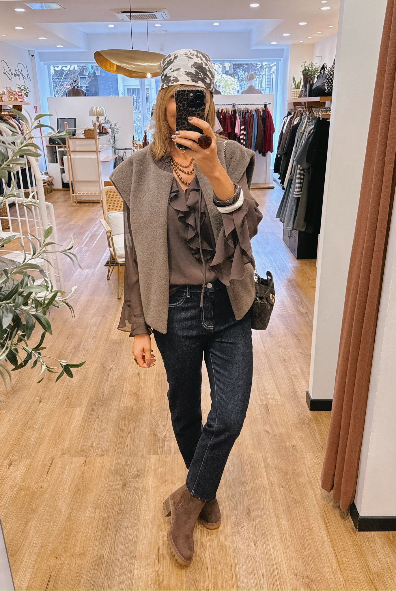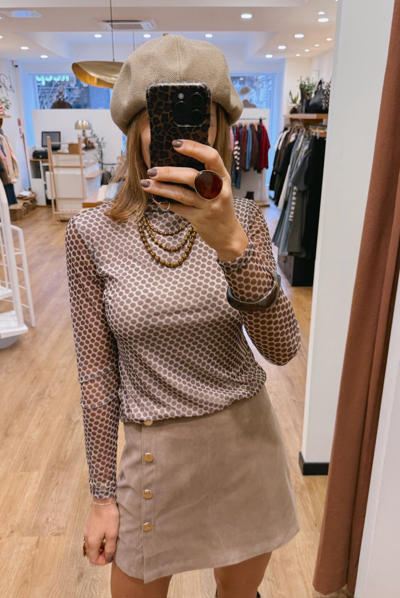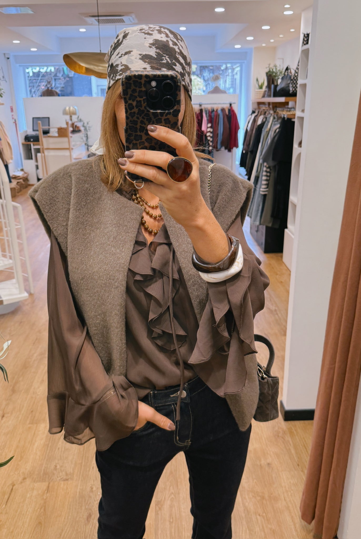 Les looks jouent sur les contrastes : un pull oversize associé à une jupe aérienne, un tailleur en suédine relevé d’un béret, ou encore une blouse fluide qui danse au vent sur un denim parfaitement coupé.