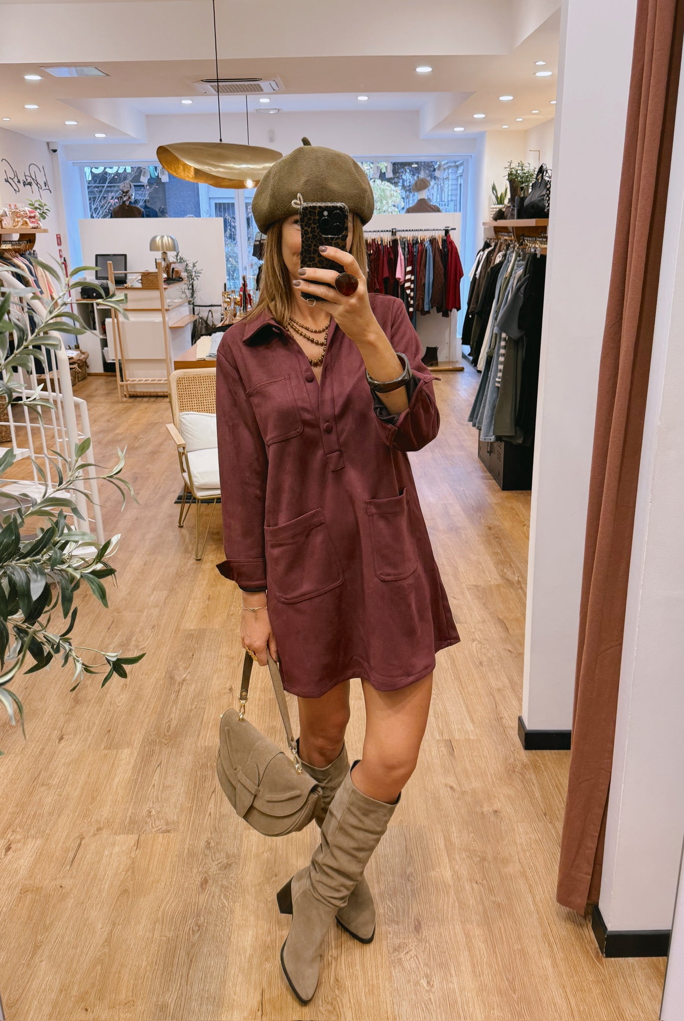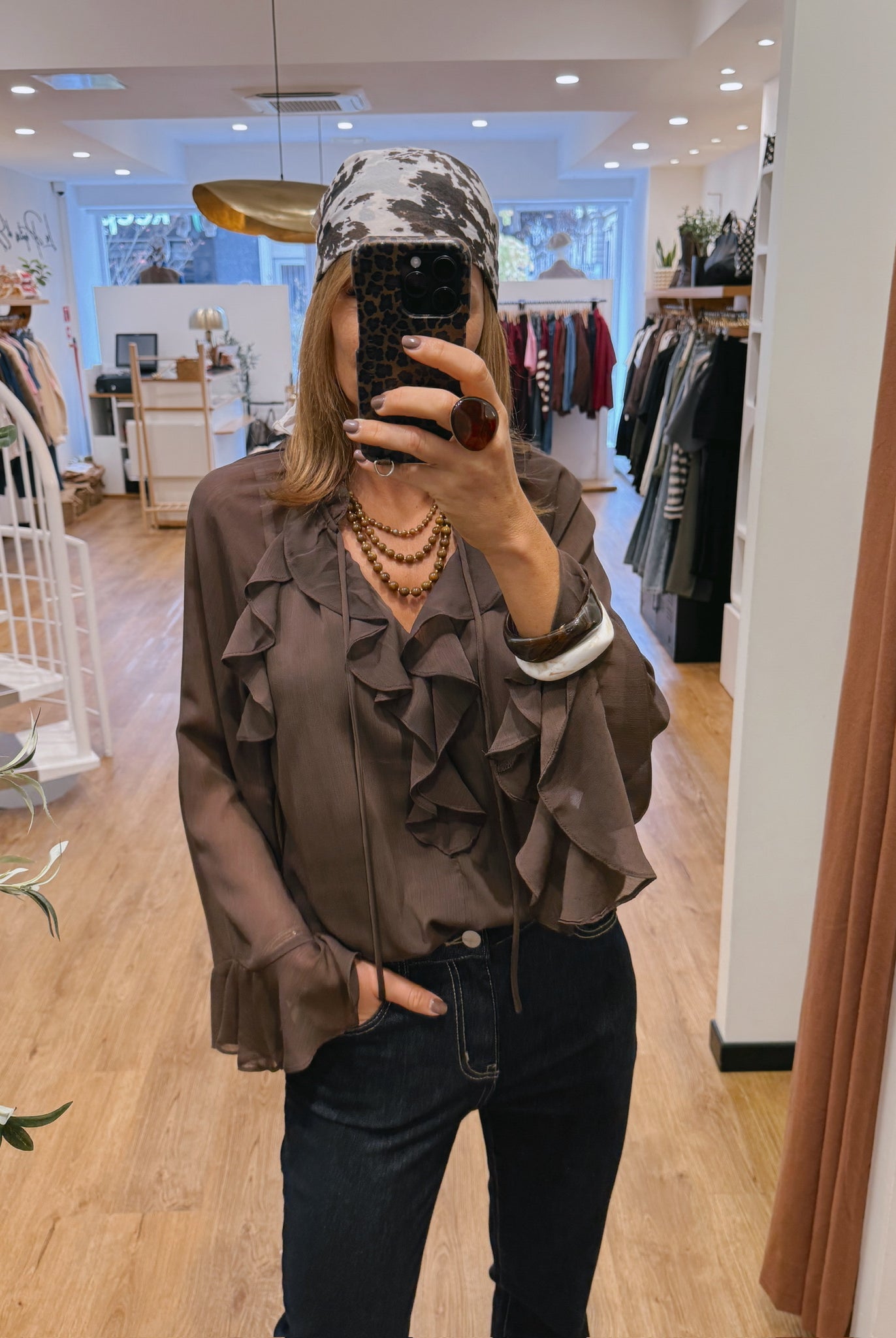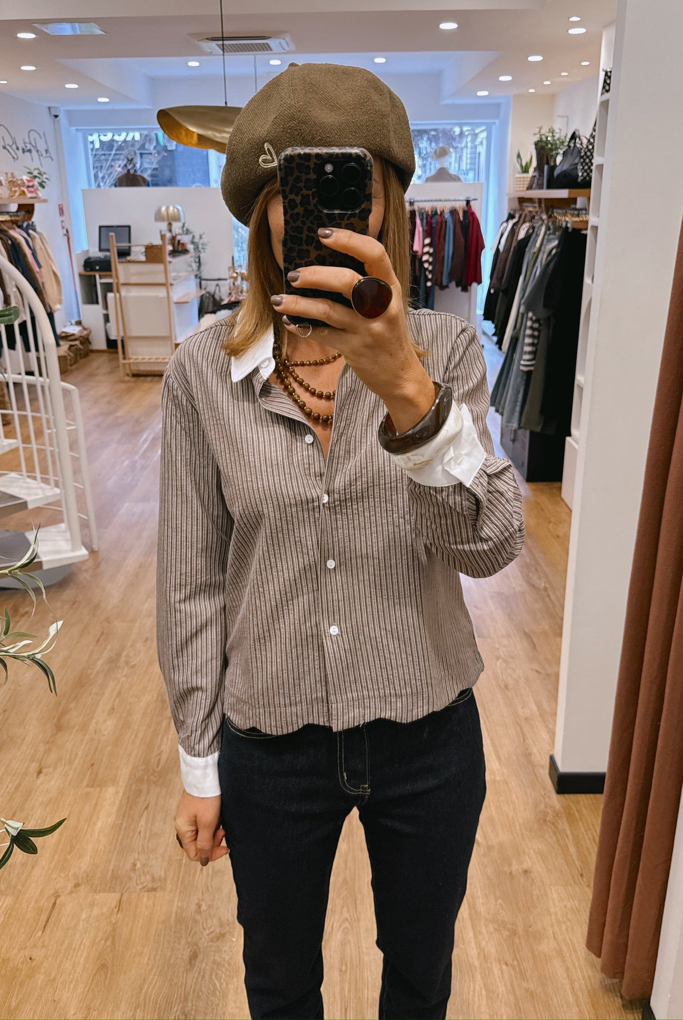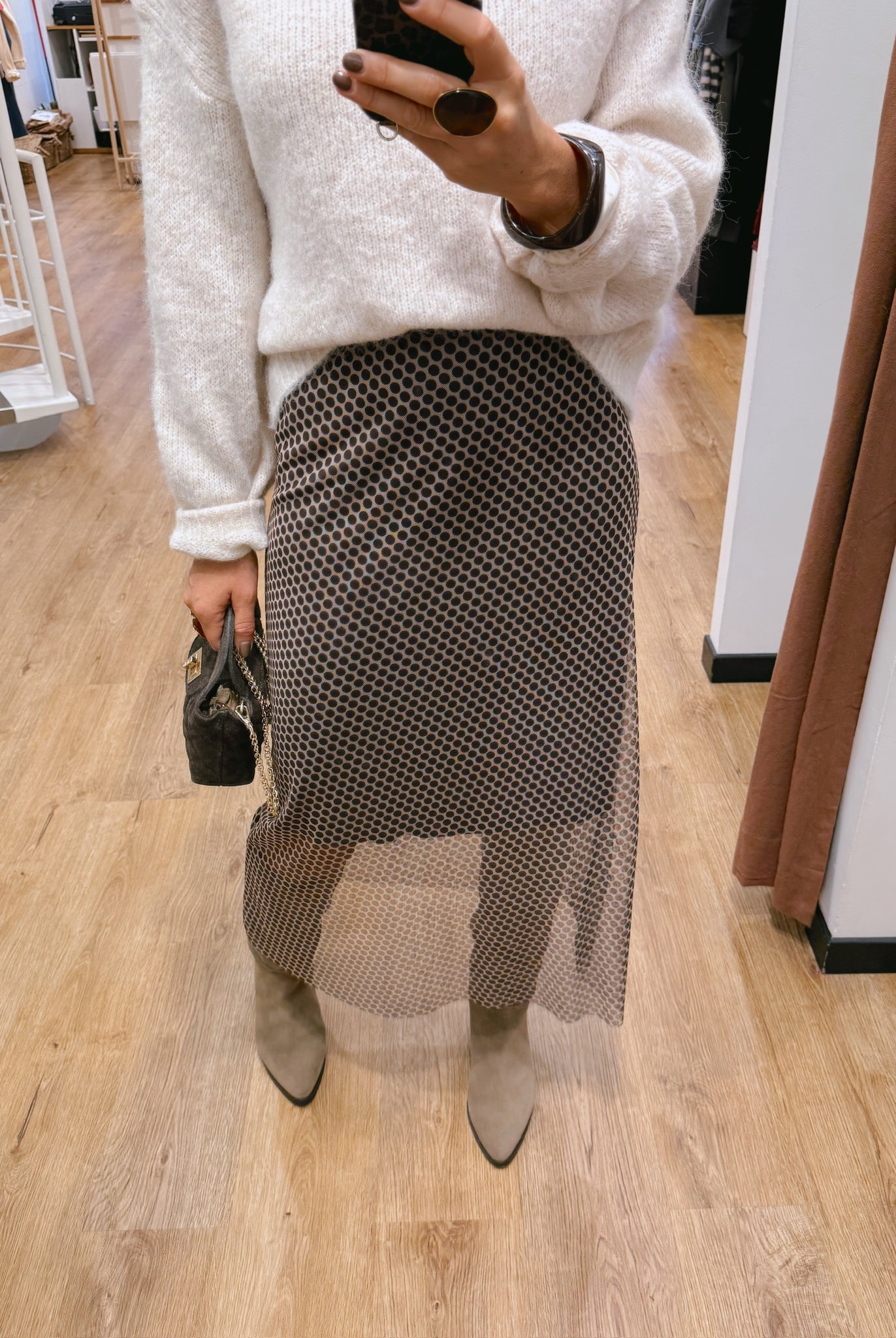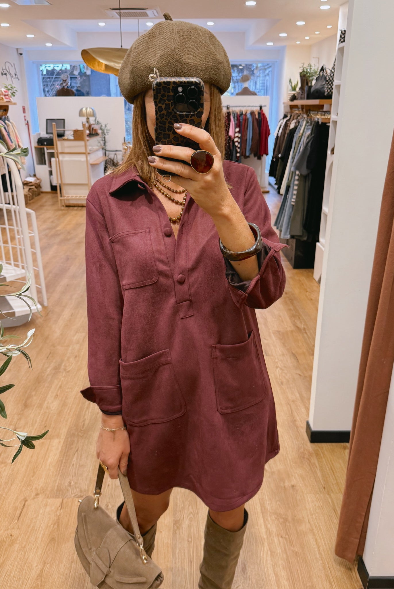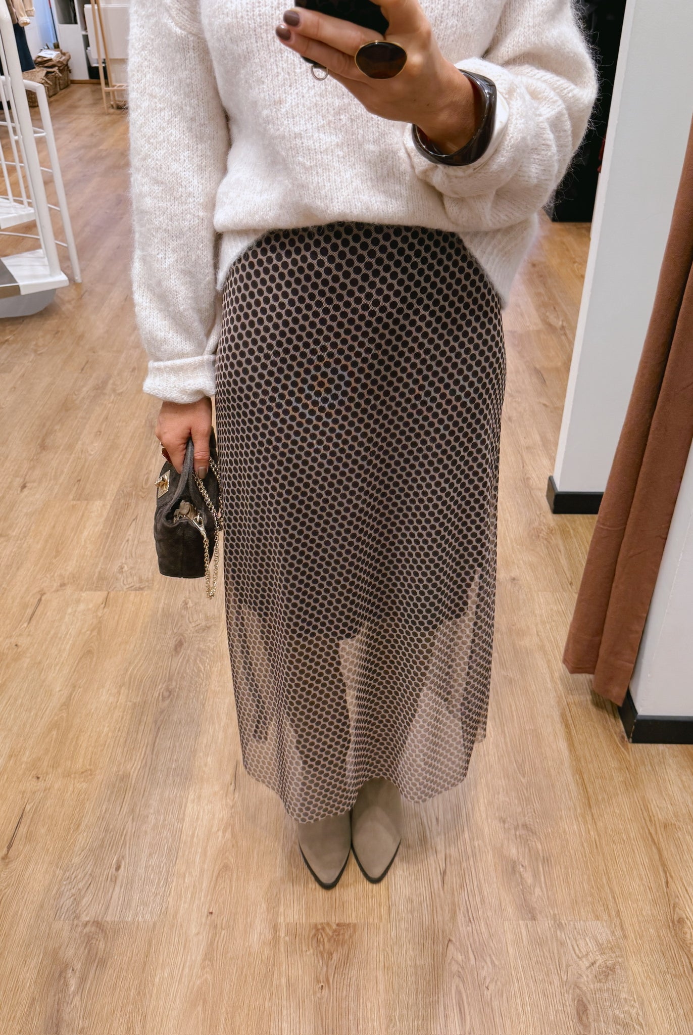 Les looks jouent sur les contrastes : un pull oversize associé à une jupe aérienne, un tailleur en suédine relevé d’un béret, ou encore une blouse fluide qui danse au vent sur un denim parfaitement coupé.