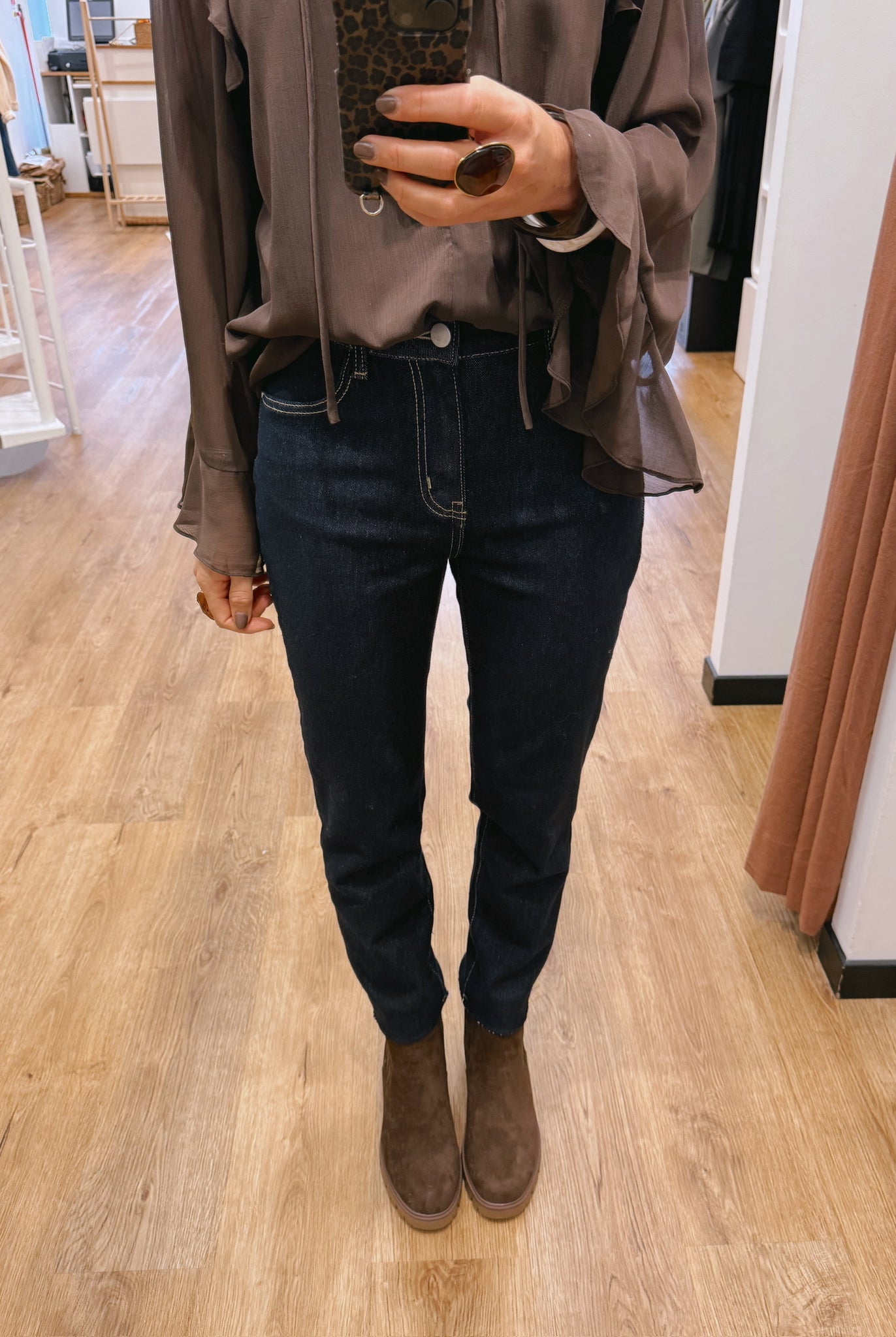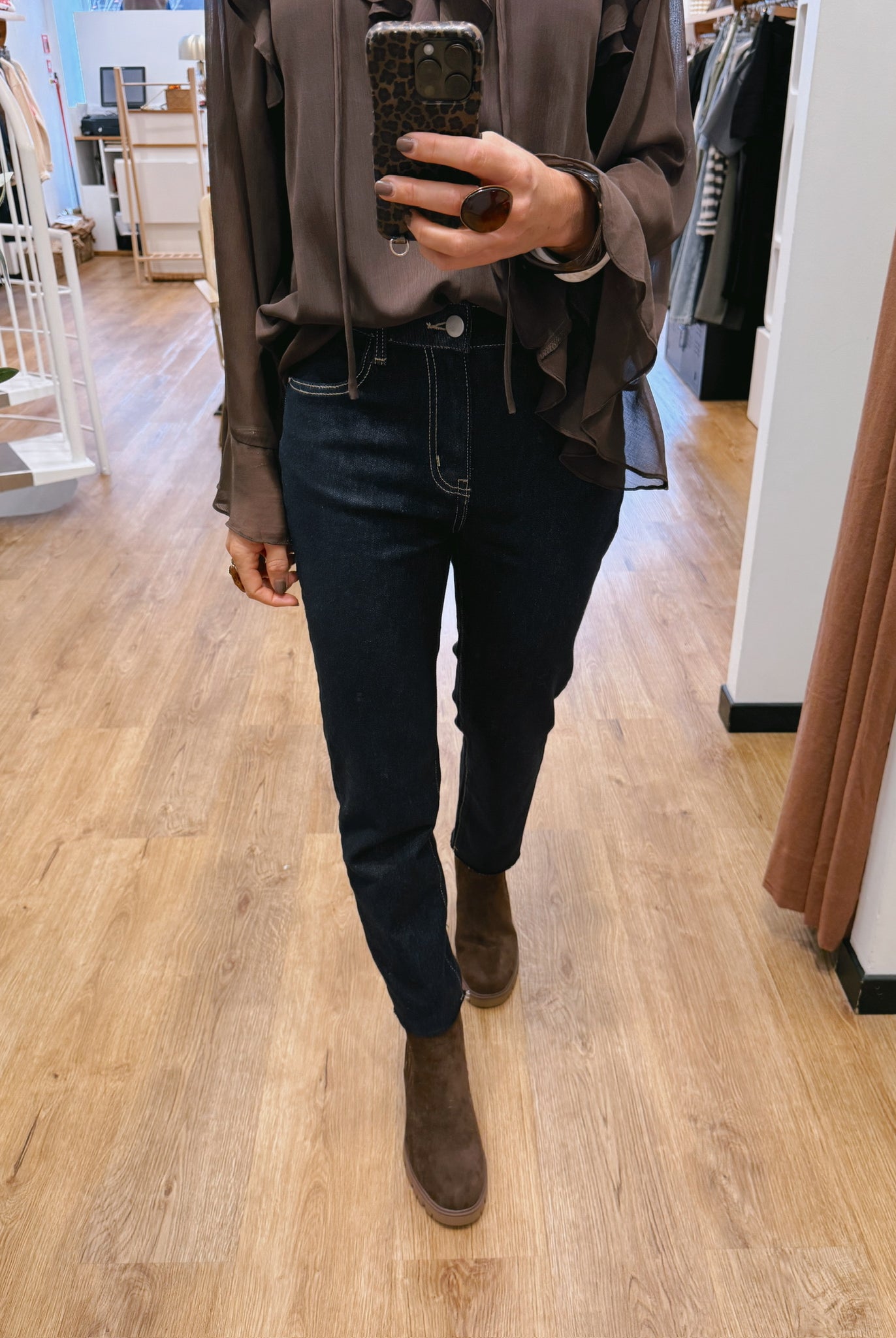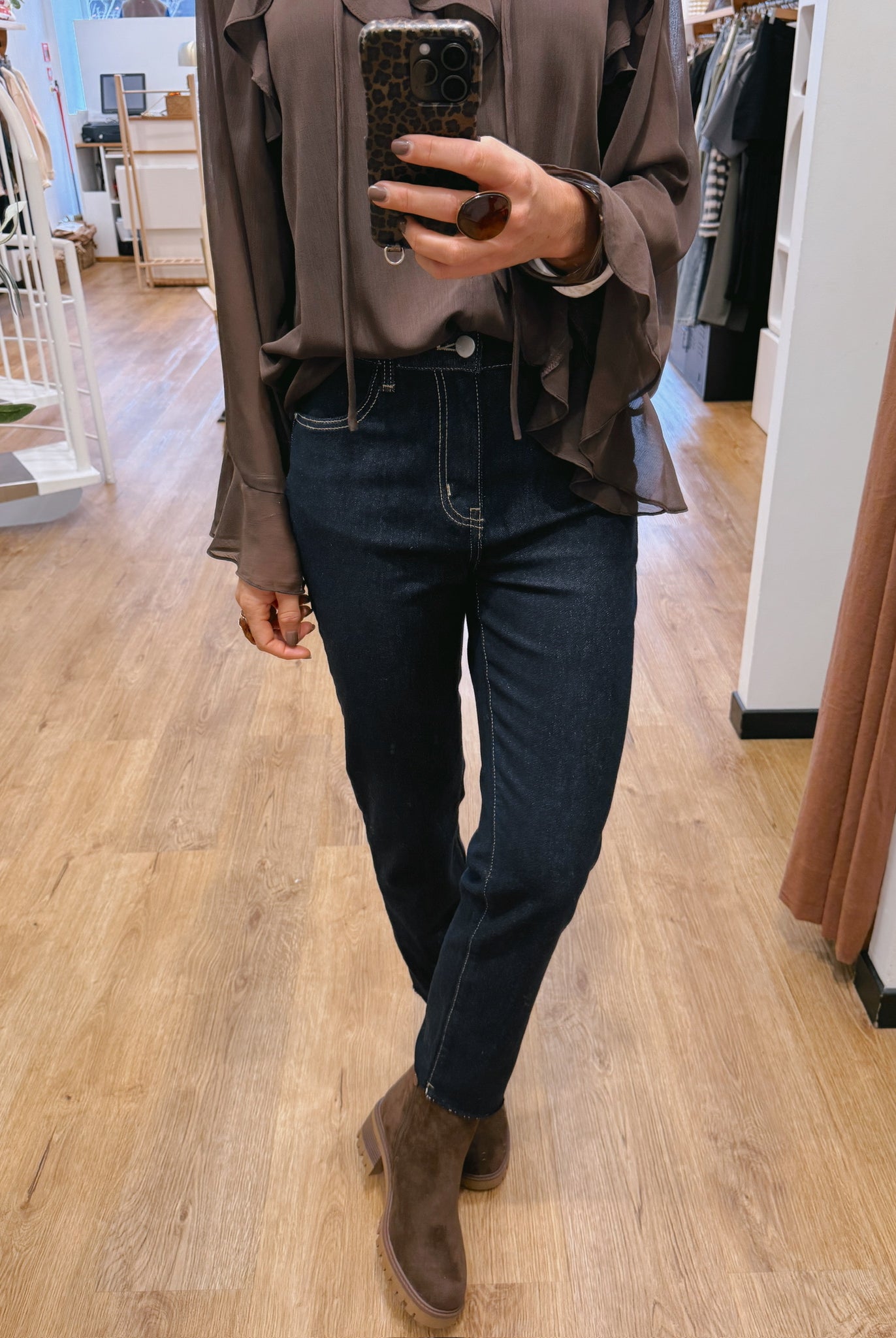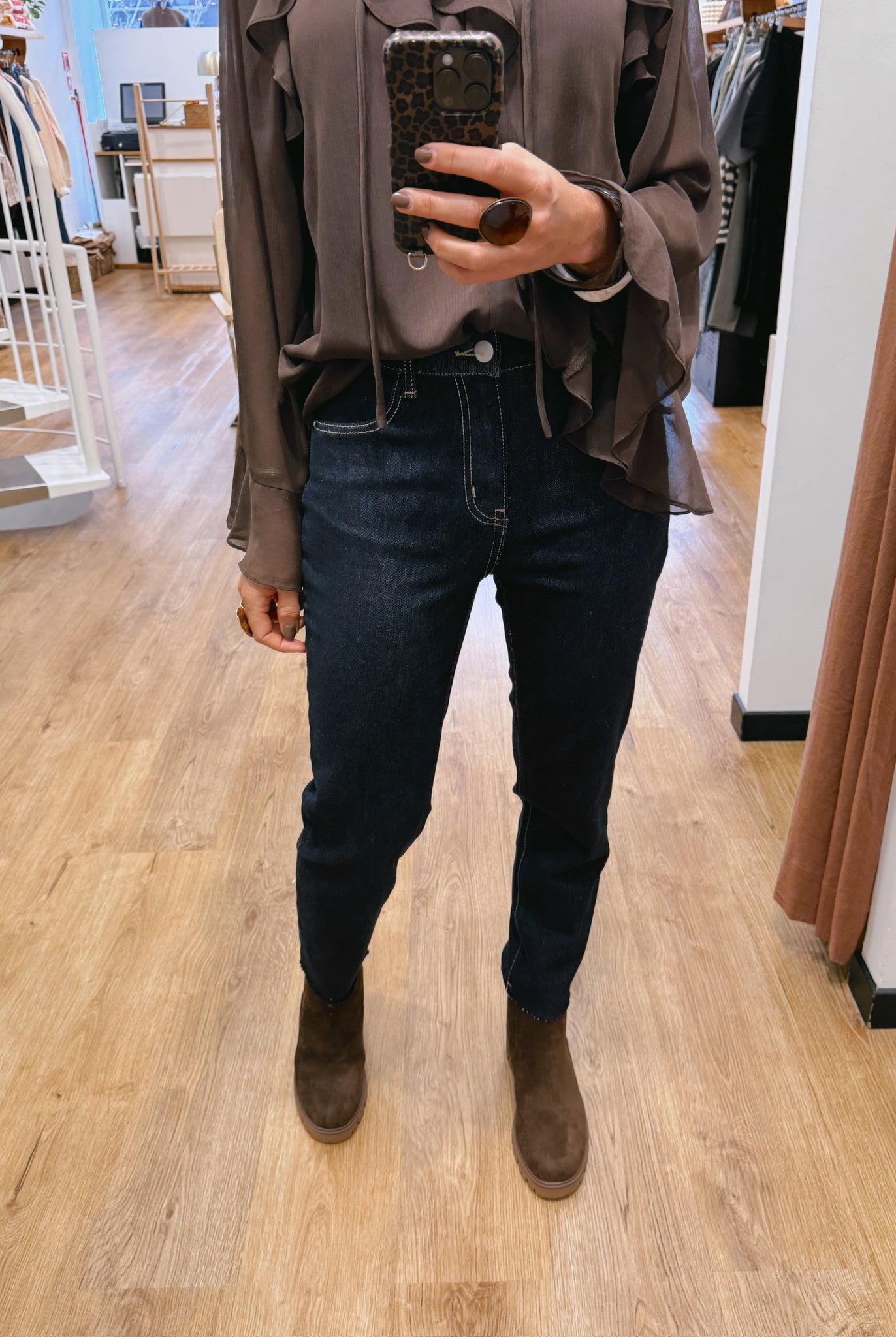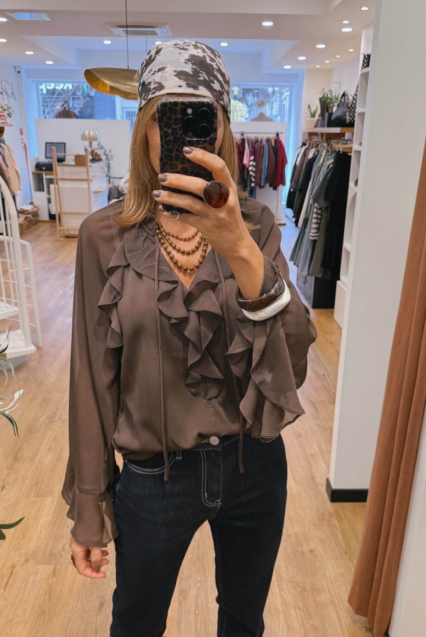 Les looks jouent sur les contrastes : un pull oversize associé à une jupe aérienne, un tailleur en suédine relevé d’un béret, ou encore une blouse fluide qui danse au vent sur un denim parfaitement coupé.