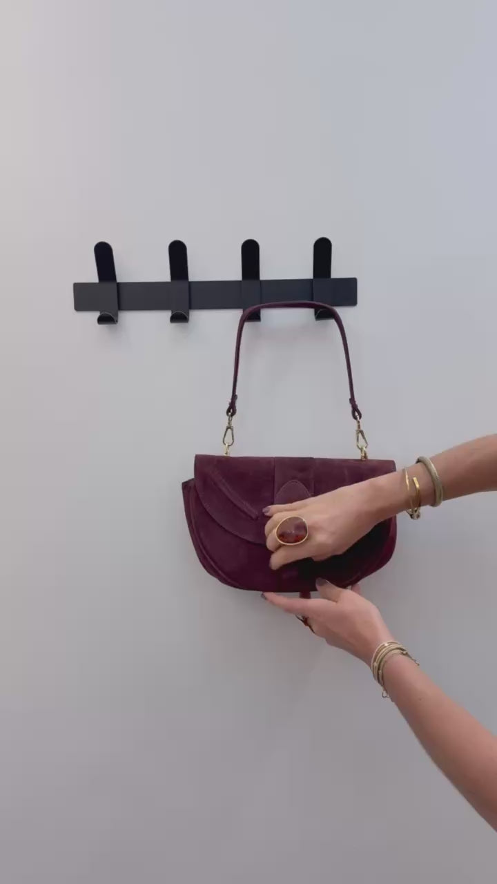 Élégant et intemporel, ce sac en cuir suédé bordeaux allie raffinement et praticité. Confectionné dans une matière douce et texturée, il se distingue par sa silhouette arrondie et son rabat structuré avec une patte centrale décorative.