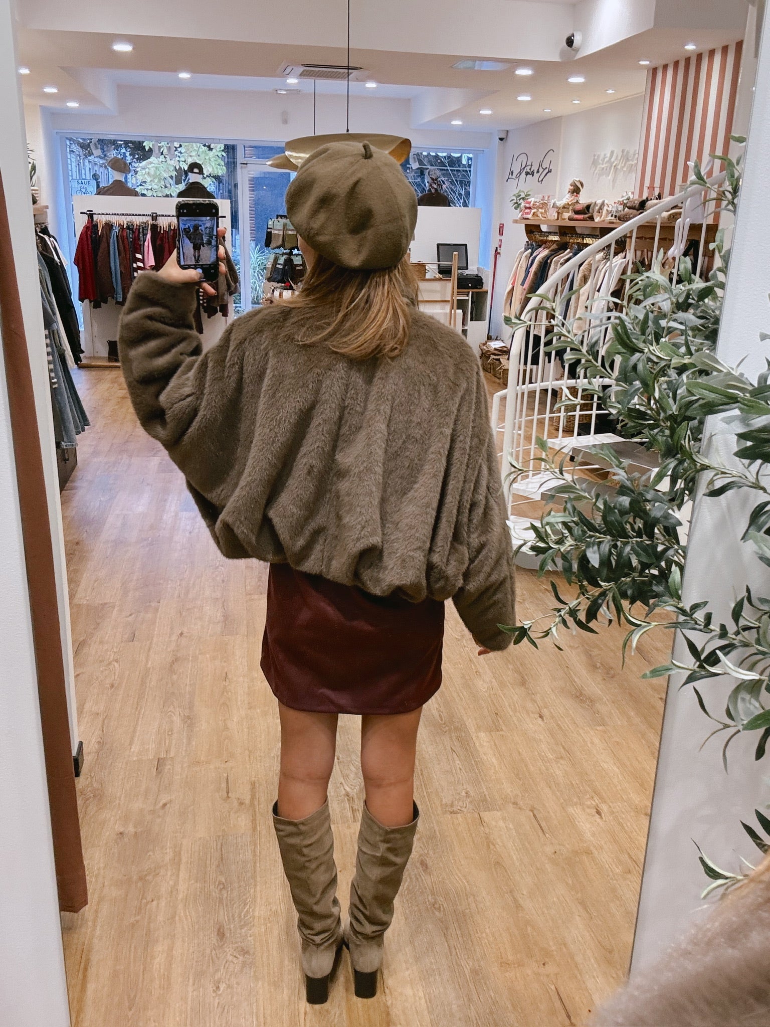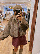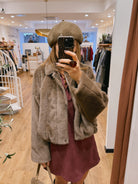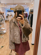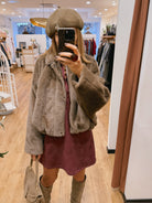 Douce, chaude et élégante, elle se distingue par sa coupe légèrement oversize et ses manches chauve-souris et sa texture fausse fourrure ultra confortable.
