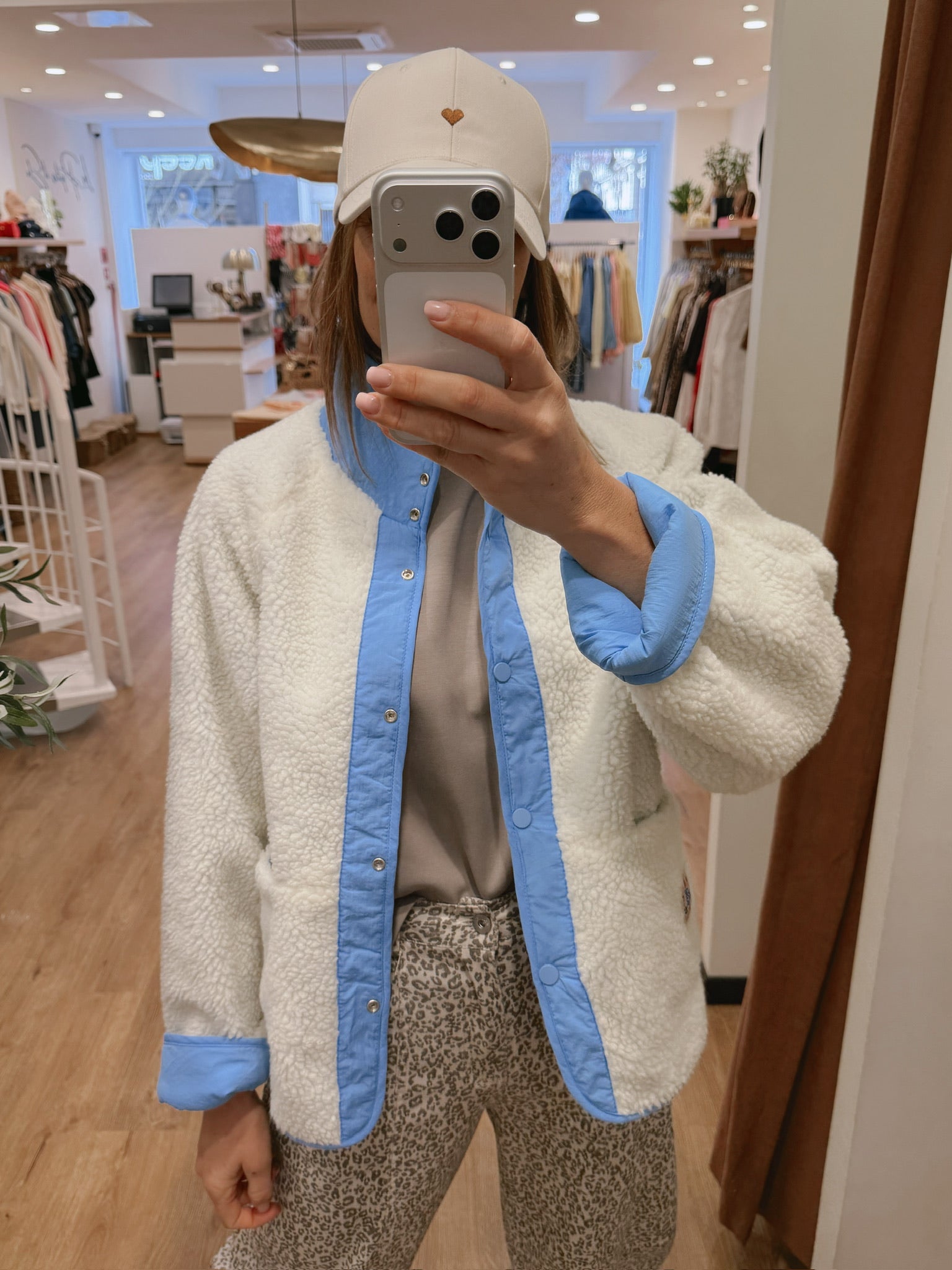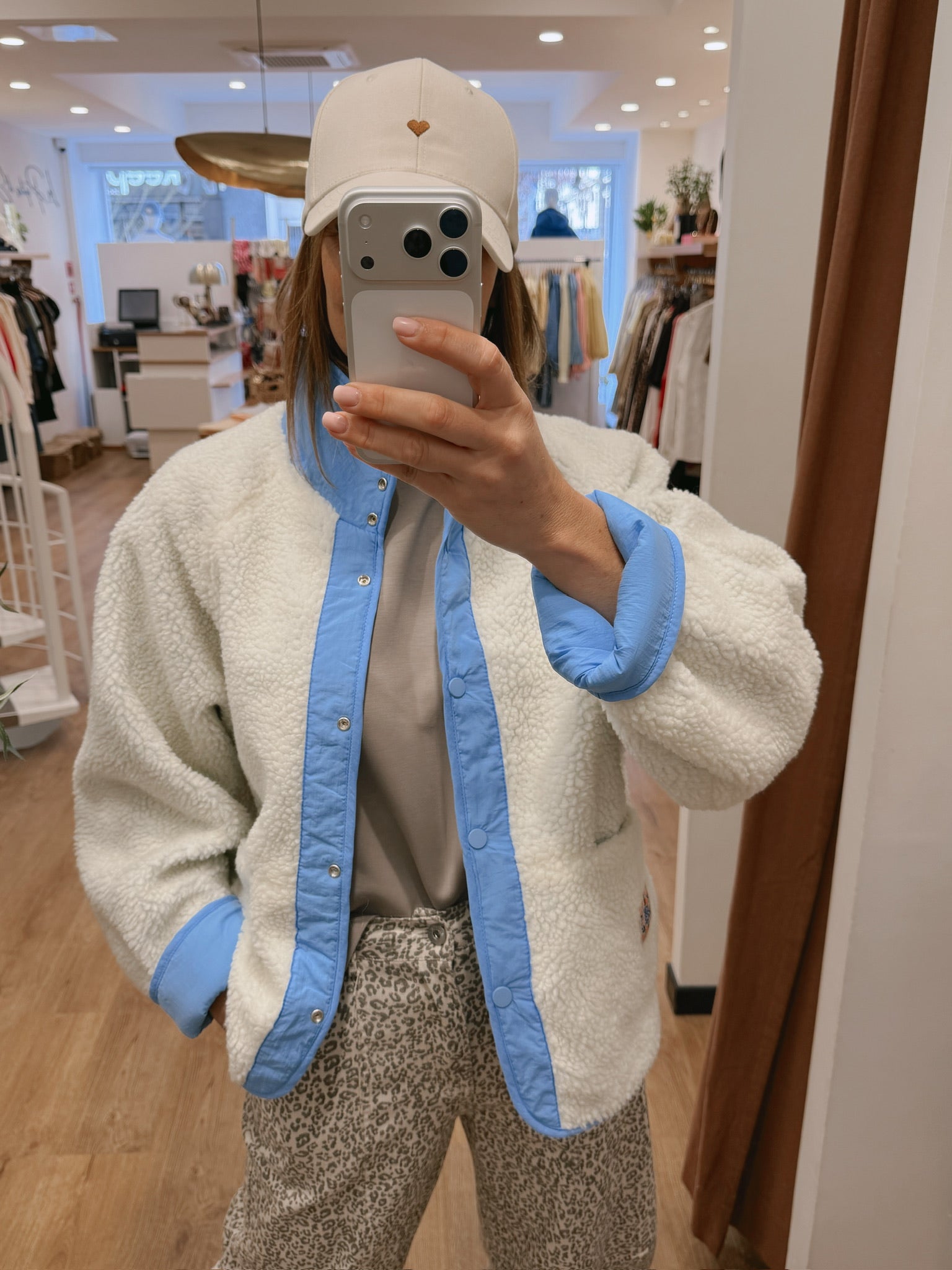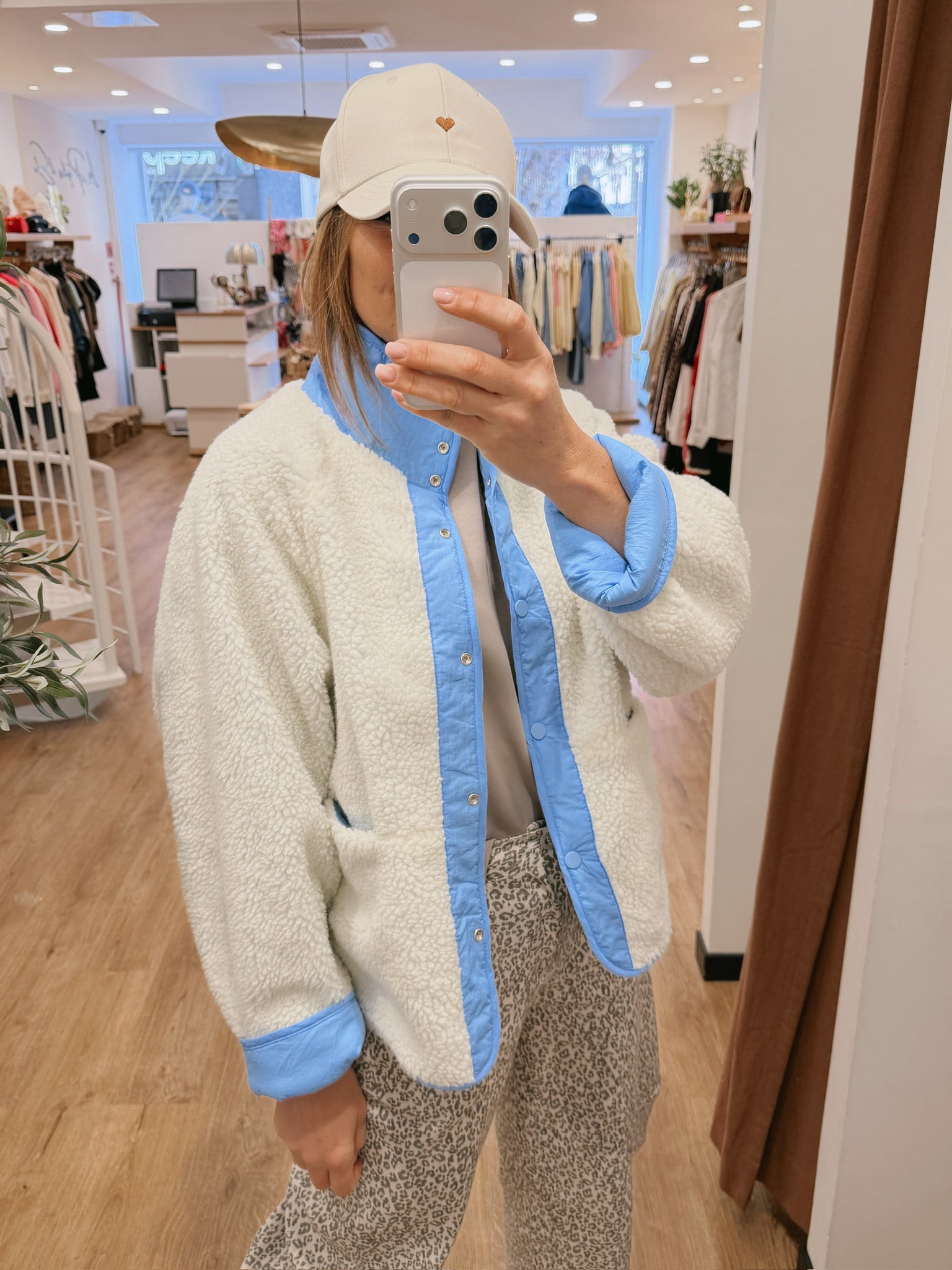 Veste réversible : une face teddy écru / une face lisse bleu