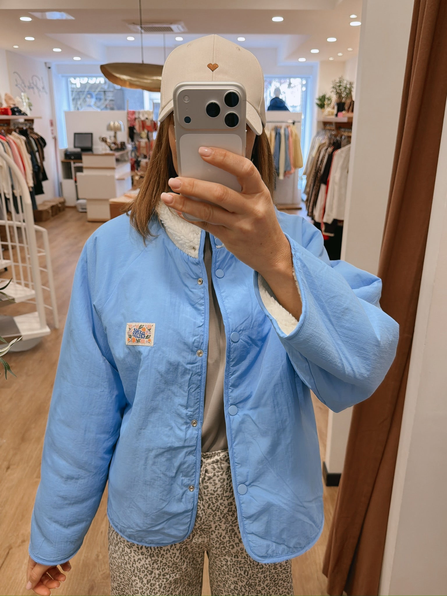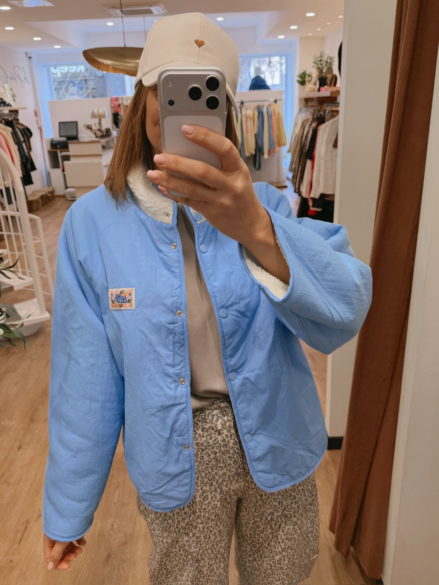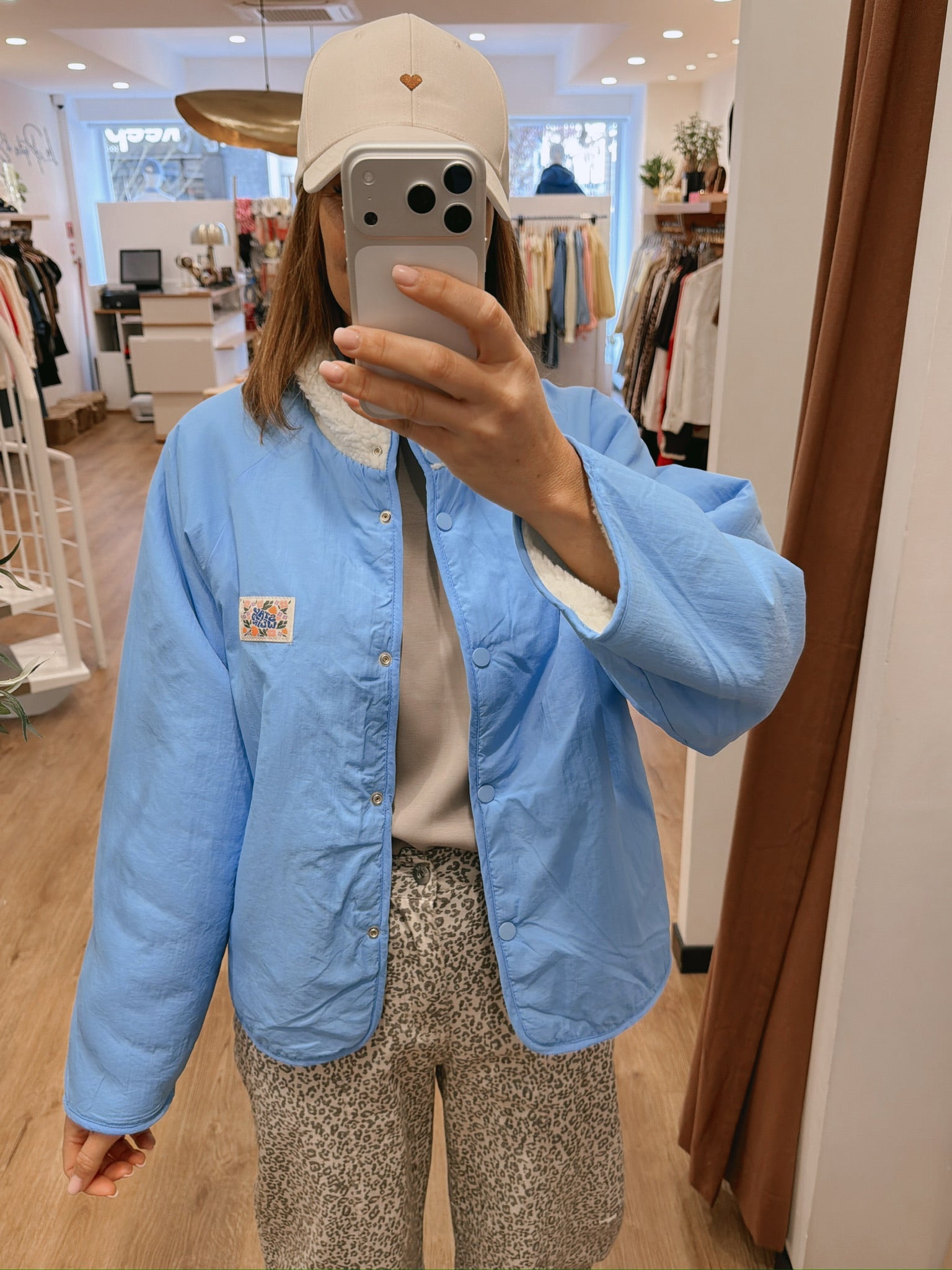 Veste réversible : une face teddy écru / une face lisse bleu