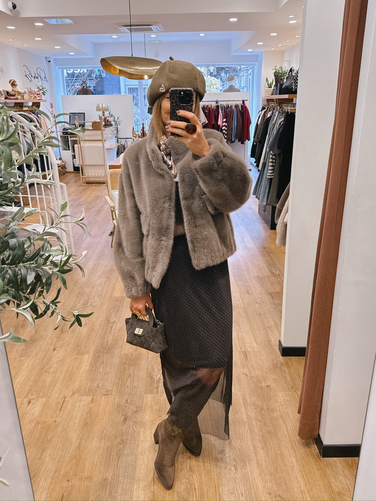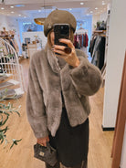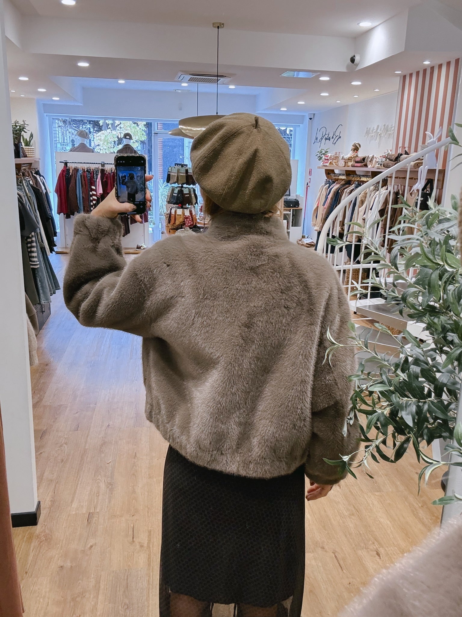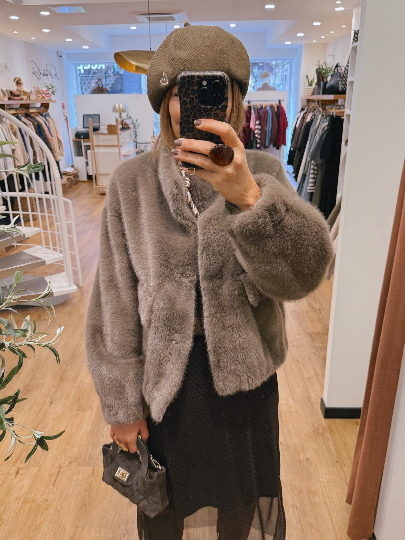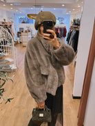 Sa matière effet fourrure apporte chaleur et élégance à toutes vos tenues. Sa coupe légèrement oversize et les fermetures crochets à l’avant lui donnent une allure moderne et féminine. Facile à assortir, elle se porte aussi bien avec une jupe qu’un jean pour un look chic et cosy.